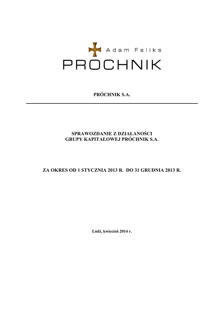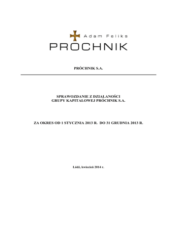 PRÓCHNIK S.A. SPRAWOZDANIE Z DZIAŁANOŚCI GRUPY KAPITAŁOWEJ PRÓCHNIK S.A. ZA OKRES OD 1 STYCZNIA 2013 R. DO 31 GRUDNIA 2013 R. Łódź, kwiecień 2014 r. Spis treści 1. Informacje podstawowe ......................................................................................................... 4 2. Omówienie podstawowych wielkości ekonomiczno-finansowych, ujawnionych w rocznym sprawozdaniu finansowym, w szczególności opis czynników i zdarzeń, w tym o nietypowym charakterze, mających znaczący wpływ na działalność Emitenta i osiągnięte przez niego zyski lub poniesione straty w roku obrotowym, a także omówienie perspektyw rozwoju działalności Emitenta przynajmniej w najbliższym roku obrotowym. .......................................................... 5 3. Opis istotnych czynników ryzyka i zagrożeń, z określeniem, w jakim stopniu Emitent jest na nie narażony. .......................................................................................................................... 8 4. Wskazanie postępowań toczących się przed sądem, organem właściwym dla postępowania arbitrażowego lub organem administracji publicznej. ............................................................. 10 5. Informacje o podstawowych produktach, towarach lub usługach wraz z ich określeniem wartościowym i ilościowym oraz udziałem poszczególnych produktów, towarów i usług (jeżeli są istotne) albo ich grup w sprzedaży Emitenta ogółem, a także zmianach w tym zakresie w danym roku obrotowym ......................................................................................... 10 6. Informacje o rynkach zbytu, z uwzględnieniem podziału na rynki krajowe i zagraniczne, oraz informacje o źródłach zaopatrzenia w materiały do produkcji, w towary i usługi, z określeniem uzależnienia od jednego lub więcej odbiorców i dostawców. ............................. 11 7. Informacje o zawartych umowach znaczących dla działalności Emitenta, w tym znanych Emitentowi umowach zawartych pomiędzy akcjonariuszami (wspólnikami), umowach ubezpieczenia, współpracy lub kooperacji. .............................................................................. 12 8. Informacje o powiązaniach organizacyjnych lub kapitałowych Emitenta z innymi podmiotami oraz określenie jego głównych inwestycji krajowych i zagranicznych (papiery wartościowe, instrumenty finansowe, wartości niematerialne i prawne oraz nieruchomości), w tym inwestycji kapitałowych dokonanych poza grupą jednostek powiązanych oraz opis metod ich finansowania. ...................................................................................................................... 14 9. Informacje o istotnych transakcjach zawartych przez Emitenta lub jednostkę od niego zależną z podmiotami powiązanymi na innych warunkach niż rynkowe, wraz z ich kwotami oraz informacjami określającymi charakter tych transakcji. .................................................... 15 10. Informacje o zaciągniętych i wypowiedzianych w danym roku obrotowym umowach dotyczących kredytów i pożyczek, z podaniem co najmniej ich kwoty, rodzaju i wysokości stopy procentowej, waluty i terminu wymagalności. ............................................................... 15 11. Informacje o udzielonych w danym roku obrotowym pożyczkach, ze szczególnym uwzględnieniem pożyczek udzielonych jednostkom powiązanym Emitenta, z podaniem co najmniej ich kwoty, rodzaju i wysokości stopy procentowej, waluty i terminu wymagalności. .................................................................................................................................................. 16 12. Informacje o udzielonych i otrzymanych w danym roku obrotowym poręczeniach i gwarancjach, ze szczególnym uwzględnieniem poręczeń i gwarancji udzielonych jednostkom powiązanym Emitenta. ............................................................................................................. 16 13. Objaśnienie różnic pomiędzy wynikami finansowymi wykazanymi w raporcie rocznym a wcześniej publikowanymi prognozami wyników na dany rok. ............................................... 17 14. Ocena, wraz z jej uzasadnieniem, dotyczącą zarządzania zasobami finansowymi, ze szczególnym uwzględnieniem zdolności wywiązywania się z zaciągniętych zobowiązań, oraz określenie ewentualnych zagrożeń i działań, jakie Emitent podjął lub zamierza podjąć w celu przeciwdziałania tym zagrożeniom. ......................................................................................... 17 2 15. Ocena, możliwości realizacji zamierzeń inwestycyjnych, w tym inwestycji kapitałowych, w porównaniu do wielkości posiadanych środków, z uwzględnieniem możliwych zmian w strukturze finansowania tej działalności. ................................................................................. 18 16. Ocena czynników i nietypowych zdarzeń mających wpływ na wynik z działalności za rok obrotowy, z określeniem stopnia wpływu tych czynników lub nietypowych zdarzeń na osiągnięty wynik. ..................................................................................................................... 18 17. Charakterystyka zewnętrznych i wewnętrznych czynników istotnych dla rozwoju przedsiębiorstwa Emitenta oraz opis perspektyw rozwoju działalności Emitenta co najmniej do końca roku obrotowego następującego po roku obrotowym, za który sporządzono sprawozdanie finansowe zamieszczone w raporcie rocznym, z uwzględnieniem elementów strategii rynkowej przez niego wypracowanej. ........................................................................ 18 18. Zmiany w podstawowych zasadach zarządzania przedsiębiorstwem Emitenta i jego Grupą Kapitałową. ................................................................................................................... 19 19. Wszelkie umowy zawarte między Emitentem a osobami