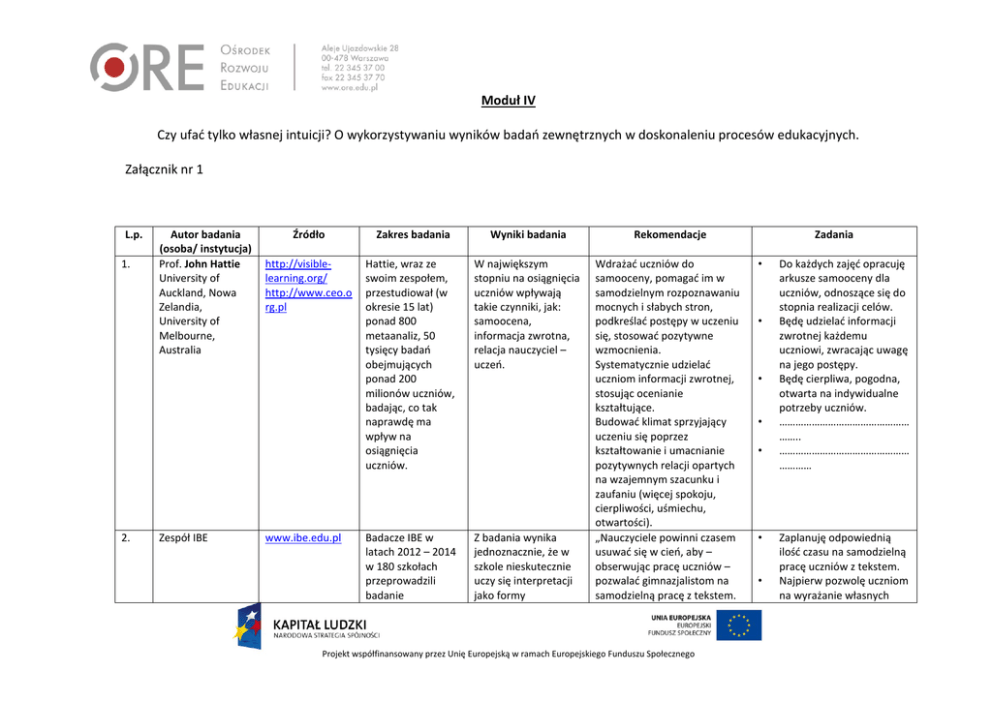 Moduł IV Czy ufać tylko własnej intuicji? O wykorzystywaniu wyników badań zewnętrznych w doskonaleniu procesów edukacyjnych. Załącznik nr 1 L.p. 1. 2. Autor badania (osoba/ instytucja) Prof. John Hattie University of Auckland, Nowa Zelandia, University of Melbourne, Australia Zespół IBE Źródło Zakres badania Wyniki badania Rekomendacje http://visiblelearning.org/ http://www.ceo.o rg.pl Hattie, wraz ze swoim zespołem, przestudiował (w okresie 15 lat) ponad 800 metaanaliz, 50 tysięcy badań obejmujących ponad 200 milionów uczniów, badając, co tak naprawdę ma wpływ na osiągnięcia uczniów. W największym stopniu na osiągnięcia uczniów wpływają takie czynniki, jak: samoocena, informacja zwrotna, relacja nauczyciel – uczeń. Badacze IBE w latach 2012 – 2014 w 180 szkołach przeprowadzili badanie Z badania wynika jednoznacznie, że w szkole nieskutecznie uczy się interpretacji jako formy Wdrażać uczniów do samooceny, pomagać im w samodzielnym rozpoznawaniu mocnych i słabych stron, podkreślać postępy w uczeniu się, stosować pozytywne wzmocnienia. Systematycznie udzielać uczniom informacji zwrotnej, stosując ocenianie kształtujące. Budować klimat sprzyjający uczeniu się poprzez kształtowanie i umacnianie pozytywnych relacji opartych na wzajemnym szacunku i zaufaniu (więcej spokoju, cierpliwości, uśmiechu, otwartości). „Nauczyciele powinni czasem usuwać się w cień, aby – obserwując pracę uczniów – pozwalać gimnazjalistom na samodzielną pracę z tekstem. www.ibe.edu.pl Projekt współfinansowany przez Unię Europejską w ramach Europejskiego Funduszu Społecznego Zadania • • • • • • • Do każdych zajęć opracuję arkusze samooceny dla uczniów, odnoszące się do stopnia realizacji celów. Będę udzielać informacji zwrotnej każdemu uczniowi, zwracając uwagę na jego postępy. Będę cierpliwa, pogodna, otwarta na indywidualne potrzeby uczniów. ………………………………………… …….. ………………………………………… ………… Zaplanuję odpowiednią ilość czasu na samodzielną pracę uczniów z tekstem. Najpierw pozwolę uczniom na wyrażanie własnych 3. H. Dumont, D. Instance, F. Benavides „Istota uczenia się. Wykorzystanie wyników badań w praktyce”, Warszawa 2013 „Dydaktyka literatury i języka polskiego w gimnazjum w świetle nowej podstawy programowej.” Objęło ono uczniów wszystkich klas gimnazjum (w sumie 16 886 osób), ale też ich rodziców (16 213), nauczycieli języka polskiego (477), dyrektorów szkół (177) i nauczycieli bibliotekarzy (192). samodzielnego myślenia. Niepokoi również – powszechnie odnotowywany w trakcie badania kłopot uczniów z uzasadnianiem własnych sądów. Autorzy przedstawiają w książce wyniki badań (czołowych badaczy z całego świata) dotyczących zarówno procesu uczenia się, jak również metod i technik stosowanych w szkołach i innych ośrodkach edukacyjnych. „Skuteczne uczenie się to nie działanie wyłącznie indywidualne, ale w gruncie rzeczy rozproszone” (De Corte za Salomon 1993), ponieważ konstruowanie indywidualnej wiedzy zachodzi przez interakcje, negocjacje i współpracę” (De Corte) Ważne jest, by to uczniowie odkryli ścisły związek analizy tekstu z jego interpretacją. Uczeń powinien zatem z jednej strony ośmielić się jako czytelnik, z drugiej strony musi nauczyć się dyscypliny w argumentowaniu i wskazywaniu w tekście dowodów na zasadność proponowanego odczytania. Nauczyciele powinni zezwolić na wyrażanie przez uczniów własnego zdania w akcie interpretacji, ale zarazem powinni od nich wymagać właściwego argumentowania i jasnego przedstawiania swojego stanowiska.” – cyt. Systematycznie organizować w klasie pracę zespołową, podczas której uczniowie będą wspólnie zdobywać wiedzę, rozwiązywać problemy, dyskutować i formułować wnioski, prezentować własne poglądy, świętować sukces zespołu, a każdy z uczniów będzie miał szansę dzielić się swoją wiedzą z innymi, korzystać z doświadczeń innych, wyrażać i uzasadniać swoje sądy, świętować indywidualny sukces. • • • • • • Projekt współfinansowany przez Unię Europejską w ramach Europejskiego Funduszu Społecznego interpretacji i przekonań (nawet odmiennych od moich); postaram się w każdej wypowiedzi (nawet odbiegającej od sedna) znaleźć coś dobrego. Będę motywować uczniów do pełnego argumentowania swoich sądów. ………………………………………… … Zaplanuję zajęcia tak, aby uczniowie jak najczęściej uczyli się w toku pracy zespołowej. W ramach doskonalenia przestudiuję zasady efektywnej pracy zespołowej. Dokładnie przemyślę i zaplanuję zadania dla zespołów tak, aby uczniowie mogli badać, dyskutować, negocjować, formułować wnioski, prezentować efekty pracy. Zadbam, aby każdy z 4. 5. McKinsey & Company R. J. Marzano „Jak najlepiej doskonalone systemy szkolne na świecie stają się jeszcze lepsze” „Sztuka i teoria skutecznego nauczania”, Centrum Edukacji Obywatelskiej, Warszawa 2012 Autorzy raportu analizowali reformy w wybranych systemach oświatowych na świecie, które wykazują stałą i znaczącą poprawę wyników nauczania. Wskazali podobieństwa i różnice we wprowadzanych przez te systemy zmianach, zarysowali uniwersalny wzorzec podejmowanych działań. Budowaniu faktycznej jakości pracy szkoły sprzyja praktyka współpracy, oznaczająca nauczycieli i liderów szkół wspólnie pracujących nad skutecznymi metodami dydaktycznymi, śledzących, co się faktycznie sprawdza w klasie, podchodzących do tego ze szczególną uwagą i zaangażowaniem, dążących do poprawy praktyki nauczycielskiej – nie tylko własnej, ale i innych. Zadania dla uczestników Autor, jeden z Wspieranie wysiłków najsłynniejszych sprawia między amerykańskich innymi, że uczniowie ekspertów, próbuje widzą bezpośredni u
