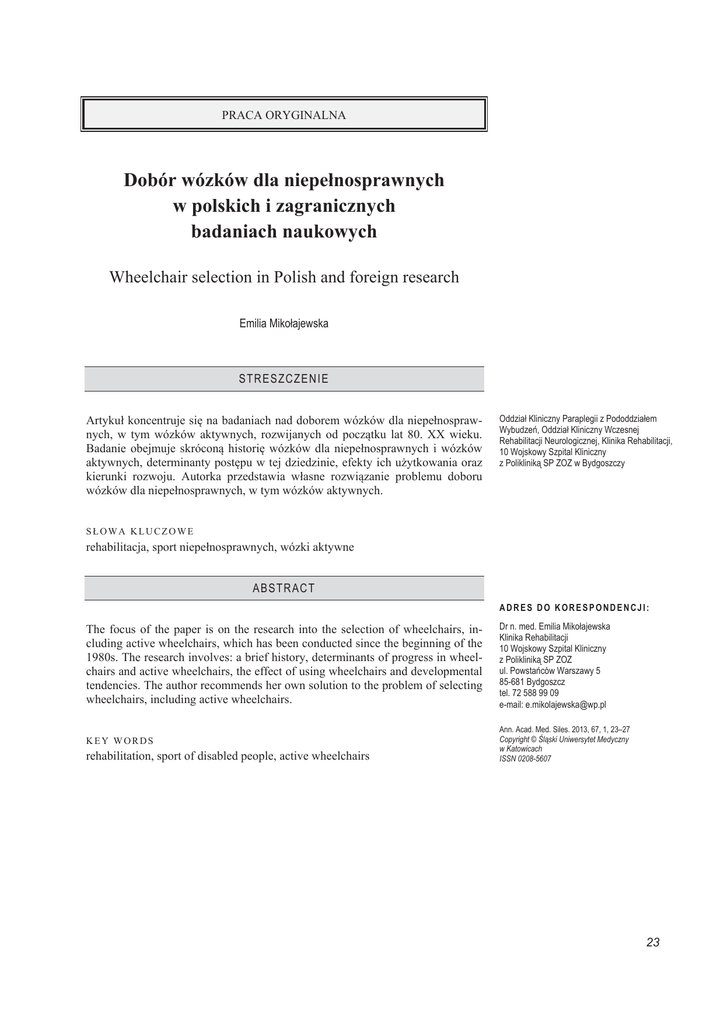 PRACA ORYGINALNA Dobór wózków dla niepeánosprawnych w polskich i zagranicznych badaniach naukowych Wheelchair selection in Polish and foreign research Emilia Mikoáajewska STR ESZCZ EN I E Artykuá koncentruje siĊ na badaniach nad doborem wózków dla niepeánosprawnych, w tym wózków aktywnych, rozwijanych od początku lat 80. XX wieku. Badanie obejmuje skróconą historiĊ wózków dla niepeánosprawnych i wózków aktywnych, determinanty postĊpu w tej dziedzinie, efekty ich uĪytkowania oraz kierunki rozwoju. Autorka przedstawia wáasne rozwiązanie problemu doboru wózków dla niepeánosprawnych, w tym wózków aktywnych. Oddziaá Kliniczny Paraplegii z Pododdziaáem WybudzeĔ, Oddziaá Kliniczny Wczesnej Rehabilitacji Neurologicznej, Klinika Rehabilitacji, 10 Wojskowy Szpital Kliniczny z Polikliniką SP ZOZ w Bydgoszczy SàOWA KLUCZOWE rehabilitacja, sport niepeánosprawnych, wózki aktywne ABSTRACT ADRES DO KORESPONDENCJI: The focus of the paper is on the research into the selection of wheelchairs, including active wheelchairs, which has been conducted since the beginning of the 1980s. The research involves: a brief history, determinants of progress in wheelchairs and active wheelchairs, the effect of using wheelchairs and developmental tendencies. The author recommends her own solution to the problem of selecting wheelchairs, including active wheelchairs. Dr n. med. Emilia Mikoáajewska Klinika Rehabilitacji 10 Wojskowy Szpital Kliniczny z Polikliniką SP ZOZ ul. PowstaĔców Warszawy 5 85-681 Bydgoszcz tel. 72 588 99 09 e-mail: [email protected] KEY WORDS Ann. Acad. Med. Siles. 2013, 67, 1, 2– Copyright © ĝląski Uniwersytet Medyczny w Katowicach ISSN 0208-5607 rehabilitation, sport of disabled people, active wheelchairs 23 $11$/(6$&$'(0,$(0(',&$(6,/(6,(16,6 WPROWADZENIE Wózek stanowi jeden z podstawowych elementów zaopatrzenia ortopedycznego (rehabilitacyjnego) osób niepeánosprawnych, a takĪe, na staáe lub czasowo, osób ciĊĪko chorych i w podeszáym wieku. Liczba uĪytkowników wózków jest zatem duĪa, gdyĪ liczbĊ osób niepeánosprawnych szacuje siĊ na ok. 10–15% populacji, a osób w podeszáym wieku nawet na 20– –30% populacji krajów rozwiniĊtych. Obecnie liczbĊ obywateli naszego kraju trwale wykorzystujących wózek inwalidzki szacuje siĊ na co najmniej 100 tys. osób, a wszystkich uĪytkowników wózków – nawet na 400 tys. osób. Mimo Īe pierwsze prototypy wózków pojawiáy siĊ ok. 500 r. p.n.e., a w czasach nowoĪytnych, począwszy od XVI w., nastąpiá znaczny postĊp w tej dziedzinie, to wózek aktywny, uáatwiający zachowanie samodzielnoĞci oraz aktywnoĞci edukacyjnej, zawodowej i spoáecznej, zostaá po raz pierwszy zaprezentowany dopiero w latach 80. XX w. [1,2,3,4]. Wózek przestaá byü postrzegany jako fotel na kóákach dopiero w drugiej poáowie XX w., kiedy uznano go takĪe za Ğrodek sáuĪący zwiĊkszeniu moĪliwoĞci lokomocyjnych uĪytkownika oraz zapewnieniu podparcia ciaáa i bezpieczeĔstwa [5,6,7]. Wózki aktywne są stosowane coraz czĊĞciej i w znacznym stopniu nadają okreĞleniu „osoba niepeánosprawna” nowe znaczenie, gdyĪ to wáaĞnie osoby wykorzystujące wózki aktywne są najbardziej widoczne w naszym otoczeniu, poza wáasnym domem i szpitalem. Osoby te – mimo braku lub ograniczenia zdolnoĞci motorycznych w obrĊbie koĔczyn dolnych – mogą dziĊki korzystaniu z wózka podejmowaü aktywnoĞü edukacyjną, zawodową, sportową czy spoáeczną. NaleĪy mieü równieĪ na uwadze, Īe ww. ograniczenia czĊsto dotykają równieĪ dzieci i máodzieĪ w wieku szkolnym. Jednak to nie wiek, a aktywny tryb Īycia i chĊü są czynnikami decydującymi o wykorzystaniu okreĞlonego rodzaju wózka, w tym wózka aktywnego. Pewne ograniczenie stanowi tu, oczywiĞcie, obraz kliniczny schorzenia potencjalnego uĪytkownika, w tym siáa miĊĞni koĔczyn górnych konieczna do poruszania wózkiem, jednak u wiĊkszoĞci moĪliwa jest adaptacja w tym zakresie. Adaptacja ta moĪe obejmowaü zarówno moĪliwoĞü napĊdzania wózka manualnego jedną rĊką (np. u pacjenta z hemiplegią lub amputacją jednostronną), a takĪe czasowo doáączanie do zwykáego wózka z napĊdem rĊcznym elektrycznego moduáu napĊdowego (np. u pacjentów z brakiem lub osáabioną siáą miĊĞni, szybko mĊczących siĊ lub na dáuĪsze spacery). W doborze wózka trzeba uwzglĊdniü takie uwarunkowania, jak: zachowanie niezbĊdnej wygody korzystania z niego, 24 unikniĊcie niekorzystnych zmian wtórnych, szczególnie przy jego czĊstym i dáugim uĪytkowaniu, zwiĊkszenie efektywnoĞci procesu terapeutycznego lub, w niektórych przypadkach, moĪliwoĞü dáugiego utrzymania korzystnego stanu utrwalonego [6,8,9,10,11]. Normalizacja i standaryzacja w zakresie wózków dla niepeánosprawnych i wózków aktywnych obejmują dotychczasowe próby systematyki wózków dla niepeánosprawnych ujĊte m.in. w: Polskich normach, m.in. PN-ISO 6440, standardach MiĊdzynarodowej Organizacji Normalizacyjnej (International Organization for Standardization – ISO), m.in. ISO 7176, ISO 16840, standardach ANSI/RESNA (American National Standards Institute/Rehabilitation Engineering and Assistive Technology Society of North America), m.in. RESNA WC-1, WC-2, WC-3 i WC-4. Wymienione regulacje nie zawsze jednak nadąĪają za postĊpem medycznym i technicznym w omawianym zakresie, a dynamiczny rozwój inĪynierii rehabilitacyjnej powoduje, Īe w obecnym ksztaácie nie zawsze stanowią one taksonomie otwarte na zmiany. Producenci wózków, opierając siĊ juĪ na obecnych regulacjach oferują wózki z róĪnymi rozmiarami poszczególnych elementów w tzw. typoszeregach o doĞü szerokich zakresach regulacji i bogatym wyposaĪeniu indywidualnym, tworząc bazĊ do wáaĞciwego doboru wózka dla danego pacjenta. CEL PRACY Praca koncentruje siĊ na badaniach nad doborem wózków dla niepeánosprawnych, w tym wózków aktywnych. Badanie obejmuje przede wszystkim de