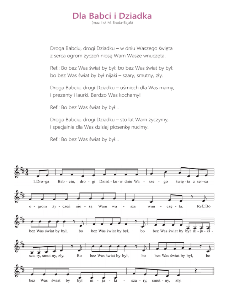 Dla Babci i Dziadka (muz. i sł. M. Broda-Bajak) Droga Babciu, drogi Dziadku – w dniu Waszego święta z serca ogrom życzeń niosą Wam Wasze wnuczęta. Ref.: Bo bez Was świat by był, bo bez Was świat by był, bo bez Was świat by był nijaki – szary, smutny, zły. Droga Babciu, drogi Dziadku – uśmiech dla Was mamy, i prezenty i laurki. Bardzo Was kochamy! Ref.: Bo bez Was świat by był… Droga Babciu, drogi Dziadku – sto lat Wam życzymy, i specjalnie dla Was dzisiaj piosenkę nucimy. Ref.: Bo bez Was świat by był…
