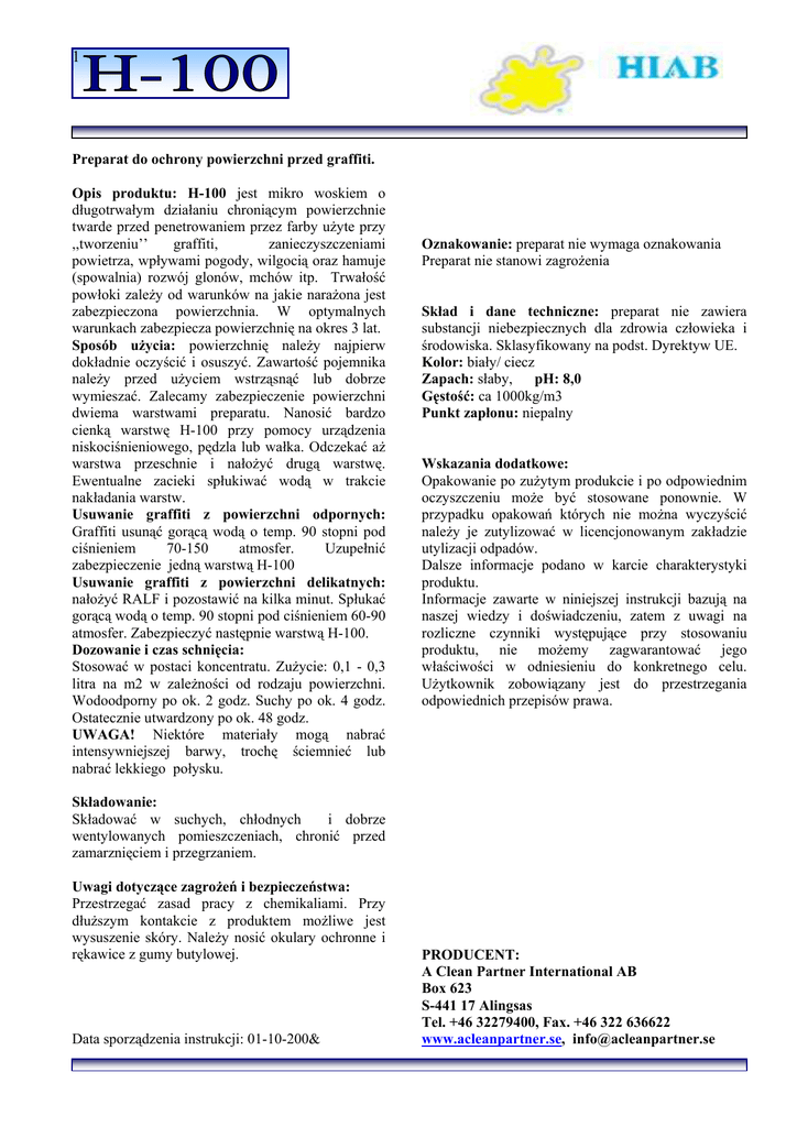 1 Preparat do ochrony powierzchni przed graffiti. Opis produktu: H-100 jest mikro woskiem o długotrwałym działaniu chroniącym powierzchnie twarde przed penetrowaniem przez farby użyte przy ,,tworzeniu’’ graffiti, zanieczyszczeniami powietrza, wpływami pogody, wilgocią oraz hamuje (spowalnia) rozwój glonów, mchów itp. Trwałość powłoki zależy od warunków na jakie narażona jest zabezpieczona powierzchnia. W optymalnych warunkach zabezpiecza powierzchnię na okres 3 lat. Sposób użycia: powierzchnię należy najpierw dokładnie oczyścić i osuszyć. Zawartość pojemnika należy przed użyciem wstrząsnąć lub dobrze wymieszać. Zalecamy zabezpieczenie powierzchni dwiema warstwami preparatu. Nanosić bardzo cienką warstwę H-100 przy pomocy urządzenia niskociśnieniowego, pędzla lub wałka. Odczekać aż warstwa przeschnie i nałożyć drugą warstwę. Ewentualne zacieki spłukiwać wodą w trakcie nakładania warstw. Usuwanie graffiti z powierzchni odpornych: Graffiti usunąć gorącą wodą o temp. 90 stopni pod ciśnieniem 70-150 atmosfer. Uzupełnić zabezpieczenie jedną warstwą H-100 Usuwanie graffiti z powierzchni delikatnych: nałożyć RALF i pozostawić na kilka minut. Spłukać gorącą wodą o temp. 90 stopni pod ciśnieniem 60-90 atmosfer. Zabezpieczyć następnie warstwą H-100. Dozowanie i czas schnięcia: Stosować w postaci koncentratu. Zużycie: 0,1 - 0,3 litra na m2 w zależności od rodzaju powierzchni. Wodoodporny po ok. 2 godz. Suchy po ok. 4 godz. Ostatecznie utwardzony po ok. 48 godz. UWAGA! Niektóre materiały mogą nabrać intensywniejszej barwy, trochę ściemnieć lub nabrać lekkiego połysku. Oznakowanie: preparat nie wymaga oznakowania Preparat nie stanowi zagrożenia Skład i dane techniczne: preparat nie zawiera substancji niebezpiecznych dla zdrowia człowieka i środowiska. Sklasyfikowany na podst. Dyrektyw UE. Kolor: biały/ ciecz Zapach: słaby, pH: 8,0 Gęstość: ca 1000kg/m3 Punkt zapłonu: niepalny Wskazania dodatkowe: Opakowanie po zużytym produkcie i po odpowiednim oczyszczeniu może być stosowane ponownie. W przypadku opakowań których nie można wyczyścić należy je zutylizować w licencjonowanym zakładzie utylizacji odpadów. Dalsze informacje podano w karcie charakterystyki produktu. Informacje zawarte w niniejszej instrukcji bazują na naszej wiedzy i doświadczeniu, zatem z uwagi na rozliczne czynniki występujące przy stosowaniu produktu, nie możemy zagwarantować jego właściwości w odniesieniu do konkretnego celu. Użytkownik zobowiązany jest do przestrzegania odpowiednich przepisów prawa. Składowanie: Składować w suchych, chłodnych i dobrze wentylowanych pomieszczeniach, chronić przed zamarznięciem i przegrzaniem. Uwagi dotyczące zagrożeń i bezpieczeństwa: Przestrzegać zasad pracy z chemikaliami. Przy dłuższym kontakcie z produktem możliwe jest wysuszenie skóry. Należy nosić okulary ochronne i rękawice z gumy butylowej. Data sporządzenia instrukcji: 01-10-200& PRODUCENT: A Clean Partner International AB Box 623 S-441 17 Alingsas Tel. +46 32279400, Fax. +46 322 636622 www.acleanpartner.se, [email protected]