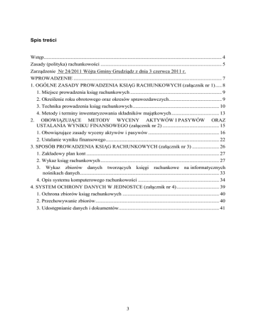 Spis treści Wstęp.......................................................................................................................................... 4 Zasady (polityka) rachunkowości .............................................................................................. 5 Zarządzenie Nr 24/2011 Wójta Gminy Grudziądz z dnia 3 czerwca 2011 r. WPROWADZENIE ................................................................................................................... 7 1. OGÓLNE ZASADY PROWADZENIA KSIĄG RACHUNKOWYCH (załącznik nr 1) ..... 8 1. Miejsce prowadzenia ksiąg rachunkowych ....................................................................... 9 2. Określenie roku obrotowego oraz okresów sprawozdawczych ......................................... 9 3. Technika prowadzenia ksiąg rachunkowych ................................................................... 10 4. Metody i terminy inwentaryzowania składników majątkowych ..................................... 13 2. OBOWIĄZUJĄCE METODY WYCENY AKTYWÓW I PASYWÓW ORAZ USTALANIA WYNIKU FINANSOWEGO (załącznik nr 2) ............................................ 15 1. Obowiązujące zasady wyceny aktywów i pasywów ....................................................... 16 2. Ustalanie wyniku finansowego ........................................................................................ 22 3. SPOSÓB PROWADZENIA KSIĄG RACHUNKOWYCH (załącznik nr 3) ..................... 26 1. Zakładowy plan kont ....................................................................................................... 27 2. Wykaz ksiąg rachunkowych ............................................................................................ 27 3. Wykaz zbiorów danych tworzących księgi rachunkowe na informatycznych nośnikach danych ............................................................................................................ 33 4. Opis systemu komputerowego rachunkowości ............................................................... 34 4. SYSTEM OCHRONY DANYCH W JEDNOSTCE (załącznik nr 4) ................................. 39 1. Ochrona zbiorów ksiąg rachunkowych ........................................................................... 40 2. Przechowywanie zbiorów ................................................................................................ 40 3. Udostępnianie danych i dokumentów.............................................................................. 41 3 Wstęp Ustawa z dnia 29 września 1994 r. o rachunkowości (t.j. Dz.U. z 2009 r. Nr 152, poz. 1223 z późn. zm.) nakłada na wszystkie podmioty i jednostki prowadzące księgi rachunkowe obowiązek posiadania aktualnej dokumentacji określającej przyjęte w jednostce zasady, zwane polityką rachunkowości. Niniejsze opracowanie zostało przygotowane dla jednostek budżetowych zarówno państwowych, jak i samorządowych, w tym dla państwowych jednostek budżetowych obsługujących organy podatkowe podległe ministrowi właściwemu do spraw finansów publicznych, organów finansowych jednostek samorządu terytorialnego, które obok ogólnych zasad wynikających z ustawy o rachunkowości zobligowane są do stosowania odrębnych zasad wynikających z: 1) rozporządzenia Ministra Finansów z dnia 5 lipca 2010 r. w sprawie szczególnych zasad rachunkowości oraz planów kont dla budżetu państwa, budżetów jednostek samorządu terytorialnego, jednostek budżetowych, samorządowych zakładów budżetowych, państwowych funduszy celowych oraz państwowych jednostek budżetowych mających siedzibę poza granicami Rzeczypospolitej Polskiej, (Dz.U. Nr 128, poz. 861), zwanego dalej „rozporządzeniem‖, 2) rozporządzenia Ministra Finansów z dnia 25 października 2010 r. w sprawie zasad rachunkowości i planu kont w zakresie ewidencji podatków, opłat i niepodatkowych należności budżetowych dla organów podatkowych jednostek samorządu terytorialnego (Dz.U. Nr 208, poz. 1375), 3) rozporządzenia Ministra Finansów z dnia 30 marca 2010 r. w sprawie szczegółowego sposobu ustalania wartości zobowiązań zaliczanych do państwowego długu publicznego, długu Skarbu Państwa, wartości zobowiązań z tytułu poręczeń i gwarancji (Dz.U. Nr 57, poz. 366), 4) rozporządzenia Ministra Kultury i Dziedzictwa Narodowego z dnia 29 października 2008 r. w sprawie sposobu ewidencji materiałów bibliotecznych (Dz.U. Nr 205, poz. 1283). Zmiany dokonane w niniejszym wydaniu opracowania wynikają głównie z nowej ustawy o finansach publicznych, obowiązującej od początku 2010 r., oraz wydanych na jej podstawie następujących rozporządzeń: Ministra Finansów z dnia 5 lipca 2010 r. w sprawie szczególnych zasad rachunkowości oraz planów kont dla budżetu państwa..., Ministra Finansów z dnia 3 lutego 2010 r. w sprawie sprawozdawczości budżetowej, Dz. U. Nr 20, poz. 103. Podstawowym celem opracowania jest pomoc kierownikom jednostek budżetowych (także głównym księgowym) w opracowaniu dokumentacji rachunkowości obowiązującej w kierowanych przez nich jednostkach. Tekst opracowania, po uzupełnieniu i przeróbkach uwzględniających indywidualne rozwiązania przyjęte w jednostce, podpisaniu przez kierownika jednostki, przyjmie postać wymaganego przepisami ustawy o rachunkowości zarządzenia w sprawie zasad (polityki) rachunkowości jednostki. Jak doprowadzić tekst przedstawionego wzorca do postaci zarządzania? 4 Dokumentacja Zasad (polityki) rachunkowości w Urzędzie Gminy w Grudziądzu 5 WPROWADZENIE Niniejsze zasady mają na celu przedstawienie obowiązujących w Urzędzie Gminy w Grudziądzu 1. Ogólnych zasad prowadzenia ksiąg rachunkowych (załącznik nr 1). 2. Metod wyceny aktywów i pasywów oraz ustalania wyniku finansowego (załącznik nr 2). 3. Sposobu prowadzenia ksiąg rachunkowych (załącznik nr 3), w tym: a) zakładowego planu kont i wykazu kont ksiąg pomocniczych (załącznik nr 3a), b) wykaz