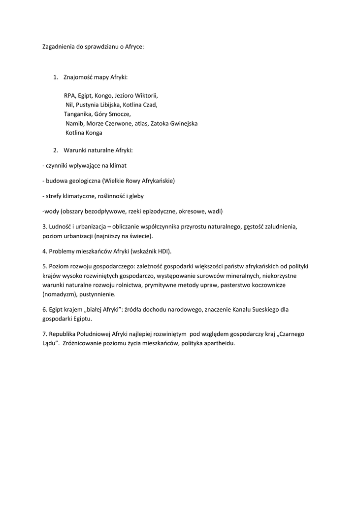 Zagadnienia do sprawdzianu o Afryce: 1. Znajomość mapy Afryki: RPA, Egipt, Kongo, Jezioro Wiktorii, Nil, Pustynia Libijska, Kotlina Czad, Tanganika, Góry Smocze, Namib, Morze Czerwone, atlas, Zatoka Gwinejska Kotlina Konga 2. Warunki naturalne Afryki: - czynniki wpływające na klimat - budowa geologiczna (Wielkie Rowy Afrykańskie) - strefy klimatyczne, roślinność i gleby -wody (obszary bezodpływowe, rzeki epizodyczne, okresowe, wadi) 3. Ludność i urbanizacja – obliczanie współczynnika przyrostu naturalnego, gęstość zaludnienia, poziom urbanizacji (najniższy na świecie). 4. Problemy mieszkańców Afryki (wskaźnik HDI). 5. Poziom rozwoju gospodarczego: zależność gospodarki większości państw afrykańskich od polityki krajów wysoko rozwiniętych gospodarczo, występowanie surowców mineralnych, niekorzystne warunki naturalne rozwoju rolnictwa, prymitywne metody upraw, pasterstwo koczownicze (nomadyzm), pustynnienie. 6. Egipt krajem „białej Afryki”: źródła dochodu narodowego, znaczenie Kanału Sueskiego dla gospodarki Egiptu. 7. Republika Południowej Afryki najlepiej rozwiniętym pod względem gospodarczy kraj „Czarnego Lądu”. Zróżnicowanie poziomu życia mieszkańców, polityka apartheidu.