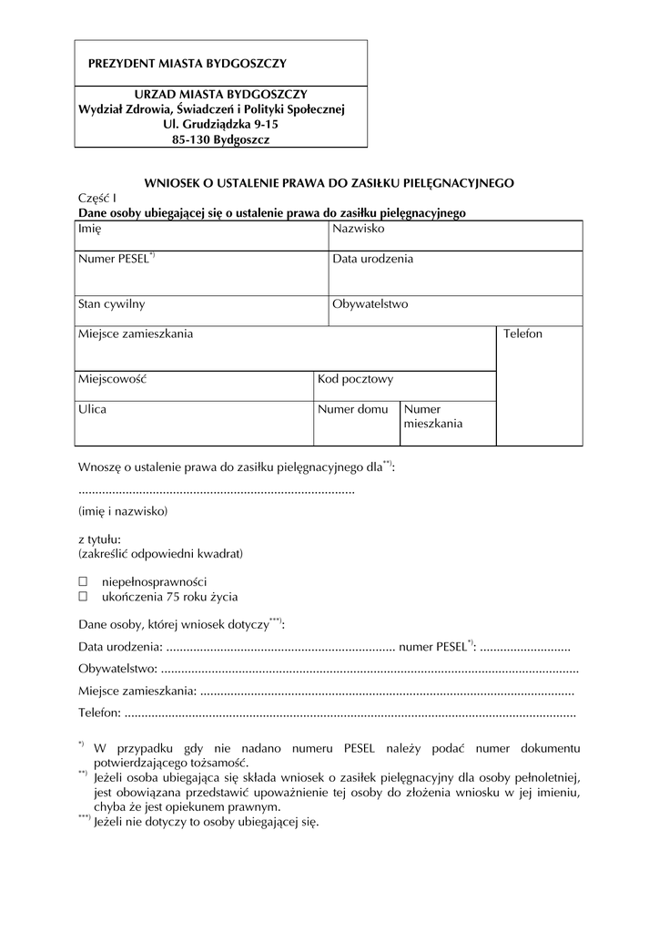 PREZYDENT MIASTA BYDGOSZCZY URZAD MIASTA BYDGOSZCZY Wydział Zdrowia, Świadczeń i Polityki Społecznej Ul. Grudziądzka 9-15 85-130 Bydgoszcz WNIOSEK O USTALENIE PRAWA DO ZASIŁKU PIELĘGNACYJNEGO Część I Dane osoby ubiegającej się o ustalenie prawa do zasiłku pielęgnacyjnego Imię Nazwisko Numer PESEL*) Data urodzenia Stan cywilny Obywatelstwo Miejsce zamieszkania Telefon Miejscowość Kod pocztowy Ulica Numer domu Numer mieszkania Wnoszę o ustalenie prawa do zasiłku pielęgnacyjnego dla**): .................................................................................. (imię i nazwisko) z tytułu: (zakreślić odpowiedni kwadrat) □ □ niepełnosprawności ukończenia 75 roku życia Dane osoby, której wniosek dotyczy***): Data urodzenia: .................................................................... numer PESEL*): ........................... Obywatelstwo: ............................................................................................................................ Miejsce zamieszkania: ............................................................................................................... Telefon: ...................................................................................................................................... *) W przypadku gdy nie nadano numeru PESEL należy podać numer dokumentu potwierdzającego tożsamość. **) Jeżeli osoba ubiegająca się składa wniosek o zasiłek pielęgnacyjny dla osoby pełnoletniej, jest obowiązana przedstawić upoważnienie tej osoby do złożenia wniosku w jej imieniu, chyba że jest opiekunem prawnym. ***) Jeżeli nie dotyczy to osoby ubiegającej się. Część II Oświadczenie służące ustaleniu uprawnień do zasiłku pielęgnacyjnego Oświadczam, że: - powyższe dane są prawdziwe, - zapoznałam/zapoznałem się z warunkami uprawniającymi do zasiłku pielęgnacyjnego, - osoba, której wniosek dotyczy, nie przebywa w instytucji zapewniającej całodobowe utrzymanie, tj. domu pomocy społecznej, placówce opiekuńczo-wychowawczej, młodzieżowym ośrodku wychowawczym, schronisku dla nieletnich, zakładzie poprawczym, areszcie śledczym, zakładzie karnym, zakładzie opiekuńczo-leczniczym, zakładzie pielęgnacyjnoopiekuńczym, a także szkole wojskowej lub innej szkole, jeżeli instytucje te zapewniają nieodpłatnie pełne utrzymanie, - osoba, której wniosek dotyczy, nie pobiera zasiłku pielęgnacyjnego w innej instytucji, - osoba, której wniosek dotyczy, nie jest uprawniona do dodatku pielęgnacyjnego, - członkowi rodziny nie przysługuje za granicą świadczenie na pokrycie wydatków związanych z pielęgnacją osoby, której wniosek dotyczy, lub przepisy o koordynacji systemów zabezpieczenia społecznego lub dwustronne umowy o zabezpieczeniu społecznym stanowią, że przysługujące za granicą świadczenie na pokrycie wydatków związanych z opieką nie wyłącza prawa do takiego świadczenia na podstawie ustawy. W przypadku zmian mających wpływ na prawo do zasiłku pielęgnacyjnego, w szczególności zaistnienia okoliczności wymienionych powyżej, osoba ubiegająca się jest zobowiązana niezwłocznie powiadomić o tych zmianach podmiot realizujący świadczenia rodzinne. Niepoinformowanie organu właściwego prowadzącego postępowanie w sprawie świadczeń rodzinnych o zmianach, o których mowa powyżej, może skutkować powstaniem nienależnie pobranych świadczeń rodzinnych, a w konsekwencji koniecznością ich zwrotu. .......................................................... (data, podpis osoby ubiegającej się) Do wniosku dołączam następujące dokumenty: 1) ............................................................................................................................................. 2) ............................................................................................................................................. 3) ............................................................................................................................................. 4) ............................................................................................................................................. Oświadczam, że jestem świadomy/świadoma odpowiedzialności karnej za złożenie fałszywego oświadczenia. ……………….......……… (miejscowość, data) ………………..................……………………………………... (podpis osoby ubiegającej się składającej oświadczenie) Pouczenie Na podstawie art. 16 ustawy z dnia 28 listopada 2003 r. o świadczeniach rodzinnych (Dz. U. z 2006 r. Nr 139, poz. 992, z późn. zm.), zwanej dalej „ustawą”, zasiłek pielęgnacyjny przysługuje: 1) niepełnosprawnemu dziecku; 2) osobie niepełnosprawnej w wieku powyżej 16 roku życia, jeżeli legitymuje się orzeczeniem o znacznym stopniu niepełnosprawności; 3) osobie, która ukończyła 75 lat. Zasiłek pielęgnacyjny przysługuje także osobie niepełnosprawnej w wieku powyżej 16 roku życia, legitymującej się orzeczeniem o umiarkowanym stopniu niepełnosprawności, jeżeli niepełnosprawność powstała w wieku do ukończenia 21 roku życia. Zasiłek pielęgnacyjny przysługuje: 1) obywatelom polskim, 2) cudzoziemcom: a) do których stosuje się przepisy o koordynacji systemów zabezpieczenia społecznego, b) jeżeli wynika to z wiążących Rzeczpospolitą Polską umów dwustronnych o zabezpieczeniu społecznym, c) przebywającym na terytorium Rzeczypospolitej Polskiej na podstawie zezwolenia na osiedlenie się, zezwolenia na pobyt rezydenta długoterminowego Wspólnot Europejskich, zezwolenia na zamieszkanie na czas oznaczony udzielonego w związku z okolicznością, o której mowa w art. 53 ust. 1 pkt 13 ustawy z dnia 13 czerwca 2003 r. o cudzoziemcach (Dz. U. z 2011 r. Nr 264, poz. 1573, oraz z 2012 r. poz. 589 i 769), lub w związku z uzyskaniem w Rzeczypospolitej Polskiej statusu uchodźcy lub ochro