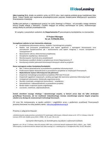 Idea Leasing S.A. działa na polskim rynku od 2010 roku i jest częścią polskiej grupy kapitałowej Idea Bank. Celem Spółki jest wspieranie przedsiębiorczości poprzez dostarczanie efektywnych sposobów finansowania inwestycji. Spółka jest jednym z największych graczy na rynku leasingu w Polsce - od początku swego istnienia tworzy trwałe relacje z klientami i szybko reaguje na zmiany zachodzące na rynku, dostosowując swoją ofertę do potrzeb przedsiębiorców. W związku z powstałym wakatem do Departamentu IT poszukujemy kandydatów na stanowisko: IT Project Manager Nr ref. IT/PM/09.2015 Szczegółowe zadania na tym stanowisku obejmują: Kompleksowe planowanie zakresu, budżetu i harmonogramu projektu Nadzór nad procesami projektowymi pod kątem zgodności z wymogami biznesowymi oraz procedurami bezpieczeństwa jak i dostosowania pod kątem integracji z innymi narzędziami i rozwiązaniami IT Opracowanie zakresu dokumentacji projektowej Zarządzanie współpracą z dostawcami Monitorowanie i kontrola prac projektowych Koordynacja wszelkich działań w projekcie po stronie Departamentu IT Koordynacja działań jednostek biznesowych biorących udział w projekcie Nasze wymagania wobec Kandydata/Kandydatki: Min. 3-letnie doświadczenie w prowadzeniu projektów informatycznych Preferowane będzie doświadczenie w prowadzeniu projektów w instytucjach finansowych Wykształcenie wyższe informatyczne lub pokrewne Znajomość metodologii prowadzenia projektów (PMI lub/i Prince2) Znajomość zagadnień związanych z analizą wymagań dla tworzenia systemów informatycznych Umiejętność planowania i doskonała organizacja pracy Wysoko rozwinięte umiejętności komunikacji i współpracy Samodzielność i odpowiedzialność za prowadzone projekty Bardzo dobra znajomość języka angielskiego uczciwość, rzetelność, odpowiedzialność. Zostań członkiem naszego młodego i dynamicznego zespołu, w którym praca daje nie tylko atrakcyjne gratyfikacje finansowe, ale też możliwość indywidualnego rozwoju zawodowego poprzez bogate programy szkoleń oraz dostęp do nowoczesnych technologii biurowych. CV oraz list motywacyjny w języku polskim i angielskim wraz z podaniem oczekiwań finansowych prosimy kierować na niżej podany adres: [email protected] Prosimy o załączenie klauzuli: „Zainteresowane osoby prosimy o przesłanie CV zawierające informacje, o których mowa w art. 22¹ § 1 Ustawy z dnia 26 czerwca 1974 roku Kodeks pracy (DzU z 1998 r. Nr 21, poz. 94 ze zm). Uprzejmie informujemy, że skontaktujemy się jedynie z wybranymi osobami. Zgodnie z art. 24 ust. 1 Ustawy z dnia 29 sierpnia 1997 roku o ochronie danych osobowych (DzU z 2014 r., poz. 1182) informujemy, że administratorem danych jest Idea Leasing S.A. z siedzibą przy ul. Strzegomska 42b, 53-611 Wrocław. Przedmiotowe dane przetwarzane są w celu niezbędnym do realizowanego procesu rekrutacyjnego oraz podjęcia działań przed zawarciem umowy i nie będą udostępniane innym odbiorcom danych. Obowiązek ich podania wynika z przepisów Ustawy z dnia 26 czerwca 1974 roku Kodeks pracy (DzU z 1998 r. Nr 21, poz. 94 ze zm.) oraz wydanych na jej podstawie aktów wykonawczych. Każda osoba ma prawo dostępu do treści swoich danych oraz do ich poprawiania. Wyrażam zgodę także na przetwarzanie w przyszłości podanych w CV danych w celu związanym z przyszłymi procesami rekrutacyjnymi realizowanymi przez Idea Leasing S.A..”