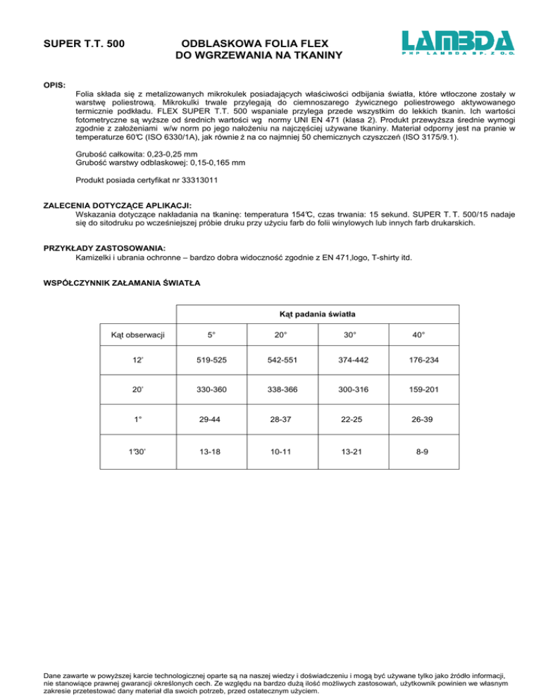 SUPER T.T. 500 ODBLASKOWA FOLIA FLEX DO WGRZEWANIA NA TKANINY OPIS: Folia składa się z metalizowanych mikrokulek posiadających właściwości odbijania światła, które wtłoczone zostały w warstwę poliestrową. Mikrokulki trwale przylegają do ciemnoszarego żywicznego poliestrowego aktywowanego termicznie podkładu. FLEX SUPER T.T. 500 wspaniale przylega przede wszystkim do lekkich tkanin. Ich wartości fotometryczne są wyższe od średnich wartości wg normy UNI EN 471 (klasa 2). Produkt przewyższa średnie wymogi zgodnie z założeniami w/w norm po jego nałożeniu na najczęściej używane tkaniny. Materiał odporny jest na pranie w temperaturze 60°C (ISO 6330/1A), jak równie ż na co najmniej 50 chemicznych czyszczeń (ISO 3175/9.1). Grubość całkowita: 0,23-0,25 mm Grubość warstwy odblaskowej: 0,15-0,165 mm Produkt posiada certyfikat nr 33313011 ZALECENIA DOTYCZĄCE APLIKACJI: Wskazania dotyczące nakładania na tkaninę: temperatura 154°C, czas trwania: 15 sekund. SUPER T. T. 500/15 nadaje się do sitodruku po wcześniejszej próbie druku przy użyciu farb do folii winylowych lub innych farb drukarskich. PRZYKŁADY ZASTOSOWANIA: Kamizelki i ubrania ochronne – bardzo dobra widoczność zgodnie z EN 471,logo, T-shirty itd. WSPÓŁCZYNNIK ZAŁAMANIA ŚWIATŁA Kąt padania światła Kąt obserwacji 5° 20° 30° 40° 12’ 519-525 542-551 374-442 176-234 20’ 330-360 338-366 300-316 159-201 1° 29-44 28-37 22-25 26-39 1°30’ 13-18 10-11 13-21 8-9 Dane zawarte w powyższej karcie technologicznej oparte są na naszej wiedzy i doświadczeniu i mogą być używane tylko jako źródło informacji, nie stanowiące prawnej gwarancji określonych cech. Ze względu na bardzo dużą ilość możliwych zastosowań, użytkownik powinien we własnym zakresie przetestować dany materiał dla swoich potrzeb, przed ostatecznym użyciem.