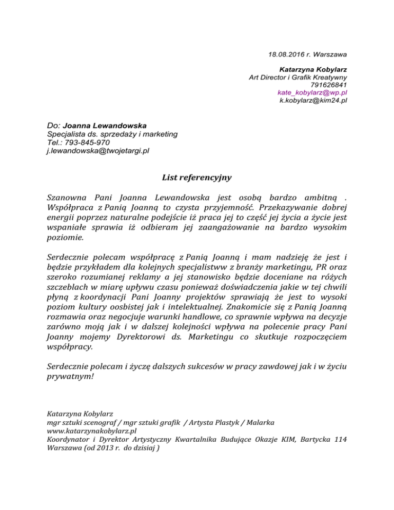 18.08.2016 r. Warszawa Katarzyna Kobylarz Art Director i Grafik Kreatywny 791626841 [email protected] [email protected] Do: Joanna Lewandowska Specjalista ds. sprzedaży i marketing Tel.: 793-845-970 [email protected] List referencyjny Szanowna Pani Joanna Lewandowska jest osobą bardzo ambitną . Współpraca z Panią Joanną to czysta przyjemność. Przekazywanie dobrej energii poprzez naturalne podejście iż praca jej to część jej życia a życie jest wspaniałe sprawia iż odbieram jej zaangażowanie na bardzo wysokim poziomie. Serdecznie polecam współpracę z Panią Joanną i mam nadzieję że jest i będzie przykładem dla kolejnych specjalistww z branży marketingu, PR oraz szeroko rozumianej reklamy a jej stanowisko będzie doceniane na różych szczeblach w miarę upływu czasu ponieważ doświadczenia jakie w tej chwili płyną z koordynacji Pani Joanny projektów sprawiają że jest to wysoki poziom kultury oosbistej jak i intelektualnej. Znakomicie się z Panią Joanną rozmawia oraz negocjuje warunki handlowe, co sprawnie wpływa na decyzje zarówno moją jak i w dalszej kolejności wpływa na polecenie pracy Pani Joanny mojemy Dyrektorowi ds. Marketingu co skutkuje rozpoczęciem współpracy. Serdecznie polecam i życzę dalszych sukcesów w pracy zawdowej jak i w życiu prywatnym! Katarzyna Kobylarz mgr sztuki scenograf / mgr sztuki grafik / Artysta Plastyk / Malarka www.katarzynakobylarz.pl Koordynator i Dyrektor Artystyczny Kwartalnika Budujące Okazje KIM, Bartycka 114 Warszawa (od 2013 r. do dzisiaj )