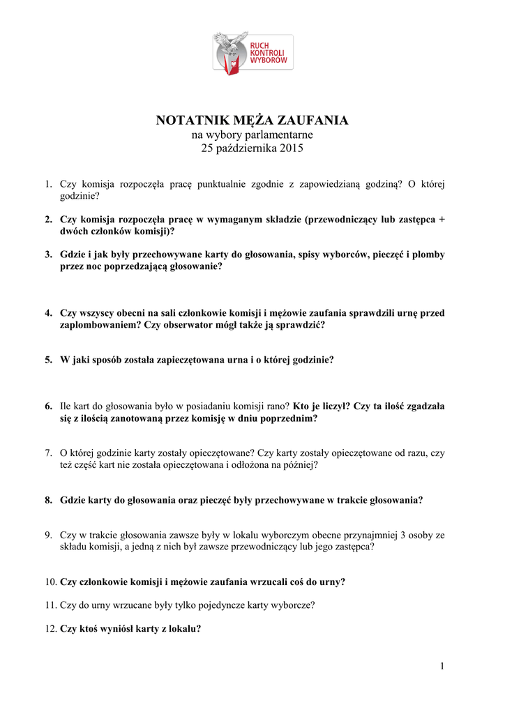 NOTATNIK MĘŻA M ZAUFANIA na wybory parlamentarne 25 października 2015 1. Czy komisja rozpoczęła ła pracę punktualnie zgodnie z zapowiedzianąą godziną? godzin O której godzinie? 2. Czy komisja rozpoczęła ła pracę prac w wymaganym składzie (przewodniczący (przewodniczą lub zastępca + dwóch członków komisji)? 3. Gdzie i jak były przechowywane karty do głosowania, głosowania, spisy wyborców, pieczęć piecz i plomby przez noc poprzedzającą głosowanie? 4. Czy wszyscy obecni na sali członkowie komisji i mężowie m zaufania sprawdzili urnę urn przed zaplombowaniem? Czy obserwator mógł także tak ją sprawdzić? 5. W jaki sposób została zapieczętowana zapiecz urna i o której godzinie? 6. Ile kart do głosowania było w posiadaniu komisji rano? Kto je liczył? Czy ta ilość ilo zgadzała się z ilością zanotowaną przez komisję komisj w dniu poprzednim? 7. O której godzinie karty zostały opieczętowane? opiecz Czy karty zostały opieczętowane ętowane od razu, czy też część kart nie została opieczętowana opiecz i odłożona na później? 8. Gdzie karty do głosowania oraz pieczęć piecz były przechowywane w trakcie głosowania? 9. Czy w trakcie głosowania zawsze były w lokalu wyborczym obecne przynajmniej 3 osoby ze składu komisji, a jedną z nich był zawsze przewodniczący przewodnicz lub jego zastępca? ępca? 10. Czy członkowie komisji i męż ężowie zaufania wrzucali coś do urny? 11. Czy do urny wrzucane były tylko pojedyncze karty wyborcze? 12. Czy ktoś wyniósł karty z lokalu? 1 13. Czy członkowie komisji dopisywali coś co na spisie wyborców pod nieobecność nieobecno wyborców? 14. Ile osób głosowało na podstawie zaświadczenia za wiadczenia o prawie do głosowania? Czy komisja zabierała zaświadczenia? wiadczenia? Ile ich zabrała? 15. Ile osób głosowało przez pełnomocnika? Czy komisja zabierała pełnomocnictwa? Ile ich zabrała ? 16. Czy komisja otrzymała głosy korespondencyjne? Co komisja zrobiła z tymi głosami po ich otrzymaniu? 17. Czy urna uległa zapełnieniu podczas głosowania? Czy użyto urny dodatkowej? Jak została sprawdzona urna dodatkowa? Przez kogo? Jak została zabezpieczona? 18. O której godzinie zakończono czono głosowanie w lokalu? 19. Ilu członków komisji było obecnych podczas obliczania wyników głosowania? czynno komisji tuż po zamknięciu ciu lokalu wyborczego? Co 20. Jaka była sekwencja czynności zostało zrobione w pierwszej kolejności? kolejno 21. Czy w lokalu wyborczym w czasie głosowania oraz liczenia głosów znajdowały się si inne osoby poza komisją i mężami ami zaufania? 22. W jaki sposób zabezpieczono urnę urn po zamknięciu ciu lokalu wyborczego dla głosujących? głosuj O której godzinie to się stało? Czy urna stała w tym samym miejscu przez cały czas? 23. Kto liczył puste karty do głosowania? Czy były one opieczętowane? towane? Ile ich było? 24. Kto liczył podpisy w spisie wyborców? Ile ich było? Jak zabezpieczono spis wyborców po zliczeniu i zaprotokołowaniu liczby podpisów? 2 25. Czy liczba podpisów w spisie wyborców plus liczba pustych ustych kart dała w sumie liczbę liczb równą ilości kart posiadanych przez komisję komisj na początku? Jeśli śli nie - czy komisja powtórzyła liczenie? Jaki wynik otrzymała? Co wpisała do protokołu? 26. Czy puste karty oraz spis wyborców zostały zapakowane i zapieczętowane zapiecz tuż po zliczeniu? W jaki sposób karty oraz spis zostały zabezpieczone? Czy zabezpieczenia zabe dokonano przed otwarciem urny? Gdzie przechowywano zapakowane puste karty do głosowania oraz spis wyborców podczas liczenia głosów wyjętych wyj tych z urny? 27. Czy przed otwarciem urny sprawdzono, czy jej pieczęcie są nienaruszone? Czy były nienaruszone? 28. Gdzie zostały wysypane karty do głosowania? 29. Czy komisja pracowała wspólnie w jednym zespole roboczym? cy nakazał odłożenie odło enie długopisów? Czy konieczne notatki robione były 30. Czy przewodniczący ołówkiem? 31. Ile kart wyjęto z urny? 32. Czy ilość kart wyjętych tych z urny była równa ilości ilo ci podpisów w spisie wyborców? Jeśli nie, to co zrobiła komisja? Jaki był ostateczny wynik kolejnego przeliczenia kart? Co wpisano do protokołu? 33. Czy przewodniczący cy ukazywał każdą ka kartę całej komisji, by potwierdziła, na kogo głos został oddany? 34. Czy karty były prawidłowo segregowane na sterty z głosami na danego kandydata? ka ze stosów? 35. Kto liczył posegregowane głosy? Ile osób liczyło każdy 3 36. Ile było kart nieważnych? nych? Z jakiego powodu były one nieważne? niewa Ile było innych rzeczy (przedmiotów, ulotek, śmieci) mieci) w urnie? 37. Ile było głosów nieważnych nych na kartach ważnych? wa nych? Z jakiego powodu były to głosy nieważne? 38. Czy suma głosów na poszczególnych kandydatów, głosów nieważnych niewa nych i kart nieważnych była równa ilości ci kart wydanych (podpisów w spisie wyborców)? Jeśli Jeś nie - co zrobiła komisja? Jaki był wynik ponownego liczenia? Co zostało zanotowane zanotowane w protokole? ci/nieważności kart i głosów się powtarzały? Czy zy była w tym jakaś jaka 39. Czy spory dot. ważności/niewa reguła, np. ta sama osoba wielokrotnie namawiała do uznania głosów ważnych wa za nieważne lub odwrotnie? 40. Czy pomiędzy powyższymi szymi sumami (pkt.38) były jakiekolwiek różnice? nice? Ile wynosiły? Jak zostały wytłumaczone przez komisję? komisj 41. Czy w jakimkolwiek momencie pracy komisji - od rozpoczęcia o świcie do zakończenia za liczenia głosów - była konieczność konieczno interwencji policji lub komisarza wyborczego? Czy komisja prosiła o tą interwencję? interwencj Czy interwencja odbyła się i jak sięę zakończyła? zako 4 42. (Jeśli li komisja miała również równie głosy korespondencyjne) Czy rozkład głosów na poszczególnych kandydatów pośród po ród głosów oddanych korespondency