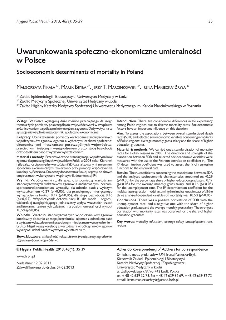 Pikala MPublic Hygeia i wsp.Health Uwarunkowania 2013, 48(1): społeczno-ekonomiczne 35-39 umieralności w Polsce 35 Uwarunkowania społeczno-ekonomiczne umieralności w Polsce Socioeconomic determinants of mortality in Poland Małgorzata Pikala 1/, Marek Bryła 2/, Jerzy T. Marcinkowski 3/, Irena Maniecka-Bryła 1/ Zakład Epidemiologii i Biostatystyki, Uniwersytet Medyczny w Łodzi Zakład Medycyny Społecznej, Uniwersytet Medyczny w Łodzi 3/ Zakład Higieny Katedry Medycyny Społecznej Uniwersytetu Medycznego im. Karola Marcinkowskiego w Poznaniu 1/ 2/ Wstęp. W Polsce występują duże różnice przeciętnego dalszego trwania życia pomiędzy poszczególnymi województwami w związku ze zróżnicowaniem współczynników natężenia zgonów. Duży wpływ na tę sytuację niewątpliwie mają czynniki społeczno-ekonomiczne. Cel pracy. Ocena zależności pomiędzy wartościami standaryzowanych współczynników zgonów ogółem a wybranymi cechami społecznoekonomicznymi mieszkańców poszczególnych województw: przeciętnym miesięcznym wynagrodzeniem brutto, stopą bezrobocia oraz odsetkiem osób z wyższym wykształceniem. Materiał i metody. Przeprowadzono standaryzację współczynników zgonów dla poszczególnych województw Polski w 2008 roku. Kierunek i siłę zależności pomiędzy wartościami SDR a analizowanymi zmiennymi społeczno-ekonomicznymi zmierzono przy pomocy współczynnika korelacji rxy Pearsona. Do oceny dopasowania funkcji regresji do danych empirycznych wykorzystano współczynnik determinacji R2. Wyniki. Współczynniki rxy dla zależności pomiędzy wartościami standaryzowanych wskaźników zgonów a analizowanymi cechami społeczno-ekonomicznymi wynosiły: dla odsetka osób z wyższym wykształceniem -0,29 (p>0,05), dla przeciętnego miesięcznego wynagrodzenia brutto -0,17 (p>0,05), dla stopy bezrobocia 0,16 (p>0,05). Współczynnik determinacji R 2 dla modelu regresji wielorakiej uwzględniającego jednoczesny wpływ wszystkich trzech analizowanych zmiennych zależnych na poziom umieralności wynosił 10,5% (p>0,05). Wnioski. Wartości standaryzowanych współczynników zgonów korelowały dodatnio ze stopą bezrobocia i ujemnie z odsetkiem osób z wyższym wykształceniem i przeciętnym miesięcznym wynagrodzeniem brutto. Najsilniejszą korelację z wartościami współczynników zgonów wykazywał udział osób z wyższym wykształceniem. Introduction. There are considerable differences in life expectancy among Polish regions due to diverse mortality rates. Socioeconomic factors have an important influence on this situation. Aim. To assess the associations between overall standardized death rates (SDR) and selected socioeconomic variables concerning inhabitants of Polish regions: average monthly gross salary and the share of higher education graduates. Material & methods. We carried out a standardisation of mortality rates for Polish regions in 2008. The direction and strength of the association between SDR and selected socioeconomic variables were measured with the use of the Pearson correlation coefficient rxy. The R2 determination coefficient was used to assess the fit of regression functions to the empirical data. Results. The rxy coefficients concerning the associations between SDR and the analysed socioeconomic characteristics amounted to: -0.29 (p>0.05) for the percentage share of higher education graduates, ‑0.17 (p>0.05) for the average monthly gross salary, and 0.16 (p>0.05) for the unemployment rate. The R2 determination coefficient for the multivariate regression model assuming the simultaneous impact of all the three analysed dependent variables on mortality was 10.5% (p>0.05). Conclusions. There was a positive correlation of SDR with the unemployment rate, and a negative one with the share of higher education graduates and the average monthly gross salary. The strongest correlation with mortality rates was observed for the share of higher education graduates. Key words: mortality, education, average salary, unemployment rate, regions Słowa kluczowe: umieralność, wykształcenie, przeciętne wynagrodzenie, stopa bezrobocia, województwa © Hygeia Public Health 2013, 48(1): 35-39 Adres do korespondencji / Address for correspondence www.h-ph.pl Dr hab. n. med., prof. nadzw. UM, Irena Maniecka-Bryła Kierownik Zakładu Epidemiologii I Biostatystyki Katedra Medycyny Społecznej I Zapobiegawczej Uniwersytet Medyczny w Łodzi ul. Żeligowskiego 7/9, 90-742 Łódź, Polska tel. + 48 42 639 32 73, fax + 48 42 639 32 69, + 48 42 639 32 73 e-mail: [email protected] Nadesłano: 12.02.2013 Zakwalifikowano do druku: 04.03.2013 Hygeia Public Health 2013, 48(1): 35-39 36 Stosowany skrót SDR – (Standardized Death Rate) – standaryzowany współczynnik zgonów Wprowadzenie W Polsce występują duże różnice przeciętnego dalszego trwania życia pomiędzy poszczególnymi województwami w związku ze zróżnicowaniem wartości współczynników natężenia zgonów. Nierówności w stanie zdrowia są poważnym i nasilającym się problemem [1-7]. W związku z tym jednym z priorytetów naukowych w dziedzinie zdrowia publicznego uczyniono niwelowanie tych różnic i ich uwarunkowań [8]. W maju 1998 roku została przyjęta Światowa Deklaracja Zdrowia „Zdrowie dla wszystkich w XXI wieku”, której jednym z sygnatariuszy jest Polska. Wśród 21 celów znajduje się redukcja do 2020 roku różnic zdrowotnych pomiędzy grupami społecznoekonomicznymi wewnątrz krajów przynajmniej o jedną czwartą, dzięki istotnej poprawie stanu zdrowia subpopulacji znajdujących się w niekorzystnym położeniu. Narodowy Program Zdrowia na lata 2007-2015 zakłada zmniejszenie różnic społecznych i ekonomicznych w przekroju terytorialnym jako jeden z celów strategicznych [9]. Badania prowadzone w krajach zachodnich [10‑19] oraz w krajach post-komunistycznych [20‑24] wykazały, że ryzyko zachorowania i zgonu jest zdecydowanie wyższe wśród ludności z ni
