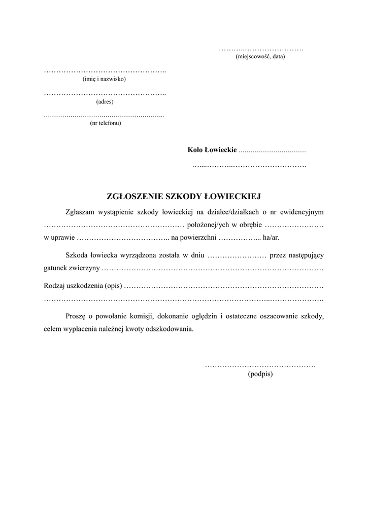 ………..…………………… (miejscowość, data) ………………………………………….. (imię i nazwisko) ………………………………………….. (adres) ………………………………………………….. (nr telefonu) Koło Łowieckie …………………………… …....………..………………………… ZGŁOSZENIE SZKODY ŁOWIECKIEJ Zgłaszam wystąpienie szkody łowieckiej na działce/działkach o nr ewidencyjnym ………………………………………………… położonej/ych w obrębie …………………… w uprawie ……………………………….. na powierzchni ……………... ha/ar. Szkoda łowiecka wyrządzona została w dniu …………………… przez następujący gatunek zwierzyny ……………………………………………………………………………… Rodzaj uszkodzenia (opis) ……………………………………………………………………… ………………………………………………………………………………..…………………. Proszę o powołanie komisji, dokonanie oględzin i ostateczne oszacowanie szkody, celem wypłacenia należnej kwoty odszkodowania. ……………………………………… (podpis)