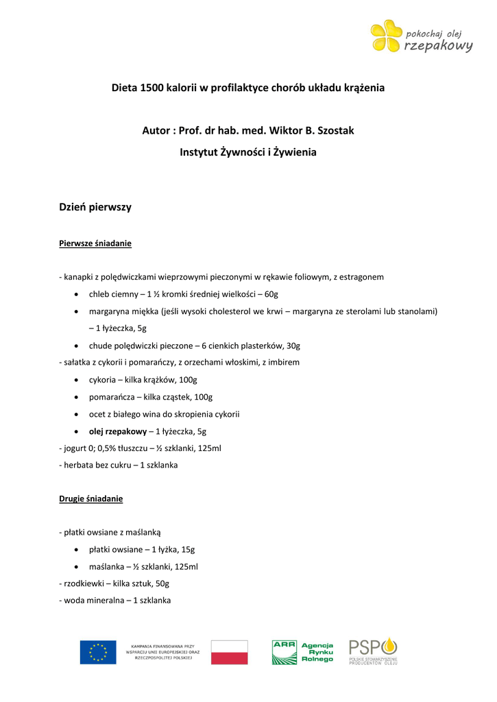 Dieta 1500 kalorii w profilaktyce chorób układu krążenia Autor : Prof. dr hab. med. Wiktor B. Szostak Instytut Żywności i Żywienia Dzieo pierwszy Pierwsze śniadanie - kanapki z polędwiczkami wieprzowymi pieczonymi w rękawie foliowym, z estragonem chleb ciemny – 1 ½ kromki średniej wielkości – 60g margaryna miękka (jeśli wysoki cholesterol we krwi – margaryna ze sterolami lub stanolami) – 1 łyżeczka, 5g chude polędwiczki pieczone – 6 cienkich plasterków, 30g - sałatka z cykorii i pomaraoczy, z orzechami włoskimi, z imbirem cykoria – kilka krążków, 100g pomaraocza – kilka cząstek, 100g ocet z białego wina do skropienia cykorii olej rzepakowy – 1 łyżeczka, 5g - jogurt 0; 0,5% tłuszczu – ½ szklanki, 125ml - herbata bez cukru – 1 szklanka Drugie śniadanie - płatki owsiane z maślanką płatki owsiane – 1 łyżka, 15g maślanka – ½ szklanki, 125ml - rzodkiewki – kilka sztuk, 50g - woda mineralna – 1 szklanka Obiad - zupa fasolowa, z suszonym lubczykiem, z natką pietruszki fasola „Jaś” – 3 łyżki suchej fasoli, przed gotowaniem, 45g włoszczyzna, świeża lub mrożona – 1 łyżka posiekanej, 15g - pierś kurczaka nadziewana szparagami, suszonym tymiankiem, pieczona w piekarniku pierś kurczaka, bez skóry – 100g szparagi – 3 sztuki, 100g olej rzepakowy – 2 łyżeczki, 10g - ryż brązowy – 3 łyżki ryżu suchego, przed gotowaniem, 30g - surówka z sałaty kruchej, z truskawkami, z listkami świeżej mięty, z jogurtem sałata – kilka listków, 100g truskawki – 100g jogurt 0; 0,5% tłuszczu – 3 łyżki, 45ml - woda mineralna z cytryną – 1 szklanka Podwieczorek - kanapka z jajkiem i pomidorem, z suszonym oregano chleb ciemny – 1 kromka średniej wielkości – 40g margaryna miękka (jeśli wysoki cholesterol we krwi – margaryna ze sterolami lub stanolami) – 1 łyżeczka, 5g jajko ugotowane na twardo – 1 mała sztuka, 40g pomidorki koktajlowe – kilka sztuk, 100g - woda mineralna – 1 szklanka Kolacja - chleb ciemny – 1 kromka średniej wielkości, 40g margaryna miękka (jeśli wysoki cholesterol we krwi – margaryna ze sterolami lub stanolami) – 1 łyżeczka, 5g - sałatka z grillowanego łososia, sałaty kruchej, papryki, ogórka kiszonego, z suszonym lubczykiem łosoś grillowany – 1 łyżka rozdrobnionego, 20g sałata – kilka listków, 50g papryka czerwona – kilka krążków, 50g olej rzepakowy – 2 łyżeczki, 10g - jagody polane chudym jogurtem, z cynamonem jagody świeże lub mrożone – 100g jogurt 0; 0,5% tłuszczu – 5 łyżek, 75ml Dzieo drugi Pierwsze śniadanie - płatki owsiane (lub inne płatki) chudym mlekiem, z plasterkami jabłka (ze skórą) z cynamonem płatki owsiane – 1 łyżka, 15g mleko 0; 0,5% tłuszczu – ½ szklanki, 125 ml jabłko – 1 mała sztuka 100g - chleb ciemny – 1 średnia kromka, 40g - sałatka z serka granulowanego „Light”, rzodkiewek, szczypiorku, z suszonym oregano serek granulowany „Light” – 1 łyżka, 15g rzodkiewki – kilka sztuk, 100g posiekany szczypiorek olej rzepakowy – 1 łyżeczka, 5g - herbata lub inny napój bez cukru – 1 szklanka Drugie śniadanie - kanapka z chudą kiełbasą szynkową, z pomidorem chleb ciemny – 1 cienka kromka, 40g chuda kiełbasa szynkowa – 2 cienkie plasterki, 10g pomidor – kilka plasterków, 30g - mleko zsiadłe 0; 0.5%tłuszczu – ½ szklanki, 125ml - woda mineralna lub inny napój bez cukru – 1 szklanka Obiad - zupa jarzynowa z ziemniakami, z suszonym tymiankiem, zabielona chudym jogurtem warzywa różne, świeże lub mrożone – 120g ziemniak - 1 średnia sztuka, 70g jogurt naturalny 0; 0,5% - 3 łyżki, 45ml - gulasz z chudego mięsa duszony z cebulą i papryką, z suszonym chili chude mięso wołowe lub wieprzowe – 100g cebula czerwona – 1 mała sztuka, 50g papryka czerwona – ½ średniej sztuki, 125g olej rzepakowy – 2 łyżeczki, 10g - kasza jęczmienna – 3 łyżki kaszy suchej, przed gotowaniem 30g - surówka z kapusty pekioskiej czerwonym grejpfrutem, z białym pieprzem kapusta pekioska – 100g czerwony grejpfrut – ¼ średniej sztuki, 100g sok z cytryny olej rzepakowy – 1 łyżeczka, 5g - herbata bez cukru – 1 szklanka Podwieczorek - chleb ciemny – 1 średnia kromka, 40g - sałatka z białego sera, pomidora, cebuli dymki, z orzechami włoskimi i bazylią ser biały chudy lub półtłusty – 1 cienki plaster, 20g pomidor – 1 mała sztuka, 50g cebula dymka – 2 małe sztuki, 30g orzechy włoskie posiekane – 2 sztuki, 10g olej rzepakowy – 1 łyżeczka, 5g - herbata bez cukru – 1 szklanka Kolacja - chleb ciemny – 1 średnia kromka, 40g - sałatka z tuoczyka z puszki, sałaty lodowej, z posiekanym koperkiem tuoczyk (w sosie własnym) z puszki – 1 łyżka rozdrobnionego, 15g sałata lodowa – kilka listków, 50g olej rzepakowy – 2 łyżeczki, 10g - morele polane chudym jogurtem, z migdałem morele – 3 małe sztuki, 100g jogurt 0; 0,5%tłuszczu – 5 łyżek, 75g migdały – 1 sztuka do dekoracji, 5g - herbata bez cukru – 1 szklanka Dzieo trzeci Pierwsze śniadanie - płatki jęczmienne z chudym jogurtem, posypane zarodkami pszennymi płatki jęczmienne (zalane wrzącą wodą, po przestudzeniu dodane do jogurtu) – 1 łyżka, 15g jogurt 0; 0,5% tłuszczu -1/2 szklanki, 125 ml zarodki pszenne – 1 łyżeczka, 5g - chleb ciemny – jedna średnia kromka, 40g margaryna miękka (jeśli wysoki cholesterol we krwi – margaryna ze sterolami lub stanolami) – 1 łyżeczka, 5g serek homogenizowany chudy – 1 łyżka, 15g ogórek świeży – kilka plasterków, 50g mandarynka – 1 sztuka, 100g - herbata bez cukru – 1 szklanka Drugie śniadanie - kanapka z szynką z kurczaka i papryką chleb ciemny – 1 cienka kromka, 20g koncentrat pomidorowy do posmarowania chleba szynka z kurczaka – 4 cienkie plasterki, 20g papryka – kilka krążków, 30g - maślanka – ½ szklanki,125g - woda mineralna – 1 szklanka Obiad - zupa brokułowa z grzan