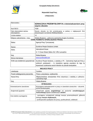 Europejskie Służby Zatrudnienia Wojewódzki Urząd Pracy w Białymstoku Stanowisko: SZWACZ/KA PRZEMYSŁOWY/A z doświadczeniem przy szyciu obuwia Kod ISCO: 7536 Opis stanowiska/ zakres obowiązków: Szycie obuwia na linii produkcyjnej w jednej z najlepszych firm obuwniczych na terenie Wielkiej Brytanii Liczba etatów: 10 Miejsce zatrudnienia – kraj: Wielka Brytania – północno-zachodnia Anglia (Cumbria) DANE PODMIOTU OFERUJĄCEGO PRACĘ Status: Agencja Pracy Tymczasowej Nazwa: Euroforce People Solutions Limited Adres: International House 5- 11 Crown Street, Bolton, BL1 2RU Lancashire Kraj: Strona internetowa: Wielka Brytania www.euroforceltd.com Krótki opis działalności gospodarczeji: Euroforce People Solutions, z siedzibą w Pn – Zachodniej Anglii jest firmą o solidnych podstawach – to niezależna agencja powołana do tego by dopasować oczekiwania swoich klientów do potrzeb kandydatów. MIEJSCE PRACY Lokalizacja: Cumbria Powód oddelegowania pracownika: Praca u pracodawcy- użytkownika Nazwa firmy: Międzynarodowa amerykańska firma obuwnicza z siedzibą w północnozachodniej Anglii Kraj: Wielka Brytania WYMAGANIA Doświadczenie zawodowe: Wymagane doświadczenie w pracy w zawodzie szwacz/ka – obuwnik, na linii produkcyjnej Znajomość języków: Znajomość języka angielskiego na poziomie umożliwiającym komunikację będzie dodatkowym atutem Inne istotne wymagania: - wymagana umiejętność obsługi maszyn przemysłowych, głównie obsługa maszyn słupkowych, - profesjonalne podejście do pracy, punktualność, solidność EURES (Europejskie Służby Zatrudnienia) to sieć współpracy pomiędzy Komisją Europejską, Publicznymi Służbami Zatrudnienia krajów UE/ EOG oraz innych organizacji partnerskich, w celu dostarczania informacji, usług pośrednictwa pracy i poradnictwa zawodowego dla pracodawców i pracowników chcących skorzystać z zasady wolnego przepływu osób WYNAGRODZENIE I WARUNKI ZATRUDNIENIA Wysokość pensji brutto: 6,80 (stawka w okresie próbnym) Waluta, w jakiej wypłacana jest pensja: Funt Szterling Rodzaj stawki wynagrodzenia: godzina Dodatkowe świadczenia Pracodawca oferuje opiekę polskojęzycznych konsultantów przez cały okres zatrudnienia Nazwa firmy, z którą zostanie podpisana umowa: Praca „temp to perm”, czyli na początku zatrudnienie przez agencję pracy tymczasowej, a docelowo na stałe, bezpośrednio przez zakład produkcyjny. Rodzaj umowy: Umowa o pracę Wymiar czasu pracy Pełny wymiar czasu pracy Czas trwania umowy: Umowa na stałe, poprzedzona okresem próbnym Liczba godzin tygodniowo: 40 Zakwaterowanie: Pracodawca zapewnia odpłatne zakwaterowanie Data rozpoczęcia: Od zaraz SPOSÓB SKŁADANIA WNIOSKU Wymagane dokumenty CV z dokładnym opisem doświadczenia i umiejętności Język, w którym muszą być sporządzone przedkładane dokumenty: polski lub angielski Gdzie należy wysłać dokumenty: Do doradcy EURES w WUP Białystok [email protected] Kontakt telefoniczny: WUP Białystok 85 749 72 38 Termin przedkładania podań o pracę / zakończenia ważności oferty: WAŻNOŚĆ DO ODWOŁANIA Agencja Pracy oświadczyła, iż prowadzi działalność zgodnie z przepisami swojego kraju. Uprzejmie informujemy, że skontaktujemy się wyłącznie z wybranymi kandydatami. UWAGA: 1. Umowa z zagranicznym pracodawcą zostanie zawarta zgodnie z prawem kraju zatrudnienia. Oznacza to, że wszystkie roszczenia odnośnie do warunków, które obejmuje umowa, można kierować wyłącznie do odpowiedniego sądu w kraju zatrudnienia. Publiczne służby zatrudnienia (EURES) nie mogą pośredniczyć ani reprezentować pracownika w sądzie kraju zatrudnienia w przypadku sporu z pracodawcą. 2. Publiczne służby zatrudnienia (EURES) dokładają wszelkich starań, aby zapewnić rzetelność i wiarygodność ofert pracy zgłoszonych w lokalnym urzędzie pracy. Należy wyjaśnić, że oferta pracy została zgłoszona przez stronę trzecią i EURES nie odpowiada za ewentualne rozbieżności między warunkami pracy określonymi w ofercie pracy i warunkami oferowanymi przez potencjalnego pracodawcę. 3. Publiczne służby zatrudnienia (EURES) informują, że będą zbierać, przetwarzać i przekazywać potencjalnym pracodawcom zgodnie z przepisami dotyczącymi ochrony danych osobowych wszystkie dane osobowe dostarczone przez osoby poszukujące pracy. EURES (Europejskie Służby Zatrudnienia) to sieć współpracy pomiędzy Komisją Europejską, Publicznymi Służbami Zatrudnienia krajów UE/ EOG oraz innych organizacji partnerskich, w celu dostarczania informacji, usług pośrednictwa pracy i poradnictwa zawodowego dla pracodawców i pracowników chcących skorzystać z zasady wolnego przepływu osób