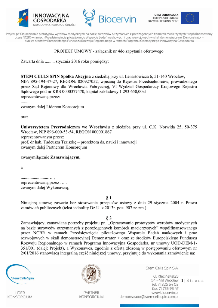 PROJEKT UMOWY - załącznik nr 4do zapytania ofertowego Zawarta dnia ......... stycznia 2016 roku pomiędzy: STEM CELLS SPIN Spółka Akcyjna z siedzibą przy ul. Lenartowicza 6, 51-140 Wrocław, NIP: 895-194-47-27, REGON: 020927052, wpisaną do Rejestru Przedsiębiorców, prowadzonego przez Sąd Rejonowy dla Wrocławia Fabrycznej, VI Wydział Gospodarczy Krajowego Rejestru Sądowego pod nr KRS 0000377470, kapitał zakładowy 1 293 650,00zł reprezentowaną przez: ....... zwanym dalej Liderem Konsorcjum oraz Uniwersytetem Przyrodniczym we Wrocławiu z siedzibą przy ul. C.K. Norwida 25, 50-375 Wrocław, NIP 896-000-53-54, REGON 000001867 reprezentowanym przez: prof. dr hab. Tadeusza Trziszkę – prorektora ds. nauki i innowacji zwanym dalej Partnerem Konsorcjum zwanymiłącznie Zamawiającym, a .........................… , reprezentowaną przez … . zwanym dalej Wykonawcą, §1 Niniejszą umowę zawarto bez stosowania przepisów ustawy z dnia 29 stycznia 2004 r. Prawo zamówień publicznych (tekst jednolity Dz.U. z 2013r. poz. 907 ze zm.). §2 Zamawiający, zamawiana potrzeby projektu pn. „Opracowanie prototypów wyrobów medycznych na bazie surowców otrzymanych z porożogennych komórek macierzystych” współfinansowanego przez NCBR w ramach Przedsięwzięcia pilotażowego Wsparcie Badań naukowych i prac rozwojowych w skali demonstracyjnej Demonstrator + oraz ze środków Europejskiego Funduszu Rozwoju Regionalnego w ramach Programu Innowacyjna Gospodarka, nr umowy UOD-DEM-1351/001 (dalej: Projekt), a Wykonawca, zgodnie z ofertą złożoną w postępowaniu ofertowym nr 2/01/2016 stanowiącą integralną część niniejszej umowy, przyjmuje do wykonania zamówienie na: 1|Strona "promocja i upowszechnianie wyników Projektu w obszarach prototypów wyrobów medycznych, instalacji demonstracyjnej i wyników przeprowadzonych badań naukowych ". Zakres prac obejmuje: 1. Przygotowanie strategii PR i medialnej upowszechniania wyników Projektu w obszarach prototypów wyrobów medycznych, instalacji demonstracyjnej i wyników przeprowadzonych badań naukowych w mediach i bezpośrednich relacjach z przedstawicielami branż docelowych. 2. Obsługa medialna: nawiązanie kontaktów z dziennikarzami, aranżacja wywiadów i spotkań 3. Przygotowanie i dystrybucja informacji prasowej podsumowującej Projekt 4. Promocja Projektu w mediach, w tym publikacje wideo na serwisach ogólnopolskich (np. onet.pl, gazeta.pl) 5. Opracowanie materiałów do promocji Projektu i jego wyników w social media: relacje z liderami opinii (nauka, innowacje) 6. Realizacja zaakceptowanej strategii upowszechniania wyników Projektu. 7. Organizacja roadshow przekazującego wyniki Projektu dla podmiotów z branży mogącej rynkowo wykorzystać wyniki Projektu §3 Wykonawca zobowiązuje się wykonać przedmiot zamówienia określony w § 2 w terminie do 18.03.2016 r. W przypadku gdyby którykolwiek z przedmiotów powstałych przy wykonywaniu zamówienia miał charakter utworu Wykonawca oświadcza, że przekazuje majątkowe prawa autorskie do niego Zamawiającemu. Z tytułu przekazania praw autorskich Wykonawcy nie przysługuje dodatkowe wynagrodzenie. 1. 2. §4 Cena za wykonanie zamówienia, o którym mowa w § 2 wynosi ........ zł netto +23 %VAT (tj............ zł) tj. ................. zł brutto (słownie: .................. złotych). Należność Wykonawcy zostanie uregulowana przez Zamawiającego na podstawie faktur wystawionych po podpisaniu przez strony protokołu odbioru w następujący sposób: a) płatnikiem faktury VAT obejmującej 15% należności za wykonanie usługi w wysokości ........ zł netto + 23 % VAT(tj............ zł) tj. łącznie ................. zł brutto (słownie: .................. złotych) będzie Stem Cells Spin S.A. jako Lider Konsorcjum b) płatnikiem obejmującej 85% należności za wykonanie usługi faktury VAT w wysokości ........ zł netto + 23 % VAT(tj............ zł) tj. łącznie ................. zł brutto (słownie: .................. złotych) będzie Uniwersytet Przyrodniczy jako Partner Konsorcjum Kwota określona w ust. 1 jest ceną ryczałtową za wykonanie wszystkich usług będących przedmiotem zamówienia, określonych w § 2 niniejszej umowy. 2|Strona 3. Wynagrodzenie, o którym mowa w ust. 1 uwzględnia wszelkie ryzyka i odpowiedzialność Wykonawcy za prawidłowe oszacowanie wszystkich kosztów związanych z wykonaniem przedmiotu zamówienia. 4. W przypadku gdy Wykonawca nie opracuje i nie przedłoży Zamawiającemu strategii PR i medialnej rozpowszechniania wyników Projektu, o której mowa w punkcie 1 zakresu prac określonego w par 2 Umowy w zadeklarowanym w złożonej ofercie terminie, Wykonawca zapłaci Zamawiającemu karę umowną w wysokości 20% wartości całego należnego wynagrodzenia brutto. 5. W przypadku gdy Wykonawca nie przeprowadzi dla zadeklarowanej w złożonej ofercie ilości podmiotów roadshow prezentującego wyniki Projektu dla podmiotów z branży mogącej rynkowo wykorzystać wyniki Projektu, Wykonawca zapłaci Zamawiającemu karę umowną w wysokości 5% wartości całego należnego wynagrodzenia brutto, za każdy brakujący podmiot. §5 Wynagrodzenie za wykonanie całości usługi będzie płatne przelewem, na wskazany przez Wykonawcę rachunek bankowy w ciągu 14 dni od daty dostarczenia Zamawiającemu prawidłowo wystawionej faktury VAT. §6 1. Zamawiający może odstąpić od umowy w następujących wypadkach: a) W razie naruszenia przez Wykonawcę postanowień umowy i nie usunięcia skutków tego naruszenia w ciągu 7 dni od otrzymania pisemnego wezwania od zamawiającego. b) Gdy Wykonawca z przyczyn leżących po jego stronie nie rozpoczął wykonywania usługi lub przerwał jej wykonywanie i wykonania usługi nie wznowił, mimo wezwania Zamawiającego przez okres dłuższy niż 7 dni c) gdy wykonawca wykonuje przedmiot umowy wbrew postanowieniom złożonej przez niego oferty i niniejszej umowy. d) z przyczyn określonych w