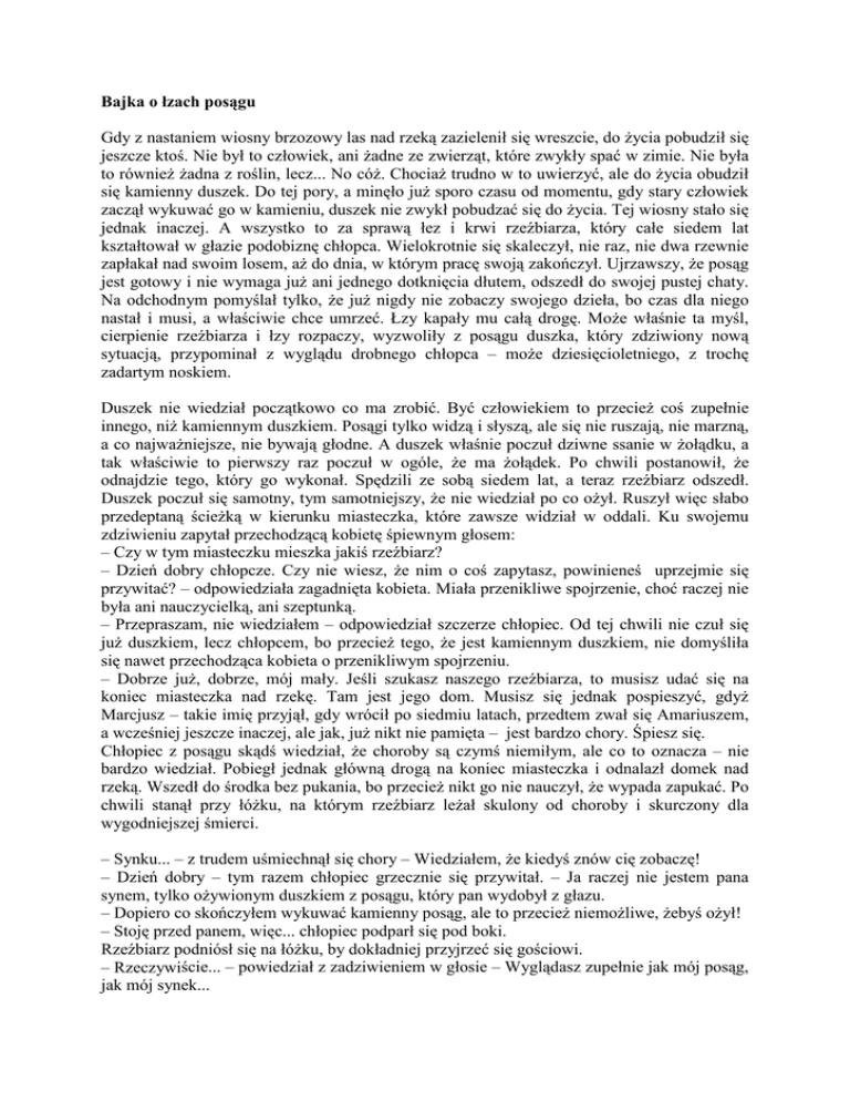 Bajka o łzach posągu Gdy z nastaniem wiosny brzozowy las nad rzeką zazielenił się wreszcie, do życia pobudził się jeszcze ktoś. Nie był to człowiek, ani żadne ze zwierząt, które zwykły spać w zimie. Nie była to również żadna z roślin, lecz... No cóż. Chociaż trudno w to uwierzyć, ale do życia obudził się kamienny duszek. Do tej pory, a minęło już sporo czasu od momentu, gdy stary człowiek zaczął wykuwać go w kamieniu, duszek nie zwykł pobudzać się do życia. Tej wiosny stało się jednak inaczej. A wszystko to za sprawą łez i krwi rzeźbiarza, który całe siedem lat kształtował w głazie podobiznę chłopca. Wielokrotnie się skaleczył, nie raz, nie dwa rzewnie zapłakał nad swoim losem, aż do dnia, w którym pracę swoją zakończył. Ujrzawszy, że posąg jest gotowy i nie wymaga już ani jednego dotknięcia dłutem, odszedł do swojej pustej chaty. Na odchodnym pomyślał tylko, że już nigdy nie zobaczy swojego dzieła, bo czas dla niego nastał i musi, a właściwie chce umrzeć. Łzy kapały mu całą drogę. Może właśnie ta myśl, cierpienie rzeźbiarza i łzy rozpaczy, wyzwoliły z posągu duszka, który zdziwiony nową sytuacją, przypominał z wyglądu drobnego chłopca – może dziesięcioletniego, z trochę zadartym noskiem. Duszek nie wiedział początkowo co ma zrobić. Być człowiekiem to przecież coś zupełnie innego, niż kamiennym duszkiem. Posągi tylko widzą i słyszą, ale się nie ruszają, nie marzną, a co najważniejsze, nie bywają głodne. A duszek właśnie poczuł dziwne ssanie w żołądku, a tak właściwie to pierwszy raz poczuł w ogóle, że ma żołądek. Po chwili postanowił, że odnajdzie tego, który go wykonał. Spędzili ze sobą siedem lat, a teraz rzeźbiarz odszedł. Duszek poczuł się samotny, tym samotniejszy, że nie wiedział po co ożył. Ruszył więc słabo przedeptaną ścieżką w kierunku miasteczka, które zawsze widział w oddali. Ku swojemu zdziwieniu zapytał przechodzącą kobietę śpiewnym głosem: – Czy w tym miasteczku mieszka jakiś rzeźbiarz? – Dzień dobry chłopcze. Czy nie wiesz, że nim o coś zapytasz, powinieneś uprzejmie się przywitać? – odpowiedziała zagadnięta kobieta. Miała przenikliwe spojrzenie, choć raczej nie była ani nauczycielką, ani szeptunką. – Przepraszam, nie wiedziałem – odpowiedział szczerze chłopiec. Od tej chwili nie czuł się już duszkiem, lecz chłopcem, bo przecież tego, że jest kamiennym duszkiem, nie domyśliła się nawet przechodząca kobieta o przenikliwym spojrzeniu. – Dobrze już, dobrze, mój mały. Jeśli szukasz naszego rzeźbiarza, to musisz udać się na koniec miasteczka nad rzekę. Tam jest jego dom. Musisz się jednak pospieszyć, gdyż Marcjusz – takie imię przyjął, gdy wrócił po siedmiu latach, przedtem zwał się Amariuszem, a wcześniej jeszcze inaczej, ale jak, już nikt nie pamięta – jest bardzo chory. Śpiesz się. Chłopiec z posągu skądś wiedział, że choroby są czymś niemiłym, ale co to oznacza – nie bardzo wiedział. Pobiegł jednak główną drogą na koniec miasteczka i odnalazł domek nad rzeką. Wszedł do środka bez pukania, bo przecież nikt go nie nauczył, że wypada zapukać. Po chwili stanął przy łóżku, na którym rzeźbiarz leżał skulony od choroby i skurczony dla wygodniejszej śmierci. – Synku... – z trudem uśmiechnął się chory – Wiedziałem, że kiedyś znów cię zobaczę! – Dzień dobry – tym razem chłopiec grzecznie się przywitał. – Ja raczej nie jestem pana synem, tylko ożywionym duszkiem z posągu, który pan wydobył z głazu. – Dopiero co skończyłem wykuwać kamienny posąg, ale to przecież niemożliwe, żebyś ożył! – Stoję przed panem, więc... chłopiec podparł się pod boki. Rzeźbiarz podniósł się na łóżku, by dokładniej przyjrzeć się gościowi. – Rzeczywiście... – powiedział z zadziwieniem w głosie – Wyglądasz zupełnie jak mój posąg, jak mój synek... – Dlaczego pan mnie stworzył?! – duszek w chłopcu przypomniał sobie, po co właściwie odszukał rzeźbiarza. – To długa historia... moje dziecko. Mogę tak do ciebie mówić, bo dla każdego artysty jego dzieła są niczym dzieci. A ty na dodatek jesteś kopią mego synka... A widząc zdziwienie w oczach chłopca, rzeźbiarz dodał: – Usiądź. Na stole jest chleb, mleko... Posil się, bo widzę żeś zdrożony i głodny, a ja ci wszystko opowiem. Gdy chłopiec uporał się z pierwszą skibką chleba i przestał krztusić mlekiem, rzeźbiarz rozpoczął swoją opowieść. – Wiele lat temu miałem żonę. Cudowną i nader miłą kobietę. Po pewnym czasie urodziło nam się dziecko – chłopiec. Był nadzwyczaj uzdolniony, a do tego bardzo wesoły i uczynny – sam wszystkich pytał, czy nie może pomóc im jakąś przysługą. Uwielbiał pływać i to stało się właśnie w rzece. Z pnia pochylonej brzozy skoczył do wody i już nigdy nie wypłynął... W tym miejscu było dość głęboko... Ale wtedy wiosenne wody akurat tutaj porzuciły wielki głaz... Nie znaleźliśmy ciała, a szukali wszyscy z miasteczka, bo nie było chyba nikogo, kto by mojego syna nie lubił. Woda zabrała go ze sobą gdzieś daleko, dalej niż sięgała nasza miłość... Miał dopiero dziesięć lat... Stary człowiek przerwał na chwilę opowieść, bo gardło ścisnął mu ból. Dopiero po chwili dodał: – To były najstraszniejsze chwile mojego życia. Żona załamała się całkowicie i w krótkim czasie umarła z rozpaczy. Myślę, że pękło jej serce... Ja pozostałem wówczas całkowicie sam. Obwiniałem o całą tragedię siebie oraz ten kamień z rzeki. Postanowiłem go zniszczyć, ale gdy już wydobyłem go na brzeg, zobaczyłem w nim rzeźbę. Posąg swojego synka. Dlatego, gdy cię zobaczyłem chłopcze, pomyślałem, że jesteś moim synem... Oto cała historia. Dodam tylko, że posąg postanowiłem postawić w lesie, by za