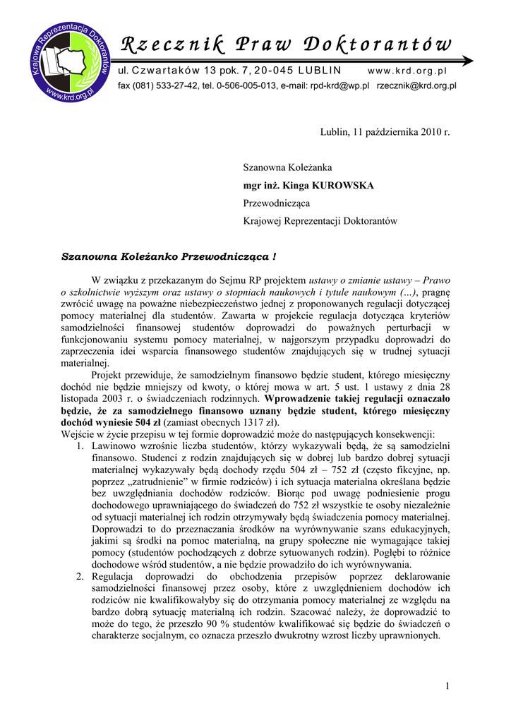 Rzecznik Praw Doktorantów ul. C z w a r t a k ó w 13 pok. 7, 2 0 - 0 4 5 L U B L I N www.krd.org.pl fax (081) 533-27-42, tel. 0-506-005-013, e-mail: [email protected] [email protected] Lublin, 11 października 2010 r. Szanowna Koleżanka mgr inż. Kinga KUROWSKA Przewodnicząca Krajowej Reprezentacji Doktorantów Szanowna Koleżanko Przewodnicząca ! W związku z przekazanym do Sejmu RP projektem ustawy o zmianie ustawy – Prawo o szkolnictwie wyższym oraz ustawy o stopniach naukowych i tytule naukowym (…), pragnę zwrócić uwagę na poważne niebezpieczeństwo jednej z proponowanych regulacji dotyczącej pomocy materialnej dla studentów. Zawarta w projekcie regulacja dotycząca kryteriów samodzielności finansowej studentów doprowadzi do poważnych perturbacji w funkcjonowaniu systemu pomocy materialnej, w najgorszym przypadku doprowadzi do zaprzeczenia idei wsparcia finansowego studentów znajdujących się w trudnej sytuacji materialnej. Projekt przewiduje, że samodzielnym finansowo będzie student, którego miesięczny dochód nie będzie mniejszy od kwoty, o której mowa w art. 5 ust. 1 ustawy z dnia 28 listopada 2003 r. o świadczeniach rodzinnych. Wprowadzenie takiej regulacji oznaczało będzie, że za samodzielnego finansowo uznany będzie student, którego miesięczny dochód wyniesie 504 zł (zamiast obecnych 1317 zł). Wejście w życie przepisu w tej formie doprowadzić może do następujących konsekwencji: 1. Lawinowo wzrośnie liczba studentów, którzy wykazywali będą, że są samodzielni finansowo. Studenci z rodzin znajdujących się w dobrej lub bardzo dobrej sytuacji materialnej wykazywały będą dochody rzędu 504 zł – 752 zł (często fikcyjne, np. poprzez „zatrudnienie” w firmie rodziców) i ich sytuacja materialna określana będzie bez uwzględniania dochodów rodziców. Biorąc pod uwagę podniesienie progu dochodowego uprawniającego do świadczeń do 752 zł wszystkie te osoby niezależnie od sytuacji materialnej ich rodzin otrzymywały będą świadczenia pomocy materialnej. Doprowadzi to do przeznaczania środków na wyrównywanie szans edukacyjnych, jakimi są środki na pomoc materialną, na grupy społeczne nie wymagające takiej pomocy (studentów pochodzących z dobrze sytuowanych rodzin). Pogłębi to różnice dochodowe wśród studentów, a nie będzie prowadziło do ich wyrównywania. 2. Regulacja doprowadzi do obchodzenia przepisów poprzez deklarowanie samodzielności finansowej przez osoby, które z uwzględnieniem dochodów ich rodziców nie kwalifikowałyby się do otrzymania pomocy materialnej ze względu na bardzo dobrą sytuację materialną ich rodzin. Szacować należy, że doprowadzić to może do tego, że przeszło 90 % studentów kwalifikować się będzie do świadczeń o charakterze socjalnym, co oznacza przeszło dwukrotny wzrost liczby uprawnionych. 1 3. Znaczący wzrost liczby uprawnionych (patrz pkt 2) prowadzić musi albo do dwukrotnego zwiększenia nakładów z budżetu państwa na bezzwrotną pomoc materialną – co w obecnej sytuacji budżetowej wydaje się mało prawdopodobne lub do przeszło dwukrotnego obniżenia wysokości świadczeń wypłacanych na uczelniach. 4. Uczelnie nie chcąc doprowadzić do drastycznego obniżenia świadczeń pomocy materialnej ustalały będą próg wsparcia (dochód uprawniający do świadczeń) na poziomie poniżej 504 zł na osobę w rodzinie w miejsce obecnych zazwyczaj 602 zł na osobę w rodzinie (chcąc wykluczyć osoby deklarujące samodzielność finansową). Paradoksalnie więc wprowadzenie regulacji doprowadzić może do rzeczywistego obniżenia progu wsparcia i zmniejszenia liczby studentów faktycznie otrzymujących świadczenia o charakterze socjalnym. Określanie progu samodzielności finansowej poniżej proponowanego maksymalnego progu wsparcia jest metodycznie błędne. Ustalenie progu wsparcia na poziomie 752 zł z założenia słuszne (dochód uprawniający do świadczeń od 2005 r. wzrósł dotychczas zaledwie o 30 zł: z 572 zł do 602 zł) przy ustaleniu kryterium samodzielności finansowej na poziomie 504 zł (a więc poniżej progu wsparcia) prowadzić będzie do fikcyjnego deklarowania samodzielności finansowej przez studentów, którzy z dochodami rodziców przekroczyliby próg wsparcia. Definicja samodzielności finansowej z założenia stanowić miała wyjątek od ogólnej reguły udzielania wsparcia osobom pochodzącym z rodzin o nienajlepszej kondycji finansowej. Dlatego też, jako regułę w rozwiązaniach ustawowych przyjęto ustalanie dochodu na osobę w rodzinie studenta, rodzinę definiując jako: studenta, jego rodziców i uczące się rodzeństwo, a także małżonka i dzieci studenta. Zauważyć trzeba, że rodzice mają ustawowy obowiązek alimentacyjny względem dziecka, w pierwszej więc kolejności to rodzina zobowiązana jest do udzielania sobie wsparcia; dopiero w sytuacji kiedy okazuje się to niemożliwe wkracza państwo ze wsparciem socjalnym. Temu służyły funkcjonujące rozwiązania. Próg samodzielności finansowej był tak ustawiony, aby osoba, która gospodaruje sama i osiąga dochody uprawniające do uznania jej za samodzielną finansowo nie kwalifikowała się do świadczeń pomocy materialnej – co zapobiegało nadużyciom. Dopiero w przypadku posiadania niepracującego małżonka i dziecka osoba samodzielna finansowo powinna się kwalifikować do świadczeń. Ustalenie progu samodzielności na proponowanym poziomie (504 zł) w sposób oczywisty spowoduje, że osoby, które z dochodami utrzymujących je rodziców przekraczałyby próg wsparcia będą czyniły starania o osiągniecie, nawet fikcyjnego, dochodu z przedziału 504 – 752 zł, ażeby uzyskać świadczenia przeznaczone przecież dla osób, które znajdują się w trudnej sytuacji materialnej, przez co należy rozumieć w pierwszej kolejności trudną sytuację ich rodzin, które nie są w stanie udzielić im niezbędnego wsparcia finansowego. Jedyną k