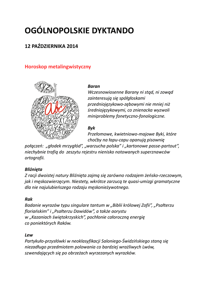 OGÓLNOPOLSKIE DYKTANDO 12 PAŹDZIERNIKA 2014 Horoskop metalingwistyczny Baran Wczesnowiosenne Barany ni stąd, ni zowąd zainteresują się spółgłoskami przedniojęzykowo-zębowymi nie mniej niż średniojęzykowymi, co znienacka wyzwoli miniproblemy fonetyczno-fonologiczne. Byk Przełomowe, kwietniowo-majowe Byki, które choćby na łapu-capu opanują pisownię połączeń: „głodek mrzygłód”, „warzucha polska” i „kartonowe passe-partout”, niechybnie trafią do zeszytu rejestru nienisko notowanych superznawców ortografii. Bliźnięta Z racji dwoistej natury Bliźnięta zajmą się zarówno rodzajem żeńsko-rzeczowym, jak i męskozwierzęcym. Niestety, wkrótce zarzucą te quasi-umizgi gramatyczne dla nie najulubieńszego rodzaju męskonieżywotnego. Rak Badanie wyrazów typu singulare tantum w „Biblii królowej Zofii”, „Psałterzu floriańskim” i „Psałterzu Dawidów”, a także aorystu w „Kazaniach świętokrzyskich”, pochłonie całoroczną energię co poniektórych Raków. Lew Partykuło-przysłówki w neoklasyfikacji Saloniego-Świdzińskiego staną się niezadługo przedmiotem polowania co bardziej wrażliwych Lwów, szwendających się po obrzeżach wyrzezanych wyrazków. Panna Język średnio-wysoko-niemiecki tak do cna zafascynuje niektóre nie zażywne, lecz nieleniwe doprawdy Panny, że wyrzekną się one badania języka cerkiewnosłowiańskiego - z ho, ho jakąż stratą dla tegoż. Waga Niskonakładowy „Słownik warszawski” zafascynuje zwarzonohumorzaste wyważone Wagi bardziej niż tużprzedwojenny niedokończony słownik pod redakcją Tadeusza Lehra-Spławińskiego. No cóż: de gustibus non est disputandum! Skorpion A fe, Skorpiony! Żeby tak preferować hipotaksę, a zaniedbywać parataksę! I to w ujęciu niby-postszoberowskim! Gorze, mości panowie badacze! A łacińska copula, czyli łącznik, to hetka-pętelka? Strzelec Dyktando pułapka nie przeraziłoby nawet nie najbystrzejszych Strzelców, skoroby tylko zanurzyli się w zasady pisowni i nie znużyli się nimi. Ale czyż to zrobią? Koziorożec Przeszło roczny kurs gramatyki generatywno-transformacyjnej nie pozwoli zapewne Koziorożcom zgłębić tajników adiektywizacji imiesłowów, choć przeszłotygodniowe trzyipółdniowe minikonwersatorium mogłoby było ich do tego przysposobić. Wodnik Wysokofrekwencyjne geminaty to temat maksifascynacji Wodników urodzonych nad Morzem Barentsa i nad morzem Marmara, ale nie tych znad morza Celebes. Ryby Średniowysokie progi ortograficzne pokonają śpiewająco Ryby z Ukajali. Résumé: Nie-Ryby i nie-Rak poznają gramatykę na aby-aby. Raki poradzą sobie jako tako, choć, bij zabij, aorystu jak na lekarstwo w tych ekstrazabytkach. A Ryby znikąd, jako etranżerzy, zszarzeją w postdyktandowej apatii.