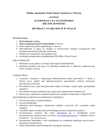 Polska Akademia Nauk Stacja Naukowa w Paryżu poszukuje KANDYDATA NA STANOWISKO RECEPCJONISTKI DO PRACY NA RECEPCJI W STACJI WYMAGANIA: Wykształcenie wyższe, dobra znajomość języka francuskiego w mowie, dobra znajomość języka angielskiego w mowie, doświadczenie w pracy na recepcji w turystycznym obiekcie noclegowym (lub pokojach gościnnych jednostki naukowej), 5. podstawowa znajomość zasad księgowości, 6. swobodne posługiwanie się aplikacjami MS Office (Word, Excel) 1. 2. 3. 4. MILE WIDZIANE: 1. Minimum roczny pobyt we Francji lub krajach frankofońskich, 2. minimum dwuletni staż pracy na zbliżonym stanowisku w jednostce naukowej (np. PAN, uczelnia wyższa). ZAKRES PRAC: 1. Czynności związane z organizacją funkcjonowania pokoi gościnnych w Stacji w Paryżu (m.in. nadzór nad zakwaterowaniem, prowadzenie systemu rezerwacji, prowadzenie rozliczeń) 2. Prowadzenie kasy stacji (przyjmowanie wpłat za noclegi i innych opłat, sporządzanie raportów) 3. Prowadzenie ksiąg inwentarzowych, opisywanie dokumentów finansowych 4. Pomoc przy organizacji wydarzeń naukowych, spotkań i konferencji w Stacji PAN ZGŁOSZENIE KANDYDATA POWINNO ZAWIERAĆ: 1. List motywacyjny w języku polskim, 2. życiorys Kandydata, 3. dokument potwierdzający zakończenie studiów wyższych oraz uzyskania tytułu magistra, 4. certyfikaty bądź oświadczenia potwierdzające poziom znajomości języków, 5. kwestionariusz osobowy dla osoby ubiegającej się o zatrudnienie (wzór kwestionariusza zamieszczony na stronie www.kancelaria.pan.pl w zakładce Druki i formularze – kwestionariusze), 6. oświadczenie kandydata o woli zatrudnienia na warunkach polskiego prawa pracy i ubezpieczeń społecznych, 7. kopie dokumentów potwierdzających wymagany staż pracy, 8. kopie dokumentów potwierdzających posiadane kwalifikacje 9. oświadczenie o wyrażeniu zgody na przetwarzanie danych osobowych do celów rekrutacji. Prosimy dopisać klauzulę: „Wyrażam zgodę na przetwarzanie moich danych osobowych zawartych w mojej ofercie pracy dla potrzeb niezbędnych do realizacji procesu rekrutacji zgodnie z Ustawą z dn. 29.08.1997 roku o ochronie danych osobowych Dz. U. 2014 poz. 1182 ze zm.”. ZGŁOSZENIA należy przesyłać do dnia 24 listopada 2015 r., do godziny 12.00 w wersji elektronicznej na adres: [email protected] oraz listem poleconym na adres: Polska Akademia Nauk Stacja Naukowa w Paryżu 74 rue Lauriston 75 116 Paryż z dopiskiem Kandydatura na stanowisko starszego specjalisty Informujemy, iż zastrzegamy sobie prawo do kontaktu tylko z wybranymi Kandydatami. Wybrani Kandydaci mogą zostać zaproszeni na rozmowę kwalifikacyjną w Warszawie bądź w siedzibie Stacji w Paryżu. Przejazd na koszt własny Kandydata, nocleg w Paryżu na koszt Stacji. Wszelkie pytania należy kierować na adres: [email protected] Praca dla wybranego Kandydata będzie Jego jedynym miejscem pracy
