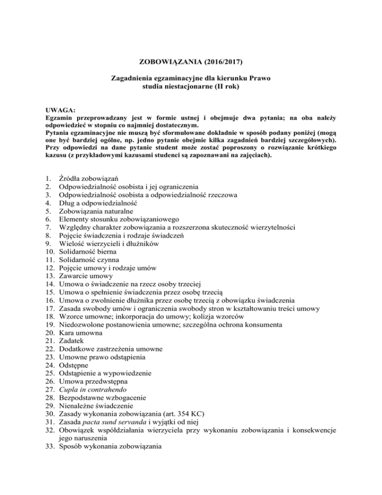 ZOBOWIĄZANIA II ROK - zagadnienia egzaminacyjne 2016.2017