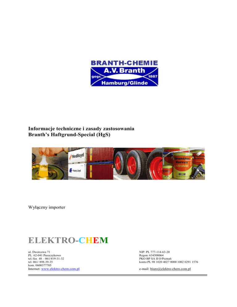 Informacje techniczne i zasady zastosowania Branth’s Haftgrund-Special (HgS) Wyłączny importer ELEKTRO-CHEM ul. Dworcowa 71 PL 62-041 Puszczykowo tel./fax 48 – 061/819-31-32 tel. 061/ 898-39-35 kom. 0600377705 NIP: PL 777-114-63-20 Regon: 634508064 PKO BP SA II O/Poznań konto:PL 98 1020 4027 0000 1002 0291 1576 Internet: www.elektro-chem.com.pl e-mail: [email protected] ELEKTRO-CHEM kontakt: (++48) 0/618193132 kom (++48) 0/600 377 705 Specjalny podkład reagujący Branth’s Haftgrund-Specjal (HgS) Właściwości ogólne Baza: Nie zawierająca PCW. Jest kombinacją środków wiążących z naturalnych i syntetycznych żywic, z przyjaznymi dla środowiska pigmentami, nie zawierającymi ołowiu, cynku i chromianów oraz ze specjalnymi środkami zwiększającymi przyczepność. Rozpuszczalniki bez zawartości węglowodorów aromatycznych i ksylenu. Lepkość: ok. 150s/DIN 4 mm Rozcieńczalnik: Rozcieńczalnik uniwersalny Branth-Chemie (krótki czas schnięcia) Rozcieńczalnik specjalny Branth Chemie (schnięcie opóźnione) Standardowe rozcieńczalniki nitro, rozcieńczalniki uniwersalne, 2-składnikowe itp. nadają się bardziej niż substytut terpentyny, rozcieńczalniki na bazie żywicy syntetycznej lub benzyna lakowa . Ciężar właściwy: ok. 1,35 kg na l Zawartość substancji nielotnych: ok. 70% Wydajność: 9 m2 na I przy 50 my TSD lub 16 m2 na I przy 30 my TSD (rachunkowo). Jedno malowanie umożliwia jednakże otrzymanie wyższych grubości warstw, praktyczne zużycie wynosi dlatego ok. 0,15 I na m2. Odcień: szary ok. RAL 7038, matowy Grubości warstw: możliwość uzyskania warstw farby 120 my TSD na pionowych powierzchniach szklanych bez zacieków. Praktycznie: przy malowaniu pędzlem ok. 30-50 my, przy malowaniu wałkiem ok. 40-60 my, przy natryskiwaniu 40-150 my. Grubość warstwy suchej wynosi ok. 53% grubości warstwy mokrej. Trwałość przy składowaniu: 24 miesiące (w oryginalnych, zamkniętych pojemnikach) Minimalny okres przydatności: data przydatności na puszkach podaje minimalny okres przydatności produktu w oryginalnych, zamkniętych pojemnikach, jeżeli są one składowane w suchym i chłodnym miejscu. Nie jest to data utraty właściwości produktu. Podany minimalny okres przydatności ma Państwu pomóc w zużyciu w pierwszej kolejności starszych puszek. Tak długo, jak farba daje się bez problemu rozmieszać i jest jednorodna, tak długo można ją bezpiecznie stosować. Wskazówki ogólne: podłoże musi być czyste, suche i wytrzymałe. Przed obróbką ostrożnie przemieszać. Przestrzegać podanych na puszce wskazówek odnośnie otwierania pokrywki. Branth’s Haftgrund-Specjal (HgS) 2z3 ELEKTRO-CHEM kontakt: (++48) 0/618193132 kom (++48) 0/600 377 705 Wskazówki odnośnie obróbki Odpowiednie podłoża: powierzchnie metalowe, zwłaszcza nowe i stare ocynkowania, stal szlachetna, aluminium, stal, miedź, twarde tworzywa sztuczne, stare warstwy farby i wiele innych. Można stosować także na powierzchniach odrdzewianych ręcznie. Wstępne przygotowanie podłoża: Odświeżanie powierzchni ocynkowanej: szlifowanie nie jest konieczne, ale zalecane. W zależności od podłoża można spłukać wodą. Białawe sole cynku należy ostrożnie usunąć. W żadnym razie nie stosować wełny stalowej, lecz korundową włókninę z tworzywa sztucznego (Scotch-Britt, Glitzi, Fibral lub inne) i wodę. Nanosić tylko na podłoże odtłuszczone, czyste i suche; zwrócić uwagę na wystarczającą grubość warstw (od 60 my) Na już zardzewiałym i dlatego nierównym podłożu zwrócić uwagę na wystarczającą grubość warstw. Inne podłoża: podłoże musi być czyste, suche i nie reagujące. Obróbka jednokomponentowa: -malowanie pędzlem lub wałkiem w normalnej temperaturze prosto z puszki (w przeciwnym razie minimalnie rozcieńczyć); - konwencjonalne natryskiwanie przy 22-35 s dyszą 1,2-1,8 mm / 4-5 bar (odpowiada dodaniu ok. 8-10 % rozcieńczalnika); - natrysk airless (bezpowietrzny) przy 60-80 s, co najmniej 180 bar, dysza 0,3-0,6, kąt natrysku 40-80° (dodatek rozcieńczalnika ok. 3-5%); Temperatury: idealna temperatura robocza: 18°-25° C możliwa temperatura robocza: -10°-+30°C Schnięcie: przy 20°C/65% względnej wilgotności powietrza - pyłosucha: 15-20 minut - odporna na dotykanie: ok. 60 minut - w pełni wyschnięta: 24 godziny Nie suszyć nadmuchem ciepłego powietrza. Dokładne czasy schnięcia są mocno uzależnione od grubości warstw. Dane odnoszą się do grubości warstwy suchej 50-60 my. Możliwość pokrywania lakierem: - w każdej chwili bez szlifowania lakierem Brantho-Korrux "3 w 1”; - po 1-2 godzinach lub później bez szlifowania standardowymi, jednoskładnikowymi lakierami kryjącymi lub pośrednimi; - po 1 dniu lub później bez szlifowania standardowymi, dwuskładnikowymi lakierami kryjącymi lub pośrednimi. Branth’s Haftgrund-Specjal (HgS) 3z3