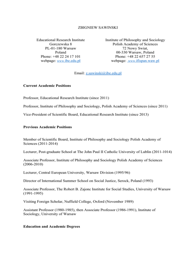 ZBIGNIEW SAWINSKI Educational Research Institute Gorczewska 8 PL-01-180 Warsaw Poland Phone: +48 22 24 17 101 webpage: www.ibe.edu.pl Institute of Philosophy and Sociology Polish Academy of Sciences 72 Nowy Swiat, 00-330 Warsaw, Poland Phone: +48 22 657 27 55 webpage: .www.ifispan.waw.pl Email: [email protected] Current Academic Positions Professor, Educational Research Institute (since 2011) Professor, Institute of Philosophy and Sociology, Polish Academy of Sciences (since 2011) Vice-President of Scientific Board, Educational Research Institute (since 2013) Previous Academic Positions Member of Scientific Board, Institute of Philosophy and Sociology Polish Academy of Sciences (2011-2014) Lecturer, Post-graduate School at The John Paul II Catholic University of Lublin (2011-1014) Associate Professor, Institute of Philosophy and Sociology Polish Academy of Sciences (2006-2010) Lecturer, Central European University, Warsaw Division (1995/96) Director of International Summer School on Social Justice, Serock, Poland (1993) Associate Professor, The Robert B. Zajonc Institute for Social Studies, University of Warsaw (1991-1995) Visiting Foreign Scholar, Nuffield College, Oxford (November 1989) Assistant Professor (1980-1985), then Associate Professor (1986-1991), Institute of Sociology, University of Warsaw Education and Academic Degrees 2 Dr Hab.: Institute of Philosophy and Sociology, Polish Academy of Sciences, Social Sciences/Sociology, 2010 Habilitation Thesis: Zastosowania tablic w badaniach zjawisk spolecznych [The use of methods based on cross-tabulations in social studies] Head of Habilitation Committee: Wlodzimierz Wesolowski; Reviewers: Jaroslaw Gorniak, Grzegorz Lissowski Bogdan W. Mach, Kazimierz M. Slomczynski Ph.D.: University of Warsaw, Humanities, 1986 Dissertation: Pomiar i skalowanie wyksztalcenia w badaniach socjologicznych [The Measurement and Scaling of Education in Sociological Surveys] Dissertation Committee: Wieslaw Wisniewski, Wlodzimierz Wesolowski, Jan Lutynski M.A.: University of Warsaw, Institute of Sociology, Sociology, 1979 Master’s Thesis: Koncepcja maksymalizacji wspolczynnikow korelacji [A concept of maximizing correlations] M.A. Committee: Grzegorz Lissowski, Piotr Hellman Professional Interests Social Stratification and Mobility, Educational Inequality, Methodology of Cross-National Research Publications (A) Monographs and Edited Books Domanski, Henryk, Zbigniew Karpinski, Artur Pokropek, Dariusz Przybysz, Zbigniew Sawinski, Kazimierz M. Slomczynski, Rafal Trzcinski. 2012. Metodologia Badan nad Stratyfikacja Spoleczna [Methodology of the Social Stratification Research]. Warsaw: Scholar Publishing, Pp. 324. Sawinski, Zbigniew. 2010. Zastosowania Tablic w Badaniach Zjawisk Spolecznych [The Use of Methods Based on Cross-tabulations in Social Studies]. Warsaw: IFiS Publishers, Pp. 400. Domanski, Henryk, Zbigniew Sawinski, and Kazimierz M. Slomczynski. 2009. Sociological Tools Measuring Occupations: New Classification and Scales. Warsaw: IFiS Publishers. Pp. 332. Domanski, Henryk, Zbigniew Sawinski, and Kazimierz M. Slomczynski. 2007. Nowa Klasyfikacja i Skale Zawodόw. Socjologiczne Wskazniki Pozycji Spolecznej w Polsce [New Occupational Classification and Occupational Scales: Sociological Indicators of Social Position in Poland]. Warsaw: IFiS Publishers. Pp. 337. 3 Sztabinski, Pawel B., Zbigniew Sawinski, Franciszek Sztabinski (Eds.) 2005. Fieldwork Jest Sztuka [Art of the Fieldwork]. Warsaw: IFiS Publishers, Pp. 458. Sztabinski, Pawel B., Franciszek Sztabinski, Zbigniew Sawinski, (Eds.) Nowe Metody, Nowe Podejscia Badawcze w Naukach Spolecznych [New Methods and New Approaches in Social Science]. Warsaw: IFiS Publishers, Pp. 271. Sawinski, Zbigniew, Pawel B. Sztabinski, Franciszek Sztabinski (Eds.) 2000. Podrecznik Ankietera [Interviewer’s Handbook]. Warsaw: IFiS Publishers. Pp. 326. Cichomski, Bogdan, Zbigniew Sawinski. 1993. Polish General Social Survey 1992-1993: Cumulative Codebook. Warsaw: Institute for Social Studies. Pp. 307. Danilowicz, Pawel, Zbigniew Sawinski, Franciszek Sztabinski, Pawel B. Sztabinski, Andrzej P. Wejland. 1992. Podrecznik Socjologicznych Badan Ankietowych [Handbook of Sociological Surveys]. Warsaw: Institute of Philosophy and Sociology, Polish Academy of Sciences, Pp. 173. Domanski, Henryk, Zbigniew Sawinski. 1991. Wzory Prestizu a Struktura Spoleczna [The Patterns of Prestige and Social Structure]. Wroclaw: Ossolineum. Pp. 248. Slomczynski, Kazimierz M., Ireneusz Bialecki, Henryk Domanski, Krystyna Janicka, Bogdan Mach, Zbigniew Sawinski, Joanna Sikorska, and Wojciech Zaborowski. 1989. Struktura Spoleczna: Schemat Teoretyczny i Warsztat Badawczy [Social Structure: Theoretical Framework and Research Methods]. Warsaw: Institute of Philosophy and Sociology, Polish Academy of Sciences. Pp. 209. Sawinski, Zbigniew, Henryk Domanski. 1986. Wymiary Struktury Spolecznej [Dimensions of Social Structure]. Wroclaw: Ossolineum. Pp. 184. Sawinski, Zbigniew. 1986. Pomiar i Skalowanie Wyksztalcenia w Badaniach Spolecznych [The Measurement and Scaling of Education in Sociological Surveys]. Warsaw: University of Warsaw Publishers. Pp. 462. (B) Reviewed articles Sawinski, Zbigniew. 2014. Social Trust in Education in European Countries, 2002–2010. Edukacja 2014, No. 5(130): 19-39. Sawinski, Zbigniew. 2013. The International Standard Classification of Education ISCED: the Standard from Sevrès or Satan’s Trick. Edukacja 2013, No. 1: 115-134. Kazimierz M. Slomczynski, Irina Tomescu-Dubrow, and Zbigniew Sawinski. 2012. Modeling Occupational Careers for a Turbulent Economy: From Simple to Compex Approaches. International Journal of Sociology, Vol. 42 (Winter 2012-13), No. 4, pp. 56-70. Domanski, Henryk, Zbigniew Sawinski. 2012. Sprawiedliwe nierownosci zarobkow. Studia Socjologiczne 2012, No. 3 (206): 7-27. 4 Domanski, Henryk, Zbigniew Sawinski, Kazimierz M. Slomczynski. 2010. Prestiz zawodow w obliczu zmian spolecznych: 1958-2008. Studia Socjolo