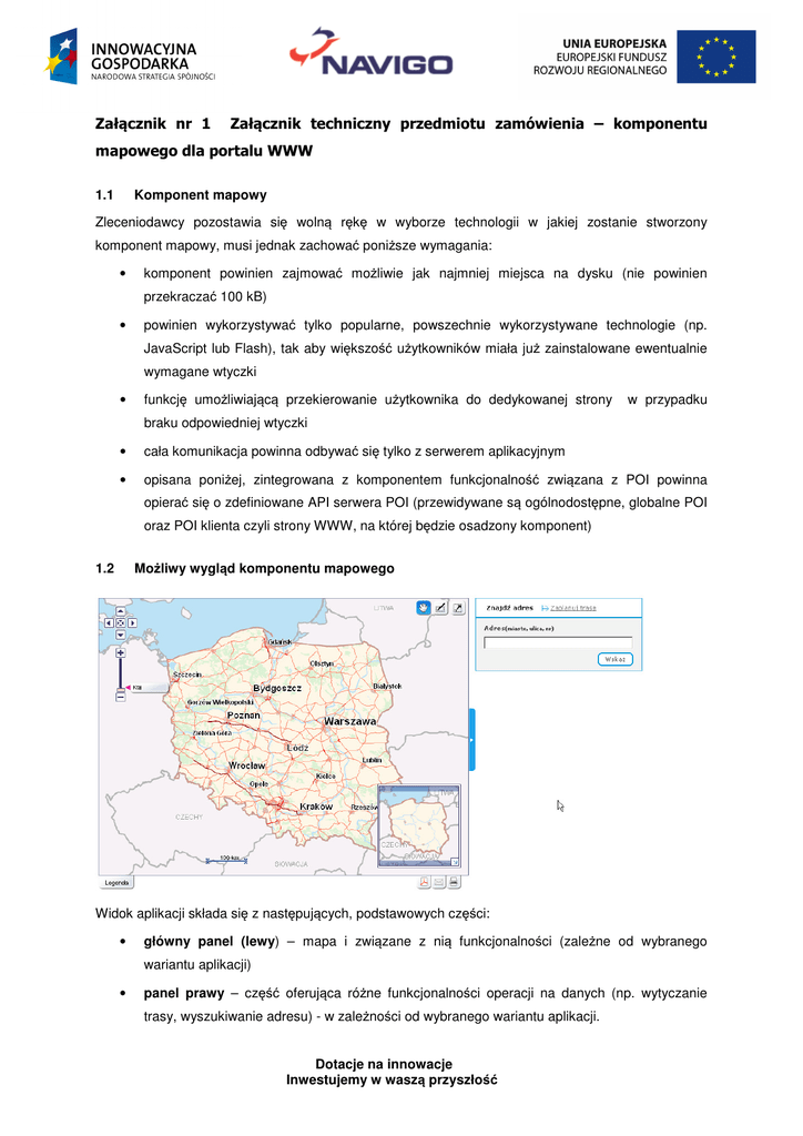 Załącznik nr 1 Załącznik techniczny przedmiotu zamówienia – komponentu mapowego dla portalu WWW 1.1 Komponent mapowy Zleceniodawcy pozostawia się wolną rękę w wyborze technologii w jakiej zostanie stworzony komponent mapowy, musi jednak zachować poniższe wymagania: • komponent powinien zajmować możliwie jak najmniej miejsca na dysku (nie powinien przekraczać 100 kB) • powinien wykorzystywać tylko popularne, powszechnie wykorzystywane technologie (np. JavaScript lub Flash), tak aby większość użytkowników miała już zainstalowane ewentualnie wymagane wtyczki • funkcję umożliwiającą przekierowanie użytkownika do dedykowanej strony w przypadku braku odpowiedniej wtyczki • cała komunikacja powinna odbywać się tylko z serwerem aplikacyjnym • opisana poniżej, zintegrowana z komponentem funkcjonalność związana z POI powinna opierać się o zdefiniowane API serwera POI (przewidywane są ogólnodostępne, globalne POI oraz POI klienta czyli strony WWW, na której będzie osadzony komponent) 1.2 Możliwy wygląd komponentu mapowego Widok aplikacji składa się z następujących, podstawowych części: • główny panel (lewy) – mapa i związane z nią funkcjonalności (zależne od wybranego wariantu aplikacji) • panel prawy – część oferująca różne funkcjonalności operacji na danych (np. wytyczanie trasy, wyszukiwanie adresu) - w zależności od wybranego wariantu aplikacji. Dotacje na innowacje Inwestujemy w waszą przyszłość Mapa Lewy panel (mapa) składa się z następujących elementów: • główny obszar mapy (prezentacja samej mapy) • elementy nawigacji na mapie: • suwak umożliwiający zmianę prezentowanego obszaru (jego zakres i skalę) • ikony nawigacyjne do przełączania się w określony tryb nawigacji • pomniejszony podgląd mapy • podziałka • przycisk umożliwiający powiększenie / zmniejszenie obszaru mapy na stronie www, powodując zajęcie przez mapę obszaru prawego panelu Dotacje na innowacje Inwestujemy w waszą przyszłość 1.3 Funkcjonalność komponentu mapowego Mapy Przesuwanie obszaru mapy Zmiana skali mapy Rozszerzanie panelu mapy (funkcja aktywna tylko, gdy używany jest panel boczny) Grafika jako oznaczenie POI Prosty opis POI w dymku Zaawansowany opis POI (dymek szczegółowy) Podgląd mapy Ikona jako oznaczenie kategorii / podkategorii POI Możliwość dodania pól zawierających dodatkowe informacje (prezentowane w dymku szczegółowym) Operacje na danych Prezentacja POI Wybór POI z wykorzystaniem wyszukiwarki POI Wyszukanie adresu Prezentacja trasy dojazdu Szukaj w pobliżu Znajdź najbliższe POI Wybór POI według kategorii Przyporządkowanie skali dla POI lub określonej grupy POI Zmiana trasy bezpośrednio na mapie (drag and drop) Prezentacja punktów POI • POI są oznaczone symbolem graficznym – ikoną (ikony mogą być różne w zależności od kategorii i podkategorii) • W aplikacji wyświetlają się dwa rodzaje dymków zawierających informacje na temat danego punktu: • dymek uproszczony – widoczny po najechaniu myszką na ikonę POI; wyświetla w głównym obszarze mapy podstawowe informacje na jej temat (nazwa, adres) Dotacje na innowacje Inwestujemy w waszą przyszłość • dymek szczegółowy - widoczny po kliknięciu w myszką w ikonę POI; zawiera dodatkowe informacje na temat punktu, włącznie z fragmentem mapy i grafikami związanymi z danym punktem. Zawartość dymku szczegółowego jest określana przez schemat XML. Kategorie / Podkategorie Komponent oferuje możliwość podziału POI na kategorie i podkategorie. Po wybraniu danej kategorii, internaucie wyświetlane są tylko należące do niej punkty. Można w ten sposób prezentować bardziej odpowiadające potrzebom użytkowników informacje, 1.4 Wytyczanie trasy Funkcjonalność ta pozwala wyznaczyć optymalną trasę pomiędzy dwoma punktami. Definiowanie trasy polega na podaniu adresu punktu początku i końca trasy oraz (opcjonalnie) punktów pośrednich, które mają znaleźć się na definiowanej trasie. Adres można wyznaczać korzystając z panelu do jego wpisania lub klikając w wybranym miejscu mapy prawym przyciskiem myszy - rozwinięty zostanie wówczas panel umożliwiający wskazanie na mapie punktu: początku, końca trasy lub punktu pośredniego. Trasa wyznaczana jest przez serwer, który do komponentu dostarcza jej geometrię. Dotacje na innowacje Inwestujemy w waszą przyszłość Wytyczenie trasy przy wykorzystaniu formularza „Wytycz trasę”: Opis panelu • „Start” – miejsce na wpisanie adresu początku trasy • „Stop” – miejsce na wpisanie adresu końca trasy • Dodaj przejazdem – umożliwia dodanie adresów punktów pośrednich. Dodany punkt można również usunąć korzystając z funkcji „Usuń” widocznej przy każdym wprowadzonym punkcie pośrednim. • Droga powrotna – pozwala na wyświetlenie wprowadzonej trasy w odwrotnym kierunku • Rodzaj trasy: najszybsza, najprostsza, najkrótsza, piesza (domyślnie ustawiona jest „najprostsza”) – ogranicza wytyczanie trasy do głównych dróg Najbliższy punkt POI Funkcjonalność ta pozwala na znalezienie jednego POI leżącego najbliżej zdefiniowanego przez Internautę adresu. Dla przykładu internauta może poszukiwać najbliższego punktu ze zdefiniowaną wcześniej ofertą. Wyszukiwanie adresu Wyszukanie polega na podaniu adresu, jaki ma być pokazany na mapie. Adres można wyznaczać korzystając z panelu do jego wpisania lub klikając w wybranym miejscu mapy prawym przyciskiem Dotacje na innowacje Inwestujemy w waszą przyszłość myszy - rozwinięte zostanie wówczas menu umożliwiające wskazanie punktu na mapie. W sytuacji gdy wskazany zostanie punkt, do którego nie jest przypisany w bazie żaden adres (np. na terenie lasu, jeziora), wskazany punkt jest przyporządkowany najbliższemu istniejącemu w bazie adresowi. Analogicznie aplikacja zachowa się, jeśli korzystając z panelu wyszukiwania 
