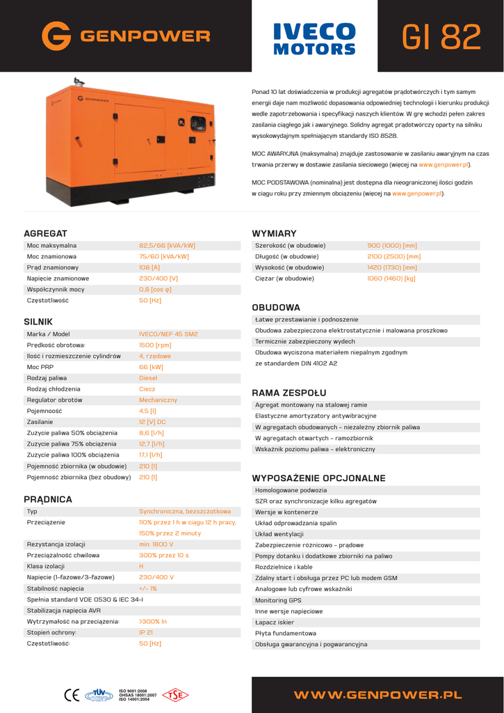 GI 82 Ponad 10 lat doświadczenia w produkcji agregatów prądotwórczych i tym samym energii daje nam możliwość dopasowania odpowiedniej technologii i kierunku produkcji wedle zapotrzebowania i specyfikacji naszych klientów. W grę wchodzi pełen zakres zasilania ciągłego jak i awaryjnego. Solidny agregat prądotwórczy oparty na silniku wysokowydajnym spełniającym standardy ISO 8528. MOC AWARYJNA (maksymalna) znajduje zastosowanie w zasilaniu awaryjnym na czas trwania przerwy w dostawie zasilania sieciowego (więcej na www.genpower.pl). MOC PODSTAWOWA (nominalna) jest dostępna dla nieograniczonej ilości godzin w ciągu roku przy zmiennym obciążeniu (więcej na www.genpower.pl). AGREGAT WYMIARY Moc maksymalna 82,5/66 [kVA/kW] Szerokość (w obudowie) 900 (1000) [mm] Moc znamionowa 75/60 [kVA/kW] Długość (w obudowie) 2100 (2500) [mm] Prąd znamionowy 108 [А] Wysokość (w obudowie) 1420 (1730) [mm] Napięcie znamionowe 230/400 [V] Ciężar (w obudowie) 1060 (1460) [kg] Współczynnik mocy 0,8 [cos φ] Częstotliwość 50 [Hz] OBUDOWA Łatwe przestawianie i podnoszenie SILNIK Marka / Model IVECO/NEF 45 SM2 Prędkość obrotowa: 1500 [rpm] Ilość i rozmieszczenie cylindrów 4, rzędowe Moc PRP 66 [kW] Rodzaj paliwa Diesel Rodzaj chłodzenia Ciecz Regulator obrotów Mechaniczny Pojemnoość 4,5 [l] Zasilanie 12 [V] DC Zużycie paliwa 50% obciążenia 8,6 [l/h] Zużycie paliwa 75% obciążenia 12,7 [l/h] Zużycie paliwa 100% obciążenia 17,1 [l/h] Pojemność zbiornika (w obudowie) 210 [l] Pojemność zbiornika (bez obudowy) 210 [l] Obudowa zabezpieczona elektrostatycznie i malowana proszkowo Termicznie zabezpieczony wydech Obudowa wyciszona materiałem niepalnym zgodnym ze standardem DIN 4102 A2 RAMA ZESPOŁU Agregat montowany na stalowej ramie Elastyczne amortyzatory antywibracyjne W agregatach obudowanych - niezależny zbiornik paliwa W agregatach otwartych - ramozbiornik Wskaźnik poziomu paliwa - elektroniczny WYPOSAŻENIE OPCJONALNE Homologowane podwozia PRĄDNICA SZR oraz synchronizacje kilku agregatów Typ Synchroniczna, bezszczotkowa Wersje w kontenerze Przeciążenie 110% przez 1 h w ciągu 12 h pracy, Układ odprowadzania spalin 150% przez 2 minuty Układ wentylacji Rezystancja izolacji min. 1800 V Zabezpieczenie różnicowo - prądowe Przeciążalność chwilowa 300% przez 10 s Pompy dotanku i dodatkowe zbiorniki na paliwo Klasa izolacji H Rozdzielnice i kable Napięcie (1-fazowe/3-fazowe) 230/400 V Zdalny start i obsługa przez PC lub modem GSM Stabilność napięcia +/- 1% Analogowe lub cyfrowe wskaźniki Spełnia standard VDE 0530 & IEC 34-I Monitoring GPS Stabilizacja napięcia AVR Inne wersje napięciowe Wytrzymałość na przeciążenia: >300% ln Łapacz iskier Stopień ochrony: IP 21 Płyta fundamentowa Częstotliwość: 50 [Hz] Obsługa gwarancyjna i pogwarancyjna GI 82 DANE EKSPLOATACYJNE Rodzaj oleju 15W40 MOBIL Ilość oleju w układzie smarowania L 12,8 Zużycie oleju (na 1kW) % 0,01 Okres pomiędzy wymianami oleju mth/rok 500/1 Rodzaj płynu chłodzącego (glikolowy) Antifreeze PETRYGO Iloość płynu chłodzącego L 18,5 Okres pomiędzy wymianami płynu mth/rok 1000/1 Pojemnoość akumulatora rozruchowego Ah 100 Zgodnoość paliwa z normą EN 590 Zużycie paliwa 100% obciążenia L/h 17,1 Zużycie paliwa 75% obciążenia L/h 12,7 Zużycie paliwa 50% obciążenia L/h 8,6 Wymiana filtrów paliwa mth/rok 500/1 Wymiana filtrów oleju mth/rok 500/1 WYTYCZNE INSTALACYJNE Sposób odbioru mocy Zaciski wyłącznika głównego Przewody odbioru mocy giętka linka [mm2] 5x35 (<30mb) Przewody automatyki SZR giętka linka [mm ] 7x1,5 (<30mb) Przewody potrzeb własnych giętka linka [mm2] 3x2,5 (<30mb) Średnica kolektora wydechu silnika mm 88,9 Średnica wydechu (max 7mb, 4 kol. 90 st.) mm 88,9 Średnica wydechu (max 15mb, 4 kol. 90 st.) mm 88,9 Wysokość części czynnej chłodnicy mm 712 Szerokość części czynnej chłodnicy mm 470 Powierzchnia wyrzutni powietrza m2 0,42 Powierzchnia czerpni powietrza m 0,42 Wymiary płyty fundamentowej mm 1300x2800 2 2 PANEL KONTROLNY Elastyczny i wielofunkcyjny wyświetlacz LCD Prędkość silnika Magnetotermiczny wyłącznik 3-polowy Całkowita ochrona silnika oraz jednostki generatora Wyłącznik bezpieczeństwa Wykrywanie napięcia skutecznego Automatyczny start Wykrywanie prądu/mocy skutecznej Ładowarka akumulatorów Licznik kWh Przystosowany do pracy z SZR: autostart i stop Licznik startów silnika, godzin pracy (mth), konserwacji Woltomierz Dowolnie konfigurowalne wejścia cyfrowe Amperomierz Dowolnie konfigurowalne wejścia analogowe Wskaźnik poziomu płynu chłodniczego Dowolnie konfigurowalne wejścia przekaźnikowe Wskaźnik poziomu oleju Konfiguracja przez panel czołowy lub PC Temperatura silnika Obsługa wielu języków, w tym Polski Ciśnienie oleju Certyfikat morski GL, LE, zgodność CE GENPOWER rezerwuje sobie prawo do modyfikacji produktów w każdym czasie, ze względu na nieustanne ich udoskonalanie. Z tego względu informacje zawarte w tym dokumencie mogą ulec zmianie.