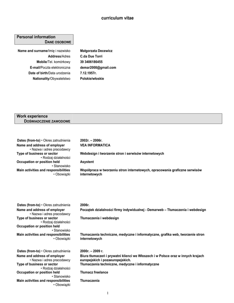 curriculum vitae Personal information DANE OSOBOWE Name and surname/Imię i nazwisko Małgorzata Decewicz Address/Adres C.da Due Torri Mobile/Tel. komórkowy 39 3406186455 E-mail/Poczta elektroniczna Date of birth/Data urodzenia Nationality/Obywatelstwo [email protected] 7.12.1957r. Polskie/włoskie Work experience DOŚWIADCZENIE ZAWODOWE Dates (from-to) • Okres zatrudnienia Name and address of employer • Nazwa i adres pracodawcy Type of business or sector • Rodzaj działalności Occupation or position held • Stanowisko Main activities and responsibilities • Obowiązki Dates (from-to) • Okres zatrudnienia Name and address of employer • Nazwa i adres pracodawcy Type of business or sector • Rodzaj działalności Occupation or position held • Stanowisko Main activities and responsibilities • Obowiązki Dates (from-to) • Okres zatrudnienia Name and address of employer • Nazwa i adres pracodawcy Type of business or sector • Rodzaj działalności Occupation or position held • Stanowisko Main activities and responsibilities • Obowiązki 2002r. – 2006r. VEA INFORMATICA Webdesign i tworzenie stron i serwisów internetowych Asystent Współpraca w tworzeniu stron internetowych, opracowania graficzne serwisów internetowych 2006r. Początek działalności firmy indywidualnej - Demarweb – Tłumaczenia i webdesign Tłumaczenia i webdesign Tłumaczenia techniczne, medyczne i informatyczne, grafika web, tworzenie stron internetowych 2000r. – 2009 r. Biura tłumaczeń i prywatni klienci we Włoszech i w Polsce oraz w innych krajach europejskich i pozaeuropejskich. Tłumaczenia techniczne, medyczne i informatyczne Tłumacz freelance Tłumaczenia 1 Dates (from-to) • Okres zatrudnienia Name and address of employer • Nazwa i adres pracodawcy Type of business or sector • Rodzaj działalności Occupation or position held • Stanowisko Main activities and responsibilities • Obowiązki 2008r. – 2010r. Gazeta dla imigrantów „Mondi Emersi” http://www.mondiemersi.org Tłumaczenia z włoskiego na polski związane z tematyką dotyczącą imigracji Tłumacz freelance Tłumaczenie artykułów, norm prawnych, porad praktycznych, itp. Tłumaczenia z zakresu automatyki – stała współpraca z firmą CAME Cancelli Automatyka Education and training WYKSZTAŁCENIE I SZKOLENIA Dates (from-to) • Okres Name and type of organisation providing education and training • Nazwa szkoły Principal subjects/occupational skills covered • Wydział i specjalizacja Title of qualification awarded • Tytuł zawodowy 1972r. – 1976r. Liceum Ogólnokształcące im. Adama Mickiewicza w Olsztynie – Profil matematyczny Świadectwo dojrzałości Dates (from-to) • Okres Name and type of organisation providing education and training • Nazwa szkoły Principal subjects/occupational skills covered • Wydział i specjalizacja Title of qualification awarded • Tytuł zawodowy 1972r –1981r. –Akademia Medyczna w Gdańsku – Wydział Farmacji Magister Farmacji Dates (from-to) • Okres Name and type of organisation providing education and training • Nazwa szkoły Principal subjects/occupational skills covered • Wydział i specjalizacja Title of qualification awarded • Tytuł zawodowy 29.04.2002r. Europejski Certyfikat Umiejętności Komputerowych (ECDL) Certyfikat ECDL 2 Dates (from-to) • Okres Name and type of organisation providing education and training • Nazwa szkoły Principal subjects/occupational skills covered • Wydział i specjalizacja Title of qualification awarded • Tytuł zawodowy 16.11.2002r. Kurs informatyczny „Internet - zawód webmaster" - Projektowanie, realizacja i konserwacja statycznych i dynamicznych serwisów internetowych przy zastosowaniu najnowszych technologii informatycznych, odbyty w firmie VEA INFORMATICA S.p.A w Messynie Certyfikat uczestnictwa Personal skills and competences UMIEJĘTNOŚCI Mother tongue • Język ojczysty Other languages • Języki obce • poziom czytania • poziom pisania • poziom mówienia Polski Włoski doskonała znajomość doskonała znajomość doskonała znajomość angielski • poziom czytania • poziom pisania • poziom mówienia Technical skills and competences dobry dostateczny dostateczny Odznaczam się doskonałą znajomością obsługi komputera oraz aplikacji MS Office dotyczących edycji i formatowania tekstów, tabel i wykresów. Pracuję także jako webmaster projektując i wykonując strony internetowe. Wykonuję tłumaczenia stron internetowych, posiadam bardzo dobrą orientację w najważniejszych technologiach i protokołach internetowych. Znam kod HTML i inne języki programowania i skrypty stosowane przy kreacji stron internetowych, znam dobrze terminologię stosowaną w Internecie i w dziedzinie informatyki oraz wykonuję bardzo chętnie tłumaczenia plików zawierających TAG lub dotyczących oprogramowania i komputera. Jako webdesigner znam i stosuję oprogramowania graficzne takie jak Macromedia Fireworks i Macromedia FLash MX oraz Adobe Photoshop 3 Additional project-related information Referencje http://www.proz.com/?sp=provider_popup&sp_mode=view&entry_maker_id=134349&eid_s=134 349&float=y Oprogramowanie Narzędzia CAT: MemoQ - SDL Trados – TagEditor – WinAlign- SDLX Worfast Pozostałe opgrogramowanie - Adobe Acrobat Professional 6,0 - PDF2Word – konwertor plików PDF <>Word - OmniPage - program OCR - Archivarius 3000 - Microsoft 2000 - Adobe Photoshop - Macromedia Dreamwear - Macromedia Fireworks - Macromedia Flash Wyrażam zgodę na przetwarzanie moich danych osobowych zgodnie z ustawą z dnia 29 sierpnia 1997 roku o ochronie danych osobowych (Dz.U. nr 133, poz. 883 ze zm.) Messina, 14.12.2011 Malgorzata Decewicz 4