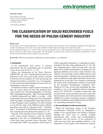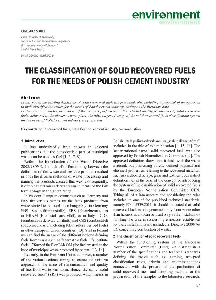 GRZEGORZ SPUREK Kielce University of Technology Faculty of Civil and Environmental Engineering al. Tysiąclecia Państwa Polskiego 7 25-314 Kielce, Poland e-mail: [email protected] THE CLASSIFICATION OF SOLID RECOVERED FUELS FOR THE NEEDS OF POLISH CEMENT INDUSTRY Abstract In this paper, the existing definitions of solid recovered fuels are presented, also including a proposal of an approach to their classification issues for the needs of Polish cement industry, basing on the literature data. In the research chapter, as a result of the analysis performed on the selected quality parameters of solid recovered fuels, delivered to the chosen cement plant, the advantages of usage of the solid recovered fuels classification system for the needs of Polish cement industry are presented. Keywords: solid recovered fuels, classification, cement industry, co-combustion 1. Introduction It has undoubtedly been shown in selected publications that the considerable part of municipal waste can be used as fuel [1, 3, 7, 8]. Before the introduction of the Waste Directive 2008/98/WE, the lack of differentiating between the definition of the waste and residue product resulted in both the diverse methods of waste processing and naming the products created this way. Consequently, it often caused misunderstandings in terms of the law terminology in the given range. In Western European countries such as Germany and Italy the various names for the fuels produced from waste started to be used interchangeably: in Germany SBS (Sekundärbrennstoffe), EBS (Ersatzbrennstoffe) or BRAM (Brennstoff aus Müll), or in Italy - CDR (combustibili derivato di rifiutti) and CSS (combustibili solido secondario, including RDF (refuse derived fuels) in other European Union countries [13]. Still in Poland we can find the usage of the different notions defining fuels from waste such as ”alternative fuels”, ”substitute fuels”, ”formed fuel” or PAKOM (the fuel created on the base of municipal waste protected by patent) [13, 14]. Recently, in the European Union countries, a number of the various actions aiming to create the uniform approach to the issue of standardisation and quality of fuel from waste was taken. Hence, the name ”solid recovered fuels” (SRF) was proposed, which means in Polish „stałe paliwa odzyskane” or „stałe paliwa wtórne” included in the title of this publication [4, 15, 16]. The last mentioned name ”solid recovered fuel” was also approved by Polish Normalization Committee [9]. The approved definition shows that it deals with the waste material, but possessing strictly defined physical and chemical properties, referring to the recovered materials such as cardboard, scraps, glass and textiles. Such a strict definition lies at the base of the concept of introducing the system of the classification of solid recovered fuels by the European Normalization Committee CEN. Taking all of it into account and considering the rules included in one of the published technical standards, namely EN 15359:2011, it should be stated that solid recovered fuels can be generated only from waste other than hazardous and can be used only in the installations fulfilling the criteria concerning emissions established for these installations and included in Directive 2000/76/ EC concerning combustion of waste. 2. The classification of solid recovered fuels Within the functioning system of the European Normalization Committee (CEN) we distinguish a number of the specifications and technical standards defining the issues such as: naming, accepted classification rules, criteria and recommendations connected with the process of the production of solid recovered fuels and sampling methods or the preparation of the samples to the laboratory research. 37 Grzegorz Spurek The majority of the works of CEN connected with the publication of the selected technical specifications and standards concerning solid recovered fuels were completed in 2006. Moreover, in 2011 the works concerning the publication of the selected standards connected with the discussed issue were also finished. The detailed list of the technical specifications and standards updated on a current basis by the European Normalization Committee (CEN) is included on the website www.cen.eu. Currently, in the selected European Union countries, including Poland since 2008, the translation works of the English versions of the technical specifications published by CEN and standards are being done. In the final plan, they will become the reference documents concerning solid recovered fuels, valid in the European Union [9]. The standard EN 15359:2011 „Solid recovered fuels-specifications and classes constitutes one of the most important standards describing the new classification system of solid recovered fuels established by the European Normalization Committee (CEN) [2]. In accordance with the criteria approved in the described standard, the system of the classification of solid recovered fuels depends on the three key parameters defining quality of solid recovered fuels such as: calorific value, chlorine and mercury content. The parameters mentioned above were chosen as the specific ”labels” of solid recovered fuels, taking into consideration the further practical usage of the formed fuel in terms of technological, environmental and economic values. The way of the classification of the solid recovered fuels recommended by CEN and the detailed view of the psychical and chemical analysis of the solid recovered fuels resulting from the mentioned approach enable the people who manage supplies of these fuels in cement plants to receive the reliable information concerning processing usefulness of this material. Finally, it guarantees the success in choosing the best solid recovered fuel in terms of the checked properties and quality. 3. Cement industry in Poland There are 13 cement plants in Poland, equipped with 18 kilns operating in dry-method of burning clinker (o