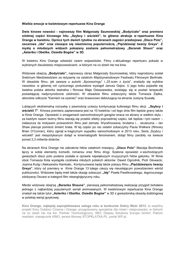 Wielkie emocje w kwietniowym repertuarze Kina Orange Dwie kinowe nowości - najnowszy film Małgorzaty Szumowskiej „Body/ciało” oraz premiera siódmej części kinowego hitu „Szybcy i wściekli”, to główne atrakcje w repertuarze Kina Orange w kwietniu. Oprócz tych dwóch tytułów na ekranach zagości przebojowe „Disco Polo”, oscarowa „Ida” oraz cieszące się niezmienną popularnością „Pięćdziesiąt twarzy Greya”. Z myślą o młodszych widzach pokazany zostanie pełnometrażowy „Baranek Shaun” oraz „Asteriks i Obeliks. Osiedle Bogów” w 3D. W kwietniu Kino Orange odwiedzi osiem województw. Filmy z aktualnego repertuaru pokaże w wybranych dwudziestu miejscowościach, w których na co dzień nie ma kina. Widzowie obejrzą „Body/ciało”, najnowszy obraz Małgorzaty Szumowskiej, który nagrodzony został Srebrnym Niedźwiedziem za reżyserię na ostatnim Międzynarodowym Festiwalu Filmowym Berlinale. W obsadzie filmu, jak zawsze u autorki „Sponsoringu” i „33 scen z życia”, znalazły się wybitne nazwiska: w głównej roli cynicznego prokuratora wystąpił Janusz Gajos. U jego boku pojawiła się świetna polska aktorka teatralna i filmowa Maja Ostaszewska, wcielając się w postać terapeutki posiadającej nadprzyrodzone zdolności. W obsadzie filmu zobaczymy także Tomasza Ziętka, aktorskie odkrycie "Kamieni na szaniec" oraz brawurowo debiutującą na ekranie Justynę Suwałę. Lubiących ekstremalną rozrywkę z pewnością ucieszy kontynuacja kultowego filmu akcji „Szybcy i wściekli 7”. Kinowa premiera zaplanowana jest na 10 kwietnia i od tego dnia film będzie grany także w Kinie Orange. Opowieść o zmaganiach samochodowych gangów wraca na ekrany w wielkim stylu za każdym razem twórcy filmu starają się przebić efekty poprzedniej części, tak będzie i tym razem – zwłaszcza że motywem przewodnim filmu jest zemsta. Wyrafinowana, brutalna i… skuteczna – Ian Shaw planuje pomścić śmierć brata. W tej części po raz ostatni zobaczymy Paula Walkera (filmowy Brian O’Conner), który zginął w tragicznym wypadku samochodowym w 2013 roku. Seria „Szybcy i wściekli” jest niespotykanym dotąd w kinematografii fenomenem, dotąd filmy zarobiły na świecie ponad 2,3 miliarda dolarów. Na ekranach Kina Orange nie zabraknie hitów ostatnich miesięcy. „Disco Polo” Macieja Bochniaka łączy w sobie elementy komedii, romansu oraz filmu drogi. Szalona opowieść o wschodzących gwiazdach disco polo podana została w oprawie największych muzycznych hitów gatunku. W filmie obok Tomasza Kota wystąpiła czołówka młodych polskich aktorów: Dawid Ogrodnik, Piotr Głowacki, Joanna Kulig i Aleksandra Hamkało,. Kontynuowane będą także pokazy filmu „Pięćdziesięciu twarzy Greya”, który od premiery w Kinie Orange 13 lutego cieszy się nieustającym powodzeniem wśród publiczności. Widzowie będą mieli także okazję zobaczyć „Idę” Pawła Pawlikowskiego, tegorocznego zdobywcę Oscara w kategorii film nieanglojęzyczny roku. Młodsi widzowie obejrzą „Baranka Shauna”, pierwszą pełnometrażową realizację przygód bohatera jednego z najbardziej popularnych seriali animowanych. W kwietniowym repertuarze Kina Orange znalazł się także tytuł „Asteriks i Obeliks. Osiedle Bogów” w 3D z gwiazdorską obsadą dubbingową w polskiej wersji językowej. Kino Orange, najlepiej zaprojektowana usługa roku w konkursie Dobry Wzór 2013, to wspólny projekt firmy Outdoor Cinema i Orange, przygotowany specjalnie dla miast i miejscowości, w których na co dzień nie ma kin. Partner Technologiczny: NEC Display Solutions Europe GmbH. Patroni medialni: miesięcznik KINO, serwis filmowy STOPKLATKA.PL, portal WP.pl.