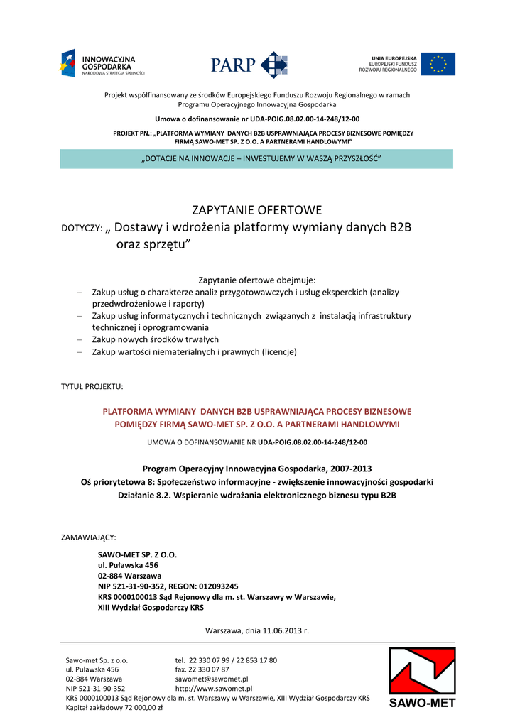 Projekt współfinansowany ze środków Europejskiego Funduszu Rozwoju Regionalnego w ramach Programu Operacyjnego Innowacyjna Gospodarka Umowa o dofinansowanie nr UDA-POIG.08.02.00-14-248/12-00 PROJEKT PN.: „PLATFORMA WYMIANY DANYCH B2B USPRAWNIAJĄCA PROCESY BIZNESOWE POMIĘDZY FIRMĄ SAWO-MET SP. Z O.O. A PARTNERAMI HANDLOWYMI” „DOTACJE NA INNOWACJE – INWESTUJEMY W WASZĄ PRZYSZŁOŚĆ” ZAPYTANIE OFERTOWE DOTYCZY: „ Dostawy i wdrożenia platformy wymiany danych B2B oraz sprzętu” − − − − Zapytanie ofertowe obejmuje: Zakup usług o charakterze analiz przygotowawczych i usług eksperckich (analizy przedwdrożeniowe i raporty) Zakup usług informatycznych i technicznych związanych z instalacją infrastruktury technicznej i oprogramowania Zakup nowych środków trwałych Zakup wartości niematerialnych i prawnych (licencje) TYTUŁ PROJEKTU: PLATFORMA WYMIANY DANYCH B2B USPRAWNIAJĄCA PROCESY BIZNESOWE POMIĘDZY FIRMĄ SAWO-MET SP. Z O.O. A PARTNERAMI HANDLOWYMI UMOWA O DOFINANSOWANIE NR UDA-POIG.08.02.00-14-248/12-00 Program Operacyjny Innowacyjna Gospodarka, 2007-2013 Oś priorytetowa 8: Społeczeństwo informacyjne - zwiększenie innowacyjności gospodarki Działanie 8.2. Wspieranie wdrażania elektronicznego biznesu typu B2B ZAMAWIAJĄCY: SAWO-MET SP. Z O.O. ul. Puławska 456 02-884 Warszawa NIP 521-31-90-352, REGON: 012093245 KRS 0000100013 Sąd Rejonowy dla m. st. Warszawy w Warszawie, XIII Wydział Gospodarczy KRS Warszawa, dnia 11.06.2013 r. Sawo-met Sp. z o.o. tel. 22 330 07 99 / 22 853 17 80 ul. Puławska 456 fax. 22 330 07 87 02-884 Warszawa [email protected] NIP 521-31-90-352 http://www.sawomet.pl KRS 0000100013 Sąd Rejonowy dla m. st. Warszawy w Warszawie, XIII Wydział Gospodarczy KRS Kapitał zakładowy 72 000,00 zł Projekt współfinansowany ze środków Europejskiego Funduszu Rozwoju Regionalnego w ramach Programu Operacyjnego Innowacyjna Gospodarka Umowa o dofinansowanie nr UDA-POIG.08.02.00-14-248/12-00 PROJEKT PN.: „PLATFORMA WYMIANY DANYCH B2B USPRAWNIAJĄCA PROCESY BIZNESOWE POMIĘDZY FIRMĄ SAWO-MET SP. Z O.O. A PARTNERAMI HANDLOWYMI” „DOTACJE NA INNOWACJE – INWESTUJEMY W WASZĄ PRZYSZŁOŚĆ” Warszawa, dnia 11.06.2013 r. POIG 8.2/SAWOMET – ZAPYTANIE OFERTOWE w związku z przygotowaniami do realizacji projektu pn. „Platforma wymiany danych B2B usprawniająca procesy biznesowe pomiędzy firmą Sawo-met Sp. z o.o. a partnerami handlowymi” współfinansowanego ze środków Europejskiego Funduszu Rozwoju Regionalnego w ramach Programu Operacyjnego Innowacyjna Gospodarka, Działanie 8.2 - Wspieranie wdrażania elektronicznego biznesu typu B2B, Umowa o dofinansowanie o numerze: UDA-POIG.08.02.00-14248/12-00 firma Sawo-Met Sp. z o.o. zaprasza do składania ofert na „ Dostawę i wdrożenie platformy wymiany danych B2B oraz sprzętu”. 1. TRYB ZAMÓWIENIA Zamawiający nie jest zobowiązany do stosowania ustawy z dnia 29 stycznia 2004 r. Prawo zamówień publicznych (tekst jednolity Dz. U. z 2010r. Nr 113 poz. 759 ze zmianami). Zamówienie nie podlega przepisom ustawy z dnia 29 stycznia 2004 r. Prawo zamówień publicznych (tekst jednolity Dz. U. z 2010r. Nr 113 poz. 759 ze zmianami) jak również protestom i odwołaniom. 2. PRZEDMIOT ZAMÓWIENIA Przedmiotem zamówienia jest: 1) Zakup usług o charakterze analiz przygotowawczych i usług eksperckich (analizy przedwdrożeniowe i raporty) 2) Zakup usług informatycznych i technicznych związanych z instalacją infrastruktury technicznej i oprogramowania 3) Zakup nowych środków trwałych 4) Zakup wartości niematerialnych i prawnych (licencje) zgodnie ze Szczegółowym Opisem Przedmiotu Zamówienia stanowiącym Załącznik nr 1 niniejszego zapytania 3. DOKUMENTY ORAZ WYMOGI WYMAGANE OD WYKONAWCÓW 1) Wykonawca zobowiązany jest: Sawo-met Sp. z o.o. tel. 22 330 07 99 / 22 853 17 80 ul. Puławska 456 fax. 22 330 07 87 02-884 Warszawa [email protected] NIP 521-31-90-352 http://www.sawomet.pl KRS 0000100013 Sąd Rejonowy dla m. st. Warszawy w Warszawie, XIII Wydział Gospodarczy KRS Kapitał zakładowy 72 000,00 zł Projekt współfinansowany ze środków Europejskiego Funduszu Rozwoju Regionalnego w ramach Programu Operacyjnego Innowacyjna Gospodarka Umowa o dofinansowanie nr UDA-POIG.08.02.00-14-248/12-00 PROJEKT PN.: „PLATFORMA WYMIANY DANYCH B2B USPRAWNIAJĄCA PROCESY BIZNESOWE POMIĘDZY FIRMĄ SAWO-MET SP. Z O.O. A PARTNERAMI HANDLOWYMI” „DOTACJE NA INNOWACJE – INWESTUJEMY W WASZĄ PRZYSZŁOŚĆ” − Zapewnienia dostępu do informacji technicznych oferowanej: platformy B2B, sprzętu i oprogramowania 2) Oferent zobowiązany do złożenia oświadczenia stanowiącym Załącznik nr 3 do niniejszego zapytania 4. POSTANOWIENIA ISTOTNE DLA ZAMAWIAJĄCEGO, KTÓRE ZOSTANĄ WPROWADZONE DO UMOWY Z uwagi na fakt, iż projekt jest współfinansowany ze środków Europejskiego Funduszu Rozwoju Regionalnego, w umowie zawarte zostaną następujące uwarunkowania: 1) obowiązek udostępnienia na każde żądanie dokumentacji, w tym dokumentacji finansowej, związanej z realizacją zamówienia; 2) możliwość zmiany szczegółowego zakresu zamówienia w wyniku zmiany wymogów formalnych związanych z realizacją projektu. 5. TERMIN REALIZACJI PRZEDMIOTU ZAMÓWIENIA Od dnia zawarcia umowy do końca trwania Projektu (tj. do dnia 28.02.2015). Szczegółowy harmonogram realizacji zostanie uzgodniony przed podpisaniem umowy. 6. OPIS SPOSPOBU PRZYGOTOWANIA OFERTY 1) 2) 3) 4) 5) 6) 7) Oferta powinna być sporządzona w języku polskim w sposób czytelny oraz podpisana (lub parafowana) przez osobę (osoby) upoważnione do występowania w imieniu Wykonawcy. Oferta musi być trwale zespolona. Każdy wykonawca może złożyć wyłącznie jedną ofertę, w której musi być zaoferowana tylko jedna ostateczna cena. Ofertę należy złożyć wg wzoru Formularza Ofertowego stanowiącym Załącznik nr 2 do niniejszego zapytania. Oferta musi zawierać oprócz informacji wymaganych wg wzoru Formularza Oferto