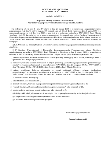 UCHWAŁA NR 174/VII/2016 RADY MIASTA JÓZEFOWA z dnia 24 maja 2016 r. w sprawie zmiany Studium Uwarunkowań i Kierunków Zagospodarowania Przestrzennego miasta Józefowa Na podstawie art. 12 ust. 1 i art. 27 ustawy z dnia 27 marca 2003 r. o planowaniu i zagospodarowaniu przestrzennym (t. j. Dz. U. z 2015 r., poz. 199 ze zm.) oraz art. 18 ust. 2 pkt 5 ustawy z dnia 8 marca 1990 r. o samorządzie gminnym (t. j. Dz. U. z 2016 r., poz. 446 ), w związku z uchwałą nr 359/VI/2013 Rady Miasta Józefowa z dnia 29 listopada 2013 r. w sprawie przystąpienia do sporządzania zmiany Studium Uwarunkowań i Kierunków Zagospodarowania Przestrzennego miasta Józefowa, zmienionej uchwałą Rady Miasta Józefowa nr 393/VI/2014 z dnia 9 kwietnia 2014 r. i 45/VII/2015 z dnia 9 marca 2015 r.; Rada Miasta Józefowa uchwala, co następuje: § 1. 1. Uchwala się zmianę Studium Uwarunkowań i Kierunków Zagospodarowania Przestrzennego miasta Józefowa. 2. W Studium Uwarunkowań i Kierunków Zagospodarowania Przestrzennego miasta Józefowa zatwierdzonego uchwałą nr 273/III/2001 Rady Miejskiej w Józefowie z dnia 1 lutego 2001 r., zmienionego uchwałą nr 330/V/2010 Rady Miasta Józefowa z dnia 15 lipca 2010 r. (dalej Studium) wprowadza się: 1) zmiany wyróżnione kolorem niebieskim w części opisowej, składającej się z tekstu jednolitego wraz 7 rysunkami oraz dodaje się rysunek nr 8; 2) zmiany wyróżnione kolorem niebieskim w części graficznej „Kierunki zagospodarowania przestrzennego miasta” w obszarach określonych w uchwałach nr 359/VI/2013 z dnia 29 listopada 2013 r., 393/VI/2014 z dnia 9 kwietnia 2014 r. i 45/VII/2015 z dnia 9 marca 2015 r. Rady Miasta Józefowa; 3) zmiany wyróżnione kolorem niebieskim w części graficznej „Obszary ochrony środowiska przyrodniczego” w obszarach określonych w uchwałach nr 359/VI/2013 z dnia 29 listopada 2013 r., 393/VI/2014 z dnia 9 kwietnia 2014 r. i 45/VII/2015 z dnia 9 marca 2015 r. Rady Miasta Józefowa; 3. Załącznikami do uchwały są: 1) tekst Studium, jako załącznik nr 1, 2) rysunek Studium „Kierunki zagospodarowania przestrzennego miasta”, jako załącznik nr 2a, 3) rysunek Studium „Obszary ochrony środowiska przyrodniczego”, jako załącznik nr 2b, 4) rozstrzygnięcie o sposobie rozpatrzenia uwag, jako załącznik nr 3. § 2. Załączniki, o których mowa w § 1. ust. 6. pkt 1 do 3, sporządzone zostały w formie ujednoliconej. § 3. Wykonanie uchwały powierza się Burmistrzowi Miasta Józefowa. § 4. Uchwała wchodzi w życie z dniem podjęcia. Przewodniczący Rady Miasta Cezary Łukaszewski U zas adnienie Rada Miasta Józefowa uchwałą nr 359/VI/2013 Rady Miasta Józefowa z dnia 29 listopada 2013 r. postanowiła o przystąpieniu do sporządzenia zmiany Studium Uwarunkowań i Kierunków Zagospodarowania Przestrzennego miasta Józefowa, rozszerzając następnie zakres zmian uchwałami 393/VI/2014 z dnia 9 kwietnia 2014 r. i 45/VII/2015 z dnia 9 marca 2015 r. Realizując uchwałę Rady Miasta, zgodnie z ustawą o planowaniu i zagospodarowaniu przestrzennym Burmistrz Miasta Józefowa 12 grudnia 2013 r. ogłosił o przystąpieniu do zmiany Studium. Oprócz tablicy ogłoszeń i Biuletynu Informacji Publicznej ogłoszenie ukazało się na łamach „Linii Otwockiej” nr 50 (814), -22 grudnia 2013 r. oraz w „Tygodniku Regionalnym” nr 51-52 (733-734) 19 grudnia 2013 r. Następnie dnia 8 maja 2014 r. ogłoszono o rozszerzeniu obszarów objętych zmianą – „Linia Otwocka” nr 19 (835), 1218 maja 2014, „Tygodnik Regionalny” nr 19 (753), 15 maja 2014 r. Kolejne rozszerzenie ogłoszono 20 marca 2015 r. – „Linia Otwocka” nr 12 (880), 23-29 marca 2015 r., „Tygodnik Regionalny” nr 12 (797), 26 marca 2015 r. Za każdym razem ogłaszano jednocześnie o sposobie i terminie składania wniosków do projektu zmiany Studium. Ostatecznie zgodnie uchwałą o przystąpieniu wraz ze zmianami, zmiana Studium dotyczyła 9 fragmentów miasta, w zakresie zgodnym z przepisami ustawy o planowaniu i zagospodarowaniu przestrzennym z dnia 27 marca 2003 r. oraz rozporządzeniem Ministra Infrastruktury w sprawie zakresu projektu studium uwarunkowań i kierunków zagospodarowania przestrzennego gminy z dnia 28 kwietnia 2004 r. Organy właściwe w sprawie były zawiadamiane każdorazowo o przystąpieniu do sporządzenia Studium (później zwiększenia terenów opracowania) tj. kolejno 13 grudnia 2013 r., 13 maja 2014 r. i 31 marca 2015 r. Intencją uchwały o przystąpieniu do zmiany Studium było wprowadzenie zmian do obowiązującego dokumentu, wynikających z konieczności dostosowania polityki przestrzennej miasta do obecnych potrzeb rozwojowych, w tym ograniczenie zasięgu projektowanych terenów pod zabudowę mieszkaniową na rzecz terenów usługowych i rzemieślniczych. Założono realizację zabudowy usługowej centrotwórczej w centralnym rejonie miasta, w tym obiektu handlu o powierzchni sprzedaży powyżej 2000 m². Wskazano nowe zespoły zabudowy usługowej w południowo-zachodnim i północno-wschodnim rejonie miasta. Uzupełniono zespół zabudowy usługoworzemieślniczej i zachodniej części Józefowa. Te zmiany w polityce przestrzennej miasta mają pozwolić na realizację większej ilości miejsc pracy na miejscu. W części uwarunkowań dokonano korekt wymaganych przez zapisy art 9 ustawy o planowaniu i zagospodarowaniu przestrzennym, w tym dokonano bilansów rezerw w obowiązujących planach miejscowych oraz w samym obowiązującym Studium. Stwierdzono konieczność wskazania nowych terenów pod funkcje usługowe. Słusznym okazało się zrezygnowanie z nowych terenów mieszkaniowych na rzecz usługowych. Projekt zmiany Studium był prezentowany Komisji Urbanistyczno-Architektonicznej i uzyskał opinię pozytywną dnia 25 maja 2015 r. Po wprowadzeniu korekt wynikających z uwzględnienia uwag Komisji, został skierowany do zaopiniowania i uzgodnienia przez uprawnione instytucje zewnętrzne dnia14 grudnia 2015 i 29 st