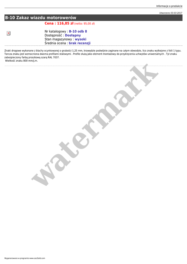 Informacje o produkcie Utworzono 03-03-2017 B-10 Zakaz wiazdu motorowerów Cena : 116,85 zł (netto: 95,00 zł) Nr katalogowy : B-10 odb 8 Dostępność : Dostępny Stan magazynowy : wysoki Średnia ocena : brak recenzji w at er m ar k Znaki drogowe wykonane z blachy ocynkowanej o grubości 1,25 mm, krawędzie podwójnie zaginane na całym obwodzie, lico znaku wylkejone z folii 1 typu. Tarcza znaku jest wzmocniona dwoma profilami stalowymi . Profile służą jako element montażowy do przykręcenia uchwytów uniwersalnych . Tył znaku zabezpieczony farbą proszkową szarą RAL 7037. Wielkość znaku 800 mm/j.m. Wygenerowano w programie www.oscGold.com