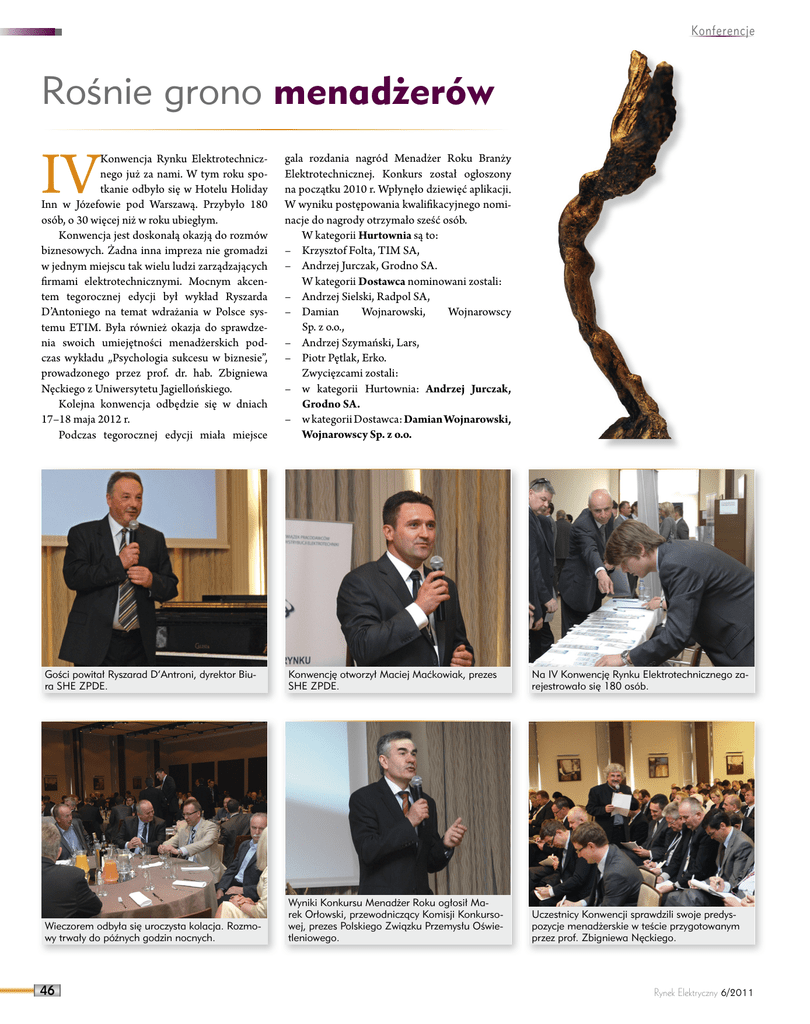 Konferencje Rośnie grono menadżerów IV Konwencja Rynku Elektrotechnicznego już za nami. W tym roku spotkanie odbyło się w Hotelu Holiday Inn w Józefowie pod Warszawą. Przybyło 180 osób, o 30 więcej niż w roku ubiegłym. Konwencja jest doskonałą okazją do rozmów biznesowych. Żadna inna impreza nie gromadzi w jednym miejscu tak wielu ludzi zarządzających firmami elektrotechnicznymi. Mocnym akcentem tegorocznej edycji był wykład Ryszarda D’Antoniego na temat wdrażania w Polsce systemu ETIM. Była również okazja do sprawdzenia swoich umiejętności menadżerskich podczas wykładu „Psychologia sukcesu w biznesie”, prowadzonego przez prof. dr. hab. Zbigniewa Nęckiego z Uniwersytetu Jagiellońskiego. Kolejna konwencja odbędzie się w dniach 17–18 maja 2012 r. Podczas tegorocznej edycji miała miejsce gala rozdania nagród Menadżer Roku Branży Elektrotechnicznej. Konkurs został ogłoszony na początku 2010 r. Wpłynęło dziewięć aplikacji. W wyniku postępowania kwalifikacyjnego nominacje do nagrody otrzymało sześć osób. W kategorii Hurtownia są to: – Krzysztof Folta, TIM SA, – Andrzej Jurczak, Grodno SA. W kategorii Dostawca nominowani zostali: – Andrzej Sielski, Radpol SA, – Damian Wojnarowski, Wojnarowscy Sp. z o.o., – Andrzej Szymański, Lars, – Piotr Pętlak, Erko. Zwycięzcami zostali: – w kategorii Hurtownia: Andrzej Jurczak, Grodno SA. – w kategorii Dostawca: Damian Wojnarowski, Wojnarowscy Sp. z o.o. Gości powitał Ryszarad D’Antroni, dyrektor Biura SHE ZPDE. Konwencję otworzył Maciej Maćkowiak, prezes SHE ZPDE. Na IV Konwencję Rynku Elektrotechnicznego zarejestrowało się 180 osób. Wieczorem odbyła się uroczysta kolacja. Rozmowy trwały do późnych godzin nocnych. Wyniki Konkursu Menadżer Roku ogłosił Marek Orłowski, przewodniczący Komisji Konkursowej, prezes Polskiego Związku Przemysłu Oświetleniowego. Uczestnicy Konwencji sprawdzili swoje predyspozycje menadżerskie w teście przygotowanym przez prof. Zbigniewa Nęckiego. 46 Rynek Elektryczny 6/2011