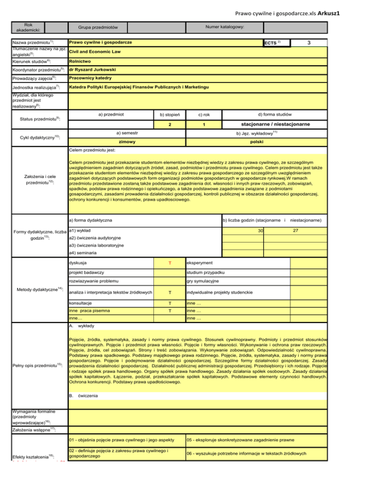 Prawo cywilne i gospodarcze.xls Arkusz1 Rok akademicki: Numer katalogowy: Grupa przedmiotów Prawo cywilne i gospodarcze Nazwa przedmiotu1): Tłumaczenie nazwy na jęz. Civil and Economic Law 3) angielski : Kierunek studiów4): ECTS 2) 3 Rolnictwo 5) Koordynator przedmiotu : dr Ryszard Jurkowski 6) Pracownicy katedry Prowadzący zajęcia : 7) Jednostka realizująca : Katedra Polityki Europejskiej Finansów Publicznych i Marketingu Wydział, dla którego przedmiot jest realizowany8): a) przedmiot 9) b) stopień c) rok d) forma studiów 2 1 stacjonarne / niestacjonarne Status przedmiotu : 11) a) semestr Cykl dydaktyczny10): b) Jęz. wykładowy zimowy polski Celem przedmiotu jest: Założenia i cele przedmiotu12): Celem przedmiotu jest przekazanie studentom elementów niezbędnej wiedzy z zakresu prawa cywilnego, ze szczególnym uwzględnieniem zagadnień dotyczących źródeł, zasad, podmiotów i przedmiotu prawa cywilnego. Celem przedmiotu jest także przekazanie studentom elementów niezbędnej wiedzy z zakresu prawa gospodarczego ze szczególnym uwzględnieniem zagadnień dotyczących podstawowych form organizacji podmiotów gospodarczych w gospodarcze rynkowej.W ramach przedmiotu przedstawione zostaną także podstawowe zagadnienia dot. własności i innych praw rzeczowych, zobowiązań, spadków, podstaw prawa rodzinnego i opiekuńczego, a także podstawowe zagadnienia związane z podmiotami gosapodarczymi, zasadami prowadenia działalności gospodarczej, kontroli publicznej w obszarze działalności gospodarczej, ochrony konkurencji i konsumentów, prawa upadłosciowego. a) forma dydaktyczna b) liczba godzin (stacjonarne i Formy dydaktyczne, liczba a1) wykład 13) a2) ćwiczenia audytoryjne godzin : 30 niestacjonarne) 27 a3) ćwiczenia laboratoryjne a4) seminaria dyskusja 14) Metody dydaktyczne : T projekt badawczy studium przypadku rozwiazywanie problemu gry symulacyjne analiza i interpretacja tekstów źródłowych T konsultacje T inne … inne praca pisemna T inne … inne… A. Pełny opis przedmiotu15): eksperyment indywidualne projekty studenckie inne … wykłady Pojęcie, źródła, systematyka, zasady i normy prawa cywilnego. Stosunek cywilnoprawny. Podmioty i przedmiot stosunków cywilnoprawnych. Pojęcie i przedmiot prawa własności. Pojęcie i formy własności. Wykonywanie i ochrona praw rzeczowych. Pojęcie, źródła, cel zobowiązań. Strony i treść zobowiązania. Wykonywanie zobowiązań. Odpowiedzialność cywilnoprawna. Podstawy prawa spadkowego. Podstawy majątkowego prawa rodzinnego. Pojęcie, źródła, systematyka, zasady i normy prawa gospodarczego. Pojęcie i podejmowanie działalności gospodarczej. Szczególne formy działalności gospodarczej. Zasady prowadzenia działalności gospodarczej. Działalność publicznej administracji gospodarczej. Przedsiębiorcy i ich rodzaje. Pojęcie i rodzaje spółek prawa handlowego. Organy spółek prawa handlowego. Zasady działania spółek osobowych. Zasady działania spółek kapitałowych. Łączenie, podział, przekształcanie spółek kapitałowych. Podstawowe elementy czynności handlowych. Ochrona konkurencji. Podstawy prawa upadłościowego. B. ćwiczenia Wymagania formalne (przedmioty wprowadzające)16): 17) Założenia wstępne : 01 - objaśnia pojęcie prawa cywilnego i jego aspekty 02 - definiuje pojęcia z zakresu prawa cywilnego i 18) gospodarczego Efekty kształcenia : (z kolejnymi numerami, 01, 05 - eksploruje skonkretyzowane zagadnienie prawne 06 - wyszukuje potrzebne informacje w tekstach żródłowych Prawo cywilne i gospodarcze.xls Arkusz1 (z kolejnymi numerami, 01, 03 - charakteryzuje podstawowe elementy prawa 02, 03 itd.) cywilnego 07 - analizuje i formułuje wnioski 04 - charakteryzuje podstawowe elementy prawa gospodarczego 08 - formułuje i prezentuje wypowiedzi pisemne kolokwium na zajęciach ćwiczeniowych praca pisemna przygotowywana w ramach pracy własnej studenta ocena wykonanie zadania projektowego na zdefiniowany temat 05, 06, 07, 08 ocena eksperymentów wykonywanych w Sposób weryfikacji efektów trakcie zajęć kształcenia19): ocena wystąpień i prezentacji w trakcie zajęć przygotowanie zespołowej analizy zdefiniowanego problemu obserwacja w trakcie dyskusji zdefiniowanego problemu (aktywność) egzamin pisemny test komputerowy egzamin ustny inne.. inne zaliczenie pisemne 01, 02, 03, 04 okresowe prace pisemne Forma dokumentacji osiągniętych efektów 20) kształcenia : złożone projekty inne Zaliczenie pisemne T Element oceny inne.. imienne karty oceny studenta T inne… treść pytań egzaminacyjnych z oceną inne.. Waga w % praca pisemna przygotowywana w ramach pracy własnej studenta Waga w % Element oceny ocena wykonania zadania projektowego na zdefiniowany temat kolokwium na zajęciach ćwiczeniowych Elementy i wagi mające wpływ na ocenę końcową21): ocena wynikająca z obserwacji w trakcie zajęć 30% ocena wynikająca z obserwacji w trakcie zajęć ocena eksperymentów wykonywanych w trakcie zajęć przygotowanie zespołowej analizy zdefiniowanego problemu ocena wystąpień i prezentacji w trakcie zajęć obserwacja w trakcie dyskusji zdefiniowanego problemu (aktywność) egzamin pisemny test egzamin ustny inne.. inne… Zaliczenie pisemne 70% inne.. Miejsce realizacji zajęć22): Sala dydaktyczna Literatura podstawowa i uzupełniająca23): a) podstawowa 1. A. Kawałko, H. Witczak, Prawo cywilne, C.H. Beck, 2008 2. J. Pakosiewicz (red.), Prawo gospodarcze i handlowe. Repetytorium, Oficyna Wolters Kluwer business, 2008 b) uzupełniająca 3. T.A. Filipiak, J. Mojak, M. Nazar, E. Niezbecka, Zarys prawa cywilnego, Verba, 2008 4. E Gniewek, A. Cisek, J. Jezioro, J. Kremis, A. Łuszpak-Zając, J. Strzebińczyk, K. Zagrobelny, Podstawy prawa cywilnego, C.H. Beck, 2005 5. K. Czajkowska-Matosiuk, Prawo gospodarcze i spółek, C.H. Beck, 2008 6. C. Kosikowski, Publiczne prawo gospodarcze Polski i Unii Europejskiej, LexisNexis, 2007 7. Kodeks cywilny 8. Kodeks spółek han