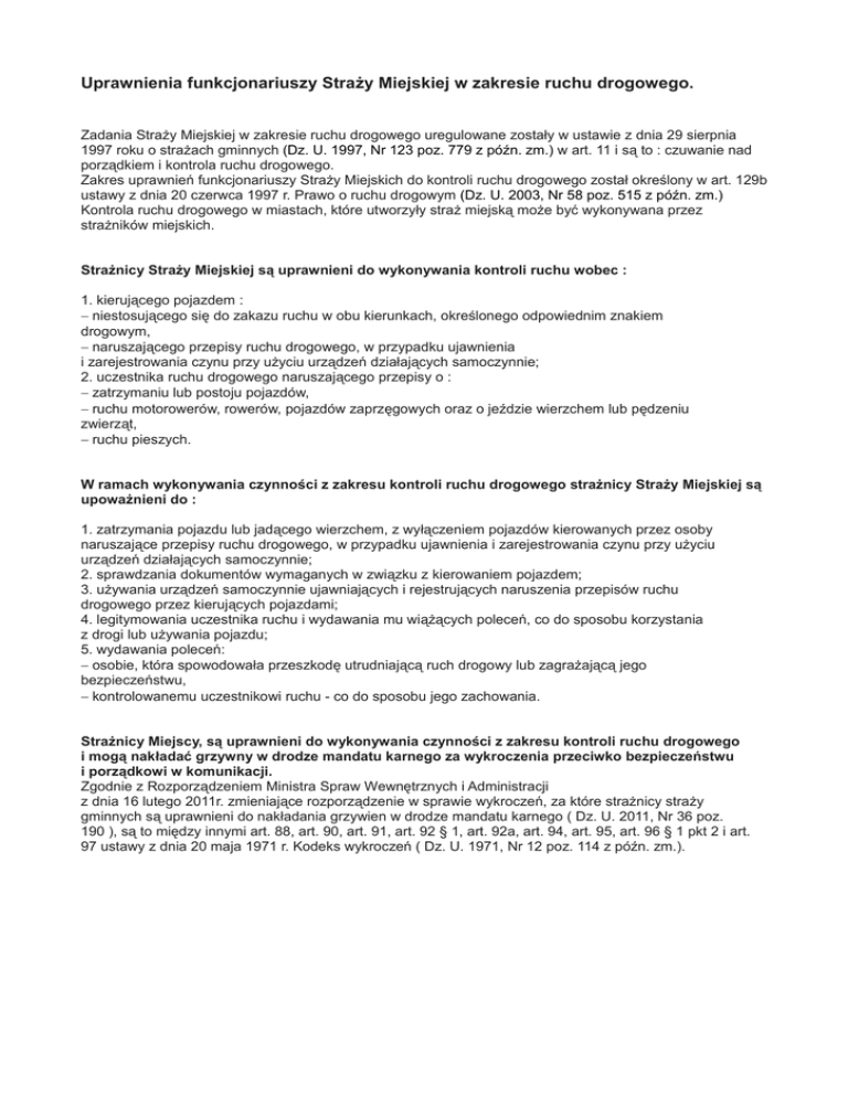 Uprawnienia funkcjonariuszy Straży Miejskiej w zakresie ruchu drogowego. Zadania Straży Miejskiej w zakresie ruchu drogowego uregulowane zostały w ustawie z dnia 29 sierpnia 1997 roku o strażach gminnych (Dz. U. 1997, Nr 123 poz. 779 z późn. zm.) w art. 11 i są to : czuwanie nad porządkiem i kontrola ruchu drogowego. Zakres uprawnień funkcjonariuszy Straży Miejskich do kontroli ruchu drogowego został określony w art. 129b ustawy z dnia 20 czerwca 1997 r. Prawo o ruchu drogowym (Dz. U. 2003, Nr 58 poz. 515 z późn. zm.) Kontrola ruchu drogowego w miastach, które utworzyły straż miejską może być wykonywana przez strażników miejskich. Strażnicy Straży Miejskiej są uprawnieni do wykonywania kontroli ruchu wobec : 1. kierującego pojazdem : − niestosującego się do zakazu ruchu w obu kierunkach, określonego odpowiednim znakiem drogowym, − naruszającego przepisy ruchu drogowego, w przypadku ujawnienia i zarejestrowania czynu przy użyciu urządzeń działających samoczynnie; 2. uczestnika ruchu drogowego naruszającego przepisy o : − zatrzymaniu lub postoju pojazdów, − ruchu motorowerów, rowerów, pojazdów zaprzęgowych oraz o jeździe wierzchem lub pędzeniu zwierząt, − ruchu pieszych. W ramach wykonywania czynności z zakresu kontroli ruchu drogowego strażnicy Straży Miejskiej są upoważnieni do : 1. zatrzymania pojazdu lub jadącego wierzchem, z wyłączeniem pojazdów kierowanych przez osoby naruszające przepisy ruchu drogowego, w przypadku ujawnienia i zarejestrowania czynu przy użyciu urządzeń działających samoczynnie; 2. sprawdzania dokumentów wymaganych w związku z kierowaniem pojazdem; 3. używania urządzeń samoczynnie ujawniających i rejestrujących naruszenia przepisów ruchu drogowego przez kierujących pojazdami; 4. legitymowania uczestnika ruchu i wydawania mu wiążących poleceń, co do sposobu korzystania z drogi lub używania pojazdu; 5. wydawania poleceń: − osobie, która spowodowała przeszkodę utrudniającą ruch drogowy lub zagrażającą jego bezpieczeństwu, − kontrolowanemu uczestnikowi ruchu - co do sposobu jego zachowania. Strażnicy Miejscy, są uprawnieni do wykonywania czynności z zakresu kontroli ruchu drogowego i mogą nakładać grzywny w drodze mandatu karnego za wykroczenia przeciwko bezpieczeństwu i porządkowi w komunikacji. Zgodnie z Rozporządzeniem Ministra Spraw Wewnętrznych i Administracji z dnia 16 lutego 2011r. zmieniające rozporządzenie w sprawie wykroczeń, za które strażnicy straży gminnych są uprawnieni do nakładania grzywien w drodze mandatu karnego ( Dz. U. 2011, Nr 36 poz. 190 ), są to między innymi art. 88, art. 90, art. 91, art. 92 § 1, art. 92a, art. 94, art. 95, art. 96 § 1 pkt 2 i art. 97 ustawy z dnia 20 maja 1971 r. Kodeks wykroczeń ( Dz. U. 1971, Nr 12 poz. 114 z późn. zm.).