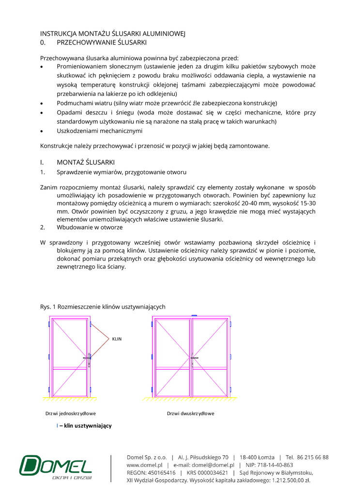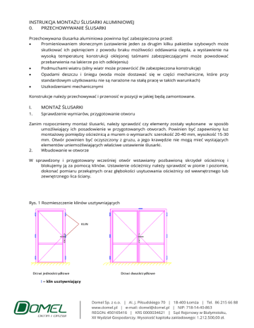 INSTRUKCJA MONTAŻU ŚLUSARKI ALUMINIOWEJ 0. PRZECHOWYWANIE ŚLUSARKI Przechowywana ślusarka aluminiowa powinna być zabezpieczona przed: Promieniowaniem słonecznym (ustawienie jeden za drugim kilku pakietów szybowych może skutkować ich pęknięciem z powodu braku możliwości oddawania ciepła, a wystawienie na wysoką temperaturę konstrukcji oklejonej taśmami zabezpieczającymi może powodować przebarwienia na lakierze po ich odklejeniu) Podmuchami wiatru (silny wiatr może przewrócić źle zabezpieczona konstrukcję) Opadami deszczu i śniegu (woda może dostawać się w części mechaniczne, które przy standardowym użytkowaniu nie są narażone na stałą pracę w takich warunkach) Uszkodzeniami mechanicznymi Konstrukcje należy przechowywać i przenosić w pozycji w jakiej będą zamontowane. I. MONTAŻ ŚLUSARKI 1. Sprawdzenie wymiarów, przygotowanie otworu Zanim rozpoczniemy montaż ślusarki, należy sprawdzić czy elementy zostały wykonane w sposób umożliwiający ich posadowienie w przygotowanych otworach. Powinien być zapewniony luz montażowy pomiędzy ościeżnicą a murem o wymiarach: szerokość 20-40 mm, wysokość 15-30 mm. Otwór powinien być oczyszczony z gruzu, a jego krawędzie nie mogą mieć wystających elementów uniemożliwiających właściwe ustawienie ślusarki. 2. Wbudowanie w otworze W sprawdzony i przygotowany wcześniej otwór wstawiamy pozbawioną skrzydeł ościeżnicę i blokujemy ją za pomocą klinów. Ustawienie ościeżnicy należy sprawdzić w pionie i poziomie, dokonać pomiaru przekątnych oraz głębokości usytuowania ościeżnicy od wewnętrznego lub zewnętrznego lica ściany. Rys. 1 Rozmieszczenie klinów usztywniających KLIN Drz wi jednoskrz ydłowe I – klin usztywniający Drzwi dwuskrz ydłowe 3. Zamocowanie w otworze Elementy kotwiące powinny być rozmieszczone po całym obwodzie konstrukcji. Rys. 2. Rozmieszczenie punktów mocowania elementów kotwiących KOTWA Drzwi je dnoskrzydłowe Drzwi dwuskrzydłowe 1. Odstęp od dolnej krawędzi ramy drzwiowej – min 80 mm 2. Odstęp między punktami mocowania – max 1000 mm 3. Odstęp od górnej krawędzi drzwi – 150 mm 4. Odstęp między narożem a środkiem mocowania 1000 mm 5. Odstęp między punktami mocowania progu. Standardową techniką mocowania jest montaż za pomocą dybli (kołków rozporowych) oraz śrub o średnicy, co najmniej 8 mm. Wybór dybla zależy od materiału, w jakim konstrukcja zostanie zamontowana. Zamiennie dopuszcza się montaż za pomocą kotew montażowych dedykowanych do danego systemu aluminiowego, które jednym końcem mocuje się do zewnętrznej ścianki ościeżnicy. Drugi koniec kotwy montujemy do ościeża za pomocą dybli lub śrub. Po zamontowaniu ościeżnicy wieszamy na niej skrzydła. 4. Uszczelnienie Uszczelnienie przestrzeni pomiędzy ościeżnicą, a ościeżem należy wykonać za pomocą pianki poliuretanowej w taki sposób, aby pianka po spęcznieniu wypełniła całą szczelinę nie rozlewając się jednak na boczne powierzchnie ościeżnicy. Podczas wyboru piany montażowej należy uwzględnić temperaturę otoczenia, przy jakiej będą wykonywane prace montażowe. W okresie zimowym należy bezwzględnie stosować piankę przeznaczoną do niskich temperatur (należy przestrzegać zaleceń producenta pianki). Montaż może odbywać się w temperaturze do -10 °C. Po związaniu piany montażowej należy wyjąć kliny usztywniające, a pozostałe po nich puste przestrzenie uzupełnić pianą, następnie odciąć nadmiar równo z ramą konstrukcji i sprawdzić poprawność działania skrzydeł. W razie konieczności należy dokonać ewentualnej ślusarki. II. PRACE WYKOŃCZENIOWE Po zamontowaniu drzwi podczas wykonywania robót tynkarskich, powinny być one zabezpieczone przed zabrudzeniem i zarysowaniem taśmą lub folią zabezpieczającą. Po zakończeniu wszystkich prac związanych z wbudowaniem, montażem oraz obróbką zewnętrzną konstrukcji, należy usunąć taśmę zabezpieczającą oraz wyczyścić wszystkie ewentualne zabrudzone elementy. Oryginalną folię ochronną naklejoną na profilach należy usunąć natychmiast po zakończeniu prac montażowych (przy konstrukcjach zewnętrznych przy narażeniu na działanie promieni słonecznych folia może powodować odbarwienia na strukturze lakierniczej).