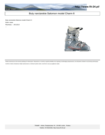 http://www.fit-24.pl/ Buty narciarskie Salomon model Charm 6 Buty narciarskie Salomon model Charm 6 Kolor: szare Rozmiary: 25,5;23,5 Model przeznaczony dla narciarzy jeżdżących rekreacyjnie. Wyposażony w szeroką, wygodną wkładkę oraz regulację umożliwiającą dopasowanie, lub odchylenie cholewki w tył (funkcja podnosząca komfort w trakcie chodzenia). Dzięki zastosowaniu w okolicach palców wełny i aluminium, buty są wyjątkowo ciepłe. TRAMP - Adres: Świętoduska 18, 20-082 Lublin, Polska Telefon: 81/5323336, http://www.fit-24.pl/