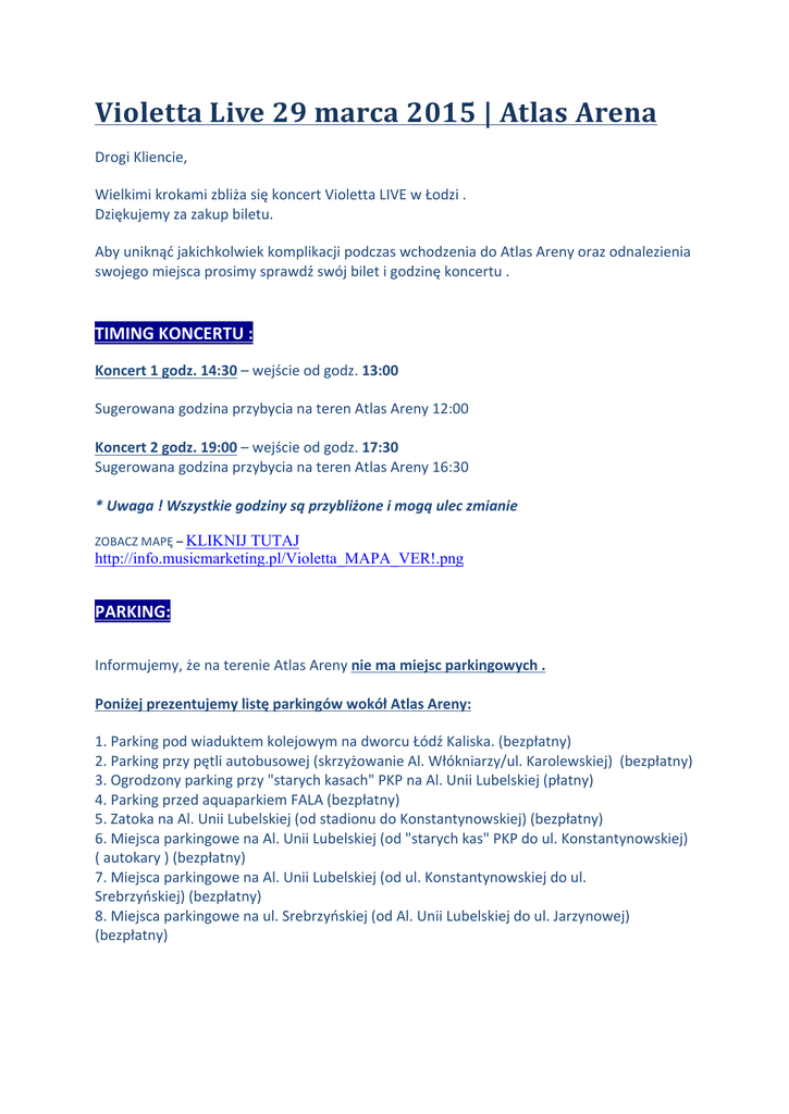 Violetta Live 29 marca 2015 | Atlas Arena Drogi Kliencie, Wielkimi krokami zbliża się koncert Violetta LIVE w Łodzi . Dziękujemy za zakup biletu. Aby uniknąć jakichkolwiek komplikacji podczas wchodzenia do Atlas Areny oraz odnalezienia swojego miejsca prosimy sprawdź swój bilet i godzinę koncertu . TIMING KONCERTU : Koncert 1 godz. 14:30 – wejście od godz. 13:00 Sugerowana godzina przybycia na teren Atlas Areny 12:00 Koncert 2 godz. 19:00 – wejście od godz. 17:30 Sugerowana godzina przybycia na teren Atlas Areny 16:30 * Uwaga ! Wszystkie godziny są przybliżone i mogą ulec zmianie ZOBACZ MAPĘ – KLIKNIJ TUTAJ http://info.musicmarketing.pl/Violetta_MAPA_VER!.png PARKING: Informujemy, że na terenie Atlas Areny nie ma miejsc parkingowych . Poniżej prezentujemy listę parkingów wokół Atlas Areny: 1. Parking pod wiaduktem kolejowym na dworcu Łódź Kaliska. (bezpłatny) 2. Parking przy pętli autobusowej (skrzyżowanie Al. Włókniarzy/ul. Karolewskiej) (bezpłatny) 3. Ogrodzony parking przy "starych kasach" PKP na Al. Unii Lubelskiej (płatny) 4. Parking przed aquaparkiem FALA (bezpłatny) 5. Zatoka na Al. Unii Lubelskiej (od stadionu do Konstantynowskiej) (bezpłatny) 6. Miejsca parkingowe na Al. Unii Lubelskiej (od "starych kas" PKP do ul. Konstantynowskiej) ( autokary ) (bezpłatny) 7. Miejsca parkingowe na Al. Unii Lubelskiej (od ul. Konstantynowskiej do ul. Srebrzyńskiej) (bezpłatny) 8. Miejsca parkingowe na ul. Srebrzyńskiej (od Al. Unii Lubelskiej do ul. Jarzynowej) (bezpłatny) KASA / PUNKT ODBIORU BILETÓW: Usytuowany przy bramie nr 1 , czynny : -‐ niedziela (29 marca 2015 ) w godz. 10:00 – 21:30 Wejście dla osób posiadających bilety na trybuny/płytę -‐ miejsca siedzące (dowolna brama ) àBrama 25,3,16,14,12 Wejście dla osób posiadających Pakiety VIP àBrama 1 OSOBY NIEPEŁNOSPRAWNE: Wejście dla osób niepełnosprawnych poruszających się na wózkach inwalidzkich brama nr 1 ZAKAZ WNOSZENIA / PRZEDMIOTY ZABRONIONE : -‐ broń, przedmioty pirotechniczne, race, petardy, spray, farba -‐ parasolki z ostrym zakończeniem, kaski -‐ napoje w puszkach, butelkach szklanych, butelkach plastikowych pow. 0.5l, -‐ ulotki, materiały reklamowe -‐ wuwuzele i trąbki -‐ transparenty i flagi o wymiarach większych niż 1,5 x 2m, kije, drzewce ostro zakończone -‐ wskaźniki laserowe -‐ aparaty fotograficzne z wymienną optyką, kamery, laptopy, Ipady, tablety PRZEDMIOTY DOZWOLONE: -‐ lornetki – każda wielkość, -‐ butelki plastikowe 0.5l z odkręconym korkiem -‐ wszystkie rodzaje telefonów INNE: -‐ Na terenie Atlas Areny obowiązuje całkowity zakaz palenia-‐i -‐ OŚWIADCZENIE OPIEKUNA DOTYCZĄCE UCZESTNIKA IMPREZY W WIEKU 0-‐18 LAT:: KLIKNIJ TUTAJ – WYDRUKUJ, WYPEŁNIJ I PRZEKAŻ SWOJEMU DZIECKU http://info.musicmarketing.pl/zgoda/zgoda.html REGULAMIN IMPREZY: Dostępny na www.livenation.pl oraz przy wejściach na terenie imprezy Więcej informacji pod nr telefonu : + 48 022 646 06 49 lub [email protected] Pozdrawiamy i życzymy niezapomnianych wrażeń !