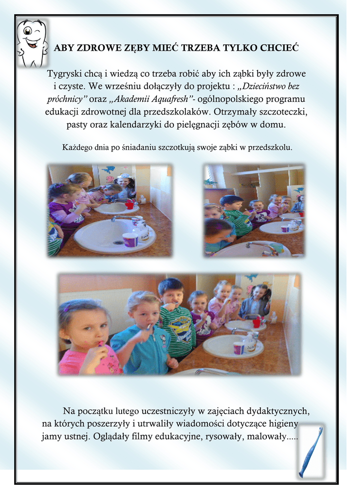 ABY ZDROWE ZĘBY MIEĆ TRZEBA TYLKO CHCIEĆ Tygryski chcą i wiedzą co trzeba robić aby ich ząbki były zdrowe i czyste. We wrześniu dołączyły do projektu : „Dzieciństwo bez próchnicy” oraz „Akademii Aquafresh”- ogólnopolskiego programu edukacji zdrowotnej dla przedszkolaków. Otrzymały szczoteczki, pasty oraz kalendarzyki do pielęgnacji zębów w domu. Każdego dnia po śniadaniu szczotkują swoje ząbki w przedszkolu. Na początku lutego uczestniczyły w zajęciach dydaktycznych, na których poszerzyły i utrwaliły wiadomości dotyczące higieny jamy ustnej. Oglądały filmy edukacyjne, rysowały, malowały..... Bawiły się w poszukiwaczy, zgadywanki z królikiem Pampisiem – Orędownikiem Czystych Zębów oraz Pastusiami: Lili, Bilim i Milkim, które zachęcały do dbania o ząbki. Opracowała: Edyta Kamieńska