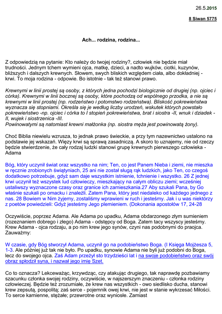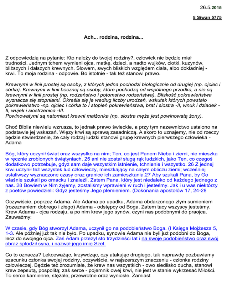 26.5.2015 8 Siwan 5775 Ach... rodzina, rodzina... Z odpowiedzią na pytanie: Kto należy do twojej rodziny?, człowiek nie będzie miał trudności. Jednym tchem wymieni ojca, matkę, dzieci, a nadto wujków, ciotki, kuzynów, bliższych i dalszych krewnych. Słowem, swych bliskich względem ciała, albo dokładniej krwi. To moja rodzina - odpowie. Bo istotnie - tak też stanowi prawo. Krewnymi w linii prostej są osoby, z których jedna pochodzi biologicznie od drugiej (np. ojciec i córka). Krewnymi w linii bocznej są osoby, które pochodzą od wspólnego przodka, a nie są krewnymi w linii prostej (np. rodzeństwo i potomstwo rodzeństwa). Bliskość pokrewieństwa wyznacza się stopniami. Określa się je według liczby urodzeń, wskutek których powstało pokrewieństwo -np. ojciec i córka to I stopień pokrewieństwa, brat i siostra -II, wnuk i dziadek II, wujek i siostrzenica -III. Powinowatymi są natomiast krewni małżonka (np. siostra męża jest powinowatą żony). Choć Biblia niewielu wzrusza, to jednak prawo świeckie, a przy tym nazewnictwo ustalono na podstawie jej wskazań. Więzy krwi są sprawą zasadniczą. A skoro to uznajemy, nie od rzeczy będzie stwierdzenie, że cały rodzaj ludzki stanowi grupę krewnych pierwszego człowieka Adama Bóg, który uczynił świat oraz wszystko na nim; Ten, co jest Panem Nieba i ziemi, nie mieszka w ręcznie zrobionych świątyniach, 25 ani nie został sługą rąk ludzkich, jako Ten, co czegoś dodatkowo potrzebuje, gdyż sam daje wszystkim istnienie, tchnienie i wszystko. 26 Z jednej krwi uczynił też wszystek lud człowieczy, mieszkający na całym obliczu ziemi; wcześniej ustaliwszy wyznaczone czasy oraz granice ich zamieszkania.27 Aby szukali Pana, by Go właśnie szukali po omacku i znaleźli. Zatem Pana, który jest niedaleko od każdego jednego z nas. 28 Bowiem w Nim żyjemy, zostaliśmy wprawieni w ruch i jesteśmy. Jak i u was niektórzy z poetów powiedzieli: Gdyż jesteśmy Jego plemieniem. (Dokonania apostołów 17, 24-28 Oczywiście, poprzez Adama. Ale Adama po upadku, Adama obdarzonego złym sumieniem (rozeznaniem dobrego i złego) Adama - odstępcy od Boga. Zatem tacy wszyscy jesteśmy. Krew Adama - ojca rodzaju, a po nim krew jego synów, czyni nas podobnymi do praojca. Zauważmy: W czasie, gdy Bóg stworzył Adama, uczynił go na podobieństwo Boga. (I Księga Mojżesza 5, 1-3. Ale później już tak nie było. Po upadku, synowie Adama nie byli już podobni do Boga, lecz do swojego ojca. Zaś Adam przeżył sto trzydzieści lat i na swoje podobieństwo oraz swój obraz spłodził syna, i nazwał jego imię Szet. Co to oznacza? Lekceważąc, krzywdząc, czy atakując drugiego, tak naprawdę pozbawiamy szacunku członka swojej rodziny, oczywiście, w najszerszym znaczeniu - członka rodziny człowieczej. Będzie też zrozumiałe, że krew nas wszystkich - owo siedlisko ducha, stanowi krew zepsutą, pospolitą; zaś serce - pojemnik owej krwi, nie jest w stanie wykrzesać Miłości. To serce kamienne, stężałe; przewrotne oraz wyniosłe. Zamiast miłością - tli się pogardą; zamiast braterstwem - nienawiścią Jak powiadają z doświadczenia: Rodzina wygląda wspaniale jedynie na portrecie. Dopomóż WIEKUISTY, bowiem zabrakło pobożnych, gdyż zniknęli wierni spośród synów ludzkich. 3 Gładkimi ustami jeden mówi drugiemu fałsz; mówią podwójnym sercem.4 Oby BÓG wytępił wszystkie gładkie usta i języki, co przemawiają z wysoka; 5 powiadają: Przez nasz język jesteśmy potężni, nasze wargi są z nami; kto chce być naszym panem? Bóg usłyszy oraz ich upokorzy; On, który panuje od wieczności. Dlatego, że nie doznali przemian oraz nie obawiają się Boga, 21 podniósł rękę na Swoich przyjaciół i wzruszył Swoje przymierze. 22 Ich usta gładsze są niż śmietana – a jątrzą Jego serce; ich słowa miększe od oliwy – ale to obnażone miecze. (Księga Psalmów 55, 20-24) 2 Ano, właśnie! Więzy krwi, chociaż czasami mocne, nie stanowią szlachetnego spoiwa. Nadto członkowie grupy umierają i rodzina się rozsypuje. Kruche to, z lekka fałszywe, oraz nad wyraz tymczasowe. Czy więc będzie solidnym wsparciem? Biblia rozwiewa resztkę złudzeń, a przy tym perspektywy. A to mówię, bracia, że cielesna natura i krew nie może odziedziczyć Królestwa Boga; ani ruina nie odziedzicza niezniszczalności. (Pierwszy List do Koryntian 15, 48-52 I dlatego głosimy wszystkim ludziom: Musicie zostać zrodzeni z Boga, by odziedziczyć życie wieczne! Sto razy powtarzałem ten werset: 3 Odpowiedział Jezus i rzekł: Zaprawdę, zaprawdę powiadam ci, jeśli ktoś nie zostanie zrodzony na nowo, nie może ujrzeć Królestwa Boga. 4 A Nikodem mówi do niego: Jak człowiek może zostać zrodzony, będąc stary? Czy może powtórnie wejść do łona swojej matki i zostać narodzony? 5 Jezus odpowiedział: Zaprawdę, zaprawdę powiadam ci, jeśli ktoś nie zostanie zrodzony z wody i Ducha, nie jest w stanie wejść do Królestwa Boga.(Ewangelia Jana 3, 3-7). W filmie, książkach, na miarę możliwości, wyjaśniałem jak taki proces przebiega. Jedno jest niewątpliwe. Po otrzymaniu łaski Wiary, wewnątrz starego, cielesnego człowieka, powstaje nowy człowiek, nazwany człowiekiem duchowym. Jaki jest ten gliniany tacy są i ci gliniani; zaś jaki ten niebiański tacy też ci niebiańscy. 49 Jak nosiliśmy obraz glinianego, tak też będziemy nosić obraz niebiańskiego. 50 Pierwszy list do Koryntian 15, 48-49. W przypadku starego człowieka, pierwiastkiem ożywczym i odżywiającym jest krew; zaś w przypadku nowego - Duch. Otóż, właśnie! Ta nowa istota w nas musi być zanurzona i napełniona Duchem Świętym. On czyni człowieka wiecznie żywym i posila go Słowem Boga. 2 No, a serce? Jest także i nowe serce; nie po lewej - ale po prawej stronie. Serce mądrego jest po jego prawej stronie, a serce głupiego po jego lewej stronie.(Koheleta 10,2) Tworzy się nowa rodzina. I to nie tymczasowa,