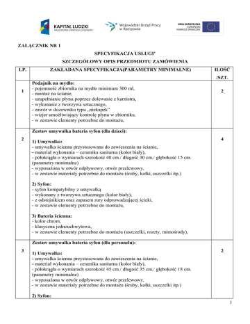 ZAŁĄCZNIK NR 1 SPECYFIKACJA USŁUGI’ SZCZEGÓŁOWY OPIS PRZEDMIOTU ZAMÓWIENIA LP. ZAKŁADANA SPECYFIKACJA(PARAMETRY MINIMALNE) ILOŚĆ /SZT. 1 Podajnik na mydło: - pojemność zbiornika na mydło minimum 300 ml, - montaż na ścianie, - uzupełnianie płynu poprzez dolewanie z karnistra, - wykonanie z tworzywa sztucznego, - zawór w dozowniku typu „niekapek” - wizjer umożliwiający kontrolę płynu w zbiorniku. - w zestawie elementy potrzebne do montażu, 2 Zestaw umywalka bateria syfon (dla dzieci): 2 1) Umywalka: - umywalka ścienna przystosowana do zawieszenia na ścianie, - materiał wykonania – ceramika sanitarna (kolor biały), - półokrągła o wymiarach szerokość 40 cm./ długość 30 cm./ głębokość 15 cm. (parametry minimalne) - wyposażona w otwór odpływowy, otwór przelewowy, - w zestawie materiały potrzebne do montażu (śruby, kołki, uszczelki itp.) 4 2) Syfon: - syfon kompatybilny z umywalką - wykonany z tworzywa sztucznego (kolor biały), - z odstojnikiem oraz zapasem rury odprowadzającej ścieki, - w zestawie elementy potrzebne do montażu, 3) Bateria ścienna: - kolor chrom, - klasyczna jednouchwytowa, - w zestawie elementy potrzebne do montażu (uszczelki, rozety, mimośrody), Zestaw umywalka bateria syfon (dla personelu): 3 1) Umywalka: - umywalka ścienna przystosowana do zawieszenia na ścianie, - materiał wykonania – ceramika sanitarna (kolor biały), - półokrągła o wymiarach szerokość 45 cm./ długość 35 cm./ głębokość 18 cm. (parametry minimalne) - wyposażona w otwór odpływowy, otwór przelewowy, - w zestawie materiały potrzebne do montażu (śruby, kołki, uszczelki itp.) 2 2) Syfon: 1 - syfon kompatybilny z umywalką - wykonany z tworzywa sztucznego (kolor biały), - z odstojnikiem oraz zapasem rury odprowadzającej ścieki, - w zestawie elementy potrzebne do montażu, 3) Bateria ścienna: - kolor chrom, - klasyczna jednouchwytowa, - w zestawie elementy potrzebne do montażu (uszczelki, rozety, mimośrody), Elektryczny pojemnościowy ogrzewacz wody: 4 5 - moc 1500 W (lub większa), - pojemność w przedziale od minimum 15 litrów do maksymalnie 30 litrów. - możliwość zawieszenia na ścianie, - w zestawie wszystkie elementy potrzebne do zamontowania (mufki dialektryczne, zawór bezpieczeństwa, pokrętło regulacji temperatury, uchwyt montażowy itp.) Lustro łazienkowe 1 2 - prostokątne o wymiarach wysokość 80 cm./ szerokość 60 cm. (wymiary minimalne) - grubość szkła minimum 4 mm., - mocowanie do ściany, - ukryte mocowania, - wykończenie szlif, 6 Kompakt WC (dla personelu): 2 - materiał wykonania – ceramika sanitarna (kolor biały), - wysokość i wymiary kompaktu standardowe dla ubikacji przeznaczonych dla osób dorosłych - w zestawie z deską sedesową wolno-opadającą, - w zestawie materiały potrzebne do montażu, - dwufunkcyjny system spłukiwania, - odpływ poziomy (przyłącz kanalizacyjny umieszczony na ścianie),* - odpływ pionowy (przyłącz kanalizacyjny umieszczony w podłodze),* - rodzaj miski – lejowa, - boczne zasilanie spłuczki, *( 1 szt. odpływ poziomy, 1 szt. odpływ pionowy) 7 Brodzik: 1 - długość 80 cm./ szerokość 80 cm./ głębokość 10 cm./ wysokość całkowita 25 cm. (wymiary minimalne) - kształt półokrągły, - materiał wykonania – akryl sanitarny, - antypoślizgowe dno, - w zestawie materiały potrzebne do zamontowania np. stelaż z nogami, osłony, śruby do mocowania itp. - syfon, - zasłona prysznicowa (długość 200 cm./ szerokość 180 cm.) wraz z drążkiem o wymiarach pasujących do brodzika ( w zestawie materiały potrzebne do montażu) 2