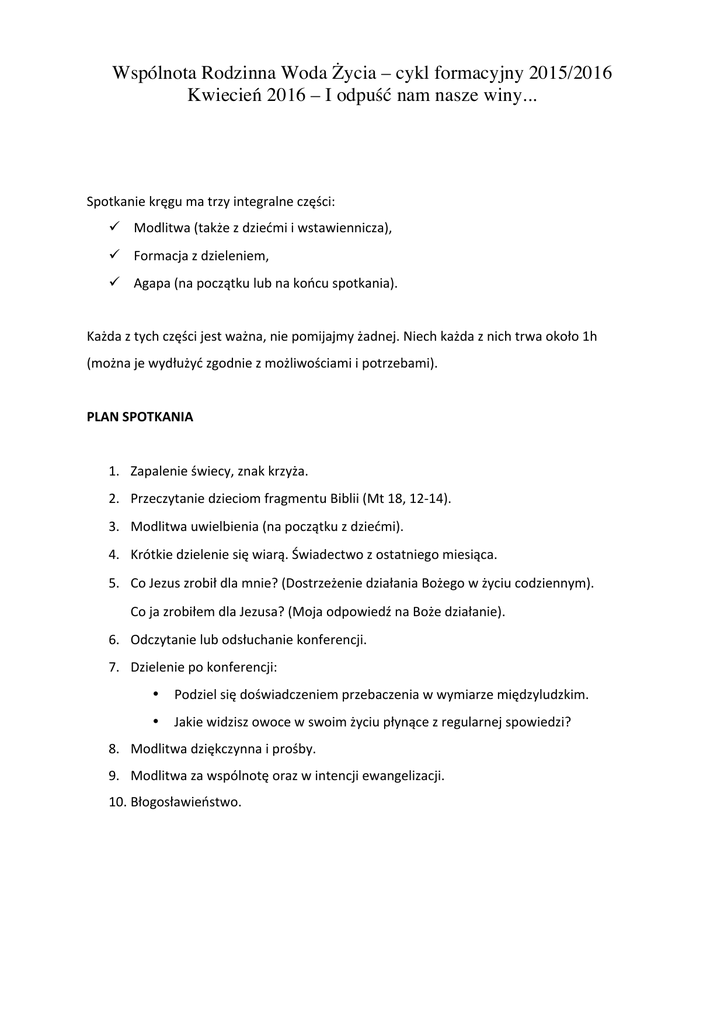Wspólnota Rodzinna Woda Życia – cykl formacyjny 2015/2016 Kwiecień 2016 – I odpuść nam nasze winy... Spotkaniekręgumatrzyintegralneczęści: ü Modlitwa(takżezdziećmiiwstawiennicza), ü Formacjazdzieleniem, ü Agapa(napoczątkulubnakońcuspotkania). Każdaztychczęścijestważna,niepomijajmyżadnej.Niechkażdaznichtrwaokoło1h (możnajewydłużyćzgodniezmożliwościamiipotrzebami). PLANSPOTKANIA 1. Zapalenieświecy,znakkrzyża. 2. PrzeczytaniedzieciomfragmentuBiblii(Mt18,12-14). 3. Modlitwauwielbienia(napoczątkuzdziećmi). 4. Krótkiedzieleniesięwiarą.Świadectwozostatniegomiesiąca. 5. CoJezuszrobiłdlamnie?(DostrzeżeniedziałaniaBożegowżyciucodziennym). CojazrobiłemdlaJezusa?(MojaodpowiedźnaBożedziałanie). 6. Odczytanielubodsłuchaniekonferencji. 7. Dzieleniepokonferencji: • Podzielsiędoświadczeniemprzebaczeniawwymiarzemiędzyludzkim. • Jakiewidziszowocewswoimżyciupłynącezregularnejspowiedzi? 8. Modlitwadziękczynnaiprośby. 9. Modlitwazawspólnotęorazwintencjiewangelizacji. 10. Błogosławieństwo. Wspólnota Rodzinna Woda Życia – cykl formacyjny 2015/2016 Kwiecień 2016 – I odpuść nam nasze winy... KONFERENCJA:Ojczenasz,któryśjestwniebie;odpuśćnamnaszewiny,jakoimy odpuszczamynaszymwinowajcom. JezusChrystuszmartwychwstał-Alleluja!CzaspaschalnytoradościotwieraniesięnaDucha Świętego, aby jeszcze bardziej przylgnąć do Jezusa, który wszedł w nasze życie, zbawił nas przez ofiarę krzyżową i nazywa nas swoimi przyjaciółmi. Jezus chce, abyśmy szli do ludzi z radosną nowiną, że On żyje, zmartwychwstał. Duch Święty, którego oczekujemy coraz bardziej, przychodzi z pomocą naszej słabości i daje nam odwagę i miłość, aby być misjonarzem-świadkiemzmartwychwstałegoPana. WmiesiącukwietniurozważamynastępnąprośbęzmodlitwyPańskiej-“Iodpuśćnamnasze winy,jakoimyodpuszczamynaszymwinowajcom”. Prośbataskładasięzdwóchczęściściślezesobąpowiązanych.Możnapowiedzieć,żepierwsza częśćjestuwarunkowanadrugą,tzn.abyśmymoglidoświadczyćodpuszczeniagrzechówsami musimyprzebaczyćiodpuścićtym,którzywobecnaszgrzeszyli,uczynilinamjakieśzłoalbo uczynili nam jakąś krzywdę. “Odpuść nam nasze winy” to modlitwa grzesznika. Wszyscy jesteśmy grzeszni. Choć zostaliśmy zanurzenie w miłości Boga w sakramencie chrztu i oczyszczeni z grzechu pierworodnego, to jednak skłonność do grzechu pozostała w nas i dlatego upadamy w grzech, czynimy zło, oddalamy się od Boga. Czyniąc zło ranimy ludzi i siebie. Modlitwa“Odpuśćnamnaszewiny”jestwołaniemKrólaDawidazpsalmu51,wktórymon modlisię:“ZmiłujsięnademnąBożewswojejłaskawości,wogromieswojegomiłosierdzia wymarzmojąnieprawość!Obmyjmniezupełniezmojejwinyioczyśćmniezgrzechumojego! Odwróćobliczesweodmoichgrzechówiwymarzwszystkiemojeprzewinienia!(...)”.Jestto teżmodlitwasynamarnotrawnego,którywracadodomuOjca:“Ojcze,zgrzeszyłemprzeciw Niebu i wobec Ciebie. Już nie jestem godzien nazywać się Twoim synem”. Jest to także modlitwacelnikazprzypowieściofaryzeuszuicelniku:“Boże,miejlitośćdlamniegrzesznika!”. Taka modlitwa otwiera podwoje miłosierdzia Bożego, ale jest również wyrazem naszego powrotudoBogaiotwarciawpostawieskruchyiuniżeniaprzedBogiem.Takamodlitwajest potrzebnawnaszymżyciu,bozłopojawiasięzawszewnaszychmyślach,słowach,czynach;i skrucha serca, wołanie “Panie, zmiłuj się nade mną jest nieustannym uniżeniem się przed Bogiem,którywmiłosierdziuswoimoczyszczanasiodnawiawewnętrznie.Bógniepamięta naszychgrzechówiwrzucajewgłębokościoceanuswojegomiłosierdzia. Drugaczęśćmodlitwyjestwezwaniemskierowanymdonas.Jestuwarunkowaniem“jakimy odpuszczamynaszymwinowajcom”.Jezuschceabyśmywybaczali,darowaliwinytym,którzy wobecnasuczynilizło,zranilinas.DoPiotramówi,żetrzebaprzebaczać77razydziennie,czyli zawsze.Donasmówi:Bądźciemiłosierni,jakmiłosiernyjestOjciecWaszNiebieski!Jezusw przypowieścioKróluisługach,zktórymisięzacząłrozliczaćpouczanas,żenaszKról,czyliBóg darował nam duży dług, ale my często nie potrafimy darować, przebaczyć naszemu bratu częstodużomniejszydług.Puentajesttaka“PodobnieuczyniWamOjciecNiebieski,jeślikażdy z was nie przebaczy z serca swemu bratu”. Tak więc przebaczenie, którego oczekujemy od Boga,jestuwarunkowanenaszymprzebaczeniemwobecbrata. Wszyscyjesteśmygrzesznikamiiwszyscypotrzebujemyprzebaczenia,.Bógjestmiłosiernym Ojcemiprzebaczanam,alechceprzebaczaćprzeznas.Wsakramenciepokutyczynitoprzez swojegosługękapłana,którymocąBogaudzielanamprzebaczeniagrzechów,aleBógchce Wspólnota Rodzinna Woda Życia – cykl formacyjny 2015/2016 Kwiecień 2016 – I odpuść nam nasze winy... czynićtoprzezkażdegoznas,gdyzsercaprzebaczamyludziom,którzywobecnaszawinili.Tak już jest, że jedni drugich ranimy, krzywdzimy, obrażamy, poniżamy - trzeba więc, aby w waszychrelacjachkażdyznasbyłzdolnyprzebaczyćkrzywdędoznanąiprosićoprzebaczenie tych, których zraniliśmy. Modlitwa do Ducha Świętego jest potrzebna, aby otworzyć się na łaskę przebaczenia. To Duch Święty przychodzi do nas z pomocą i uzdalania nas, abyśmy potrafiliuznaćzłoswojegogrzechu,zpokorąwyznać-zgrzeszyłemPaniewobecCiebie.Prosić owybaczenietych,którychskrzywdziłem,alerównieżprzebaczyćtym,którzywyrządzilimi zło. Wiemy, że sami z siebie często nie potrafimy przebaczać. Nasza pycha blokuje nas wewnętrznie. Potrzeba pokory i świadomości, że nie tylko ktoś nas skrzywdził, zranił; ale przecież my również krzywdzimy i ranimy innych. My też potrzebujemy przebaczenia. Gdy przebaczamy dokonuje się w nas uzdrowienie serca i błogosławieństwo. Gdy nie chcemy przebaczyć, przekleństwo pozostaje w nas i między nami. Bóg chce, abyś przebaczył bratu, siostrze - pomyśl dziś komu powinieneś przebaczyć. Bóg Tobie przebacza i zaprasza Cię do spotkaniazkapłanem-szafarzemmiłosierdzia.Spowiedźniejesttorturą,aleoddaniemsię miłosiernemuOjcu,który