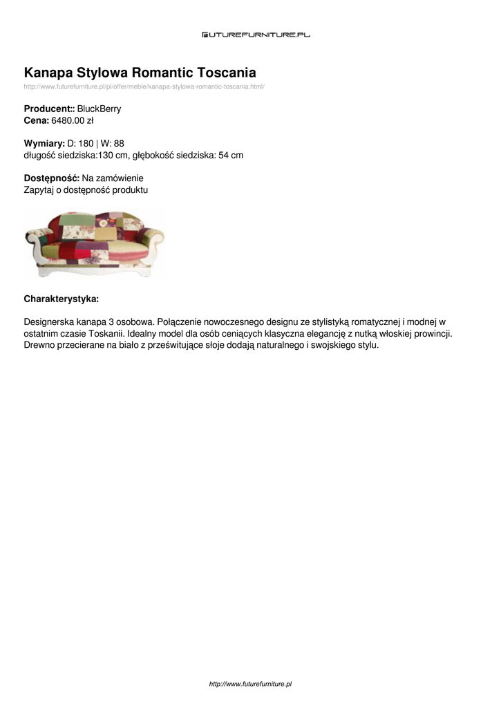 Kanapa Stylowa Romantic Toscania http://www.futurefurniture.pl/pl/offer/meble/kanapa-stylowa-romantic-toscania.html/ Producent:: BluckBerry Cena: 6480.00 zł Wymiary: D: 180 | W: 88 długość siedziska:130 cm, głębokość siedziska: 54 cm Dostępność: Na zamówienie Zapytaj o dostępność produktu Charakterystyka: Designerska kanapa 3 osobowa. Połączenie nowoczesnego designu ze stylistyką romatycznej i modnej w ostatnim czasie Toskanii. Idealny model dla osób ceniących klasyczna elegancję z nutką włoskiej prowincji. Drewno przecierane na biało z prześwitujące słoje dodają naturalnego i swojskiego stylu. http://www.futurefurniture.pl http://www.futurefurniture.pl Zdjęcia produktu: http://www.futurefurniture.pl Powered by TCPDF (www.tcpdf.org)
