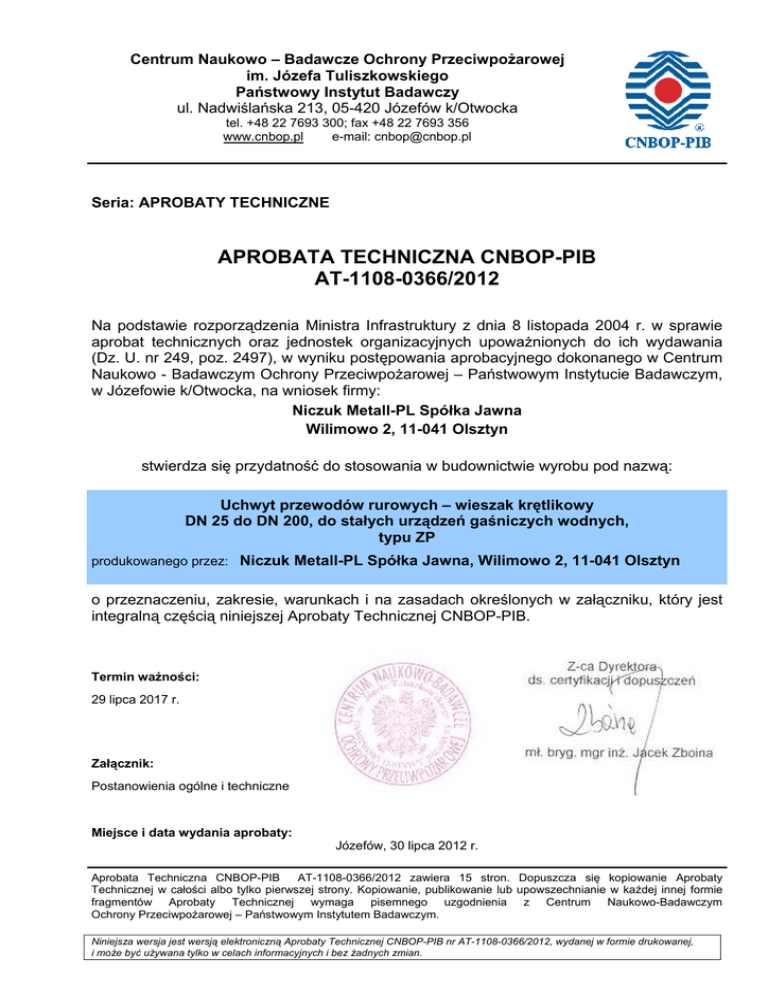 Centrum Naukowo – Badawcze Ochrony Przeciwpożarowej im. Józefa Tuliszkowskiego Państwowy Instytut Badawczy ul. Nadwiślańska 213, 05-420 Józefów k/Otwocka tel. +48 22 7693 300; fax +48 22 7693 356 e-mail: [email protected] www.cnbop.pl Seria: APROBATY TECHNICZNE APROBATA TECHNICZNA CNBOP-PIB AT-1108-0366/2012 Na podstawie rozporządzenia Ministra Infrastruktury z dnia 8 listopada 2004 r. w sprawie aprobat technicznych oraz jednostek organizacyjnych upoważnionych do ich wydawania (Dz. U. nr 249, poz. 2497), w wyniku postępowania aprobacyjnego dokonanego w Centrum Naukowo - Badawczym Ochrony Przeciwpożarowej – Państwowym Instytucie Badawczym, w Józefowie k/Otwocka, na wniosek firmy: Niczuk Metall-PL Spółka Jawna Wilimowo 2, 11-041 Olsztyn stwierdza się przydatność do stosowania w budownictwie wyrobu pod nazwą: Uchwyt przewodów rurowych – wieszak krętlikowy DN 25 do DN 200, do stałych urządzeń gaśniczych wodnych, typu ZP produkowanego przez: Niczuk Metall-PL Spółka Jawna, Wilimowo 2, 11-041 Olsztyn o przeznaczeniu, zakresie, warunkach i na zasadach określonych w załączniku, który jest integralną częścią niniejszej Aprobaty Technicznej CNBOP-PIB. Z-ca Dyrektora ds. certyfikacji i dopuszczeń Termin ważności: 29 lipca 2017 r. mł. bryg. mgr inż. Jacek Zboina Załącznik: Postanowienia ogólne i techniczne Miejsce i data wydania aprobaty: Józefów, 30 lipca 2012 r. Aprobata Techniczna CNBOP-PIB AT-1108-0366/2012 zawiera 15 stron. Dopuszcza się kopiowanie Aprobaty Technicznej w całości albo tylko pierwszej strony. Kopiowanie, publikowanie lub upowszechnianie w każdej innej formie fragmentów Aprobaty Technicznej wymaga pisemnego uzgodnienia z Centrum Naukowo-Badawczym Ochrony Przeciwpożarowej – Państwowym Instytutem Badawczym. Niniejsza wersja jest wersją elektroniczną Aprobaty Technicznej CNBOP-PIB nr AT-1108-0366/2012, wydanej w formie drukowanej, i może być używana tylko w celach informacyjnych i bez żadnych zmian. CNBOP-PIB AT-1108-0366/2012 z dnia 30 lipca 2012 r. Strona 2/15 ZAŁĄCZNIK POSTANOWIENIA OGÓLNE I TECHNICZNE SPIS TREŚCI 1 1.1 1.2 1.3 PRZEDMIOT APROBATY Ogólna charakterystyka techniczna wyrobu Nazwa zakładu produkcyjnego i jego adres Podział i oznaczenie 2 2.1 2.2 PRZEZNACZENIE, ZAKRES I WARUNKI STOSOWANIA Przeznaczenie Zakres i warunki stosowania 3 3.1 3.2 3.3 3.4 WŁAŚCIWOŚCI TECHNICZNE / WYMAGANIA Konstrukcja Materiały Właściwości techniczno-użytkowe Znakowanie 4 4.1 4.2 4.3 PAKOWANIE, PRZECHOWYWANIE I TRANSPORT Pakowanie Przechowywanie Transport 5 5.1 5.2 5.3 5.4 5.5 5.6 5.7 OCENA ZGODNOŚCI Zasady ogólne Zakładowa kontrola produkcji (ZKP) Wstępne badanie typu Badania gotowych wyrobów Metody badań Pobieranie próbek do badań Ocena wyników badań 6 USTALENIA FORMALNE 7 TERMIN WAŻNOŚCI INFORMACJE DODATKOWE RYSUNKI Niniejsza wersja jest wersją elektroniczną Aprobaty Technicznej CNBOP-PIB nr AT-1108-0366/2012, wydanej w formie drukowanej, i może być używana tylko w celach informacyjnych i bez żadnych zmian. CNBOP-PIB AT-1108-0366/2012 z dnia 30 lipca 2012 r. 1 PRZEDMIOT APROBATY 1.1 Ogólna charakterystyka techniczna wyrobu Strona 3/15 Przedmiotem niniejszej Aprobaty Technicznej CNBOP-PIB jest uchwyt przewodów rurowych – wieszak krętlikowy typu ZP, przeznaczony do mocowania przewodów rurowych stałych urządzeń gaśniczych wodnych o średnicy nominalnej DN 25 do DN 200. Uchwyt typu ZP składa się z wieszaka, zapinki oraz pręta gwintowanego z nakrętkami (mocującą i zabezpieczającą) i podkładką. Zapinka i wieszak (w górnej jego części) są odpowiednio ukształtowane tworząc rodzaj zamka. Otwory w wieszaku (w górnej części) i w zapince umożliwiają przełożenie pręta gwintowanego i połączenie wieszaka i zapinki za pomocą dwóch nakrętek i podkładki. Regulacja położenia wieszaka (w pionie) i jego połączenie z elementem/konstrukcją nośną następuje za pomocą pręta, nakrętek i podkładki jw. Wygląd uchwytu przedstawiono na rys.1. 1.2 Nazwa zakładu produkcyjnego i jego adres Niczuk Metall-PL Spółka Jawna, Wilimowo 2, 11-041 Olsztyn. 1.3 Podział i oznaczenie 1.3.1 Podział Uchwyt typu ZP jest produkowany w wielkościach odpowiadających średnicy nominalnej przewodów rurowych, do których mocowania jest przeznaczony. W tablicy 1 podano symbole uchwytu w zależności od wielkości uchwytu oraz wielkości gwintu pręta i nakrętek, stosowane przez producenta. Tablica 1 Znakowanie uchwytu Oznaczenie katalogowe DN przewodu rurowego Wielkość gwintu pręta i nakrętek (zakres średnicy zewnętrznej d*, mm) ZP 1’’ ZP-M8-1’’ DN 25 (34-35) ZP 1 1/4’’ ZP-M8-1 1/4’’ DN 32 (42-45) ZP 1 1/2’’ ZP-M8-1 1/2’’ DN 40 (48-51) ZP 2’’ ZP-M8-2’’ DN 50 (57-64) ZP 1’’ ZP-M10-1’’ DN 25 (34-35) ZP 1 1/4’’ ZP-M10-1 1/4’’ DN 32 (42-45) ZP 1 1/2’’ ZP-M10-1 1/2’’ DN 40 (48-51) ZP 2’’ ZP-M10-2’’ DN 50 M8 M8 M8 M8 M10 M10 M10 M10 (57-64) Niniejsza wersja jest wersją elektroniczną Aprobaty Technicznej CNBOP-PIB nr AT-1108-0366/2012, wydanej w formie drukowanej, i może być używana tylko w celach informacyjnych i bez żadnych zmian. CNBOP-PIB AT-1108-0366/2012 z dnia 30 lipca 2012 r. Znakowanie uchwytu Oznaczenie katalogowe DN przewodu rurowego Strona 4/15 Wielkość gwintu pręta i nakrętek (zakres średnicy zewnętrznej d*, mm) ZP 2 ½’’ ZP-M10-2 1/2’’ DN 65 (70-76) ZP 3’’ ZP-M10-3’’ DN 80 (83-89) ZP 3 1/2’’ ZP-M10-3 1/2’’ ZP 4’’ ZP-M10-4’’ (97-102) DN 100 (108-114) ZP 133 ZP-M12-133 (133 mm) ZP 5’’ ZP-M12-5’’ DN 125 (140) ZP 159 ZP-M12-159 ZP 6’’ ZP-M12-6’’ (159) DN 150 (165-168) ZP 8’’ ZP-M16-8’’ DN 200 (219) M10 M10 M10 M10 M 12 M 12 M 12 M 12 M 16 *Patrz rys. 2. 1.3.2 1.3.2.1 Oznaczenie Sposób budowy oznaczenia Oznaczenie uchwytu składa się z: • nazwy uchwytu; • oznaczenia katalogowego uchwytu wg tablicy 1. 1.3.2.2 Przykład oznaczenia a) uchwytu do moco