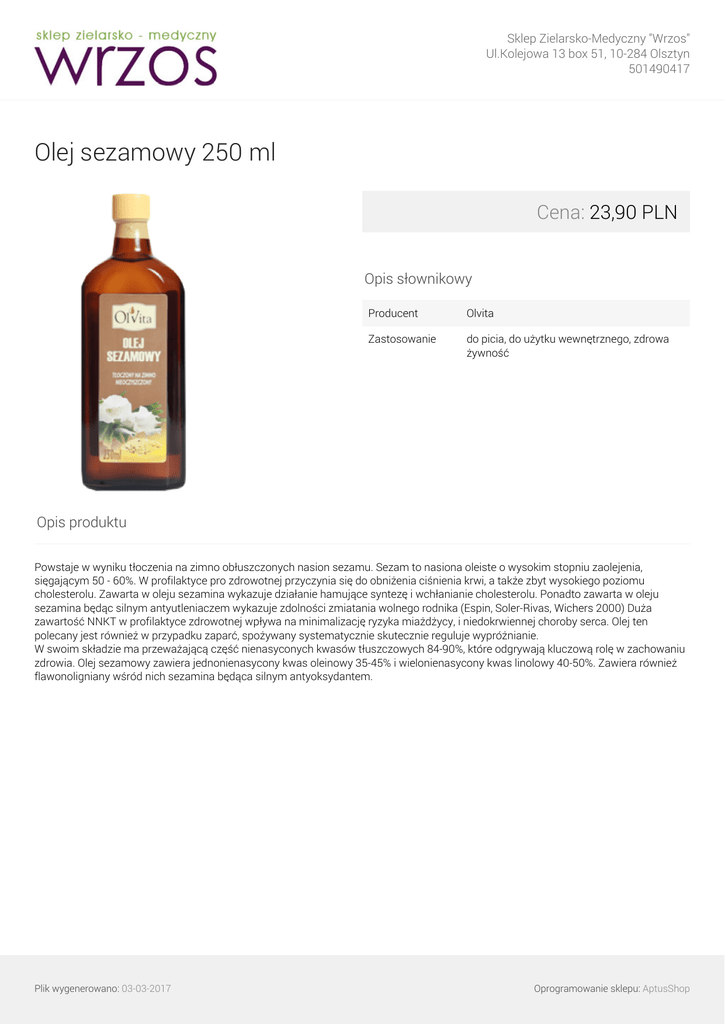 Sklep Zielarsko-Medyczny "Wrzos" Ul.Kolejowa 13 box 51, 10-284 Olsztyn 501490417 Olej sezamowy 250 ml Cena: 23,90 PLN Opis słownikowy Producent Olvita Zastosowanie do picia, do użytku wewnętrznego, zdrowa żywność Opis produktu Powstaje w wyniku tłoczenia na zimno obłuszczonych nasion sezamu. Sezam to nasiona oleiste o wysokim stopniu zaolejenia, sięgającym 50 - 60%. W profilaktyce pro zdrowotnej przyczynia się do obniżenia ciśnienia krwi, a także zbyt wysokiego poziomu cholesterolu. Zawarta w oleju sezamina wykazuje działanie hamujące syntezę i wchłanianie cholesterolu. Ponadto zawarta w oleju sezamina będąc silnym antyutleniaczem wykazuje zdolności zmiatania wolnego rodnika (Espin, Soler-Rivas, Wichers 2000) Duża zawartość NNKT w profilaktyce zdrowotnej wpływa na minimalizację ryzyka miażdżycy, i niedokrwiennej choroby serca. Olej ten polecany jest również w przypadku zaparć, spożywany systematycznie skutecznie reguluje wypróżnianie. W swoim składzie ma przeważającą część nienasyconych kwasów tłuszczowych 84-90%, które odgrywają kluczową rolę w zachowaniu zdrowia. Olej sezamowy zawiera jednonienasycony kwas oleinowy 35-45% i wielonienasycony kwas linolowy 40-50%. Zawiera również flawonoligniany wśród nich sezamina będąca silnym antyoksydantem. Plik wygenerowano: 03-03-2017 Powered by TCPDF (www.tcpdf.org) Oprogramowanie sklepu: AptusShop