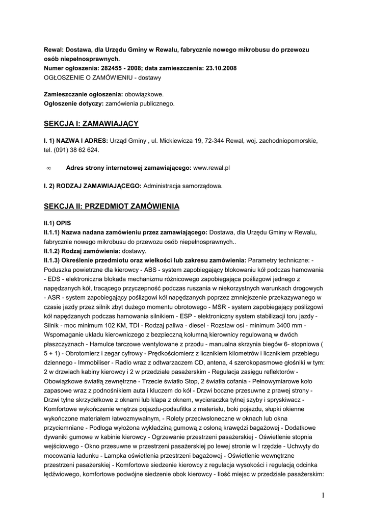 Rewal: Dostawa, dla Urzędu Gminy w Rewalu, fabrycznie nowego mikrobusu do przewozu osób niepełnosprawnych. Numer ogłoszenia: 282455 - 2008; data zamieszczenia: 23.10.2008 OGŁOSZENIE O ZAMÓWIENIU - dostawy Zamieszczanie ogłoszenia: obowiązkowe. Ogłoszenie dotyczy: zamówienia publicznego. SEKCJA I: ZAMAWIAJĄCY I. 1) NAZWA I ADRES: Urząd Gminy , ul. Mickiewicza 19, 72-344 Rewal, woj. zachodniopomorskie, tel. (091) 38 62 624. • Adres strony internetowej zamawiającego: www.rewal.pl I. 2) RODZAJ ZAMAWIAJĄCEGO: Administracja samorządowa. SEKCJA II: PRZEDMIOT ZAMÓWIENIA II.1) OPIS II.1.1) Nazwa nadana zamówieniu przez zamawiającego: Dostawa, dla Urzędu Gminy w Rewalu, fabrycznie nowego mikrobusu do przewozu osób niepełnosprawnych.. II.1.2) Rodzaj zamówienia: dostawy. II.1.3) Określenie przedmiotu oraz wielkości lub zakresu zamówienia: Parametry techniczne: Poduszka powietrzne dla kierowcy - ABS - system zapobiegający blokowaniu kół podczas hamowania - EDS - elektroniczna blokada mechanizmu róŜnicowego zapobiegająca poślizgowi jednego z napędzanych kół, tracącego przyczepność podczas ruszania w niekorzystnych warunkach drogowych - ASR - system zapobiegający poślizgowi kół napędzanych poprzez zmniejszenie przekazywanego w czasie jazdy przez silnik zbyt duŜego momentu obrotowego - MSR - system zapobiegający poślizgowi kół napędzanych podczas hamowania silnikiem - ESP - elektroniczny system stabilizacji toru jazdy Silnik - moc minimum 102 KM, TDI - Rodzaj paliwa - diesel - Rozstaw osi - minimum 3400 mm Wspomaganie układu kierowniczego z bezpieczną kolumną kierownicy regulowaną w dwóch płaszczyznach - Hamulce tarczowe wentylowane z przodu - manualna skrzynia biegów 6- stopniowa ( 5 + 1) - Obrotomierz i zegar cyfrowy - Prędkościomierz z licznikiem kilometrów i licznikiem przebiegu dziennego - Immobiliser - Radio wraz z odtwarzaczem CD, antena, 4 szerokopasmowe głośniki w tym: 2 w drzwiach kabiny kierowcy i 2 w przedziale pasaŜerskim - Regulacja zasięgu reflektorów Obowiązkowe światłą zewnętrzne - Trzecie światło Stop, 2 światła cofania - Pełnowymiarowe koło zapasowe wraz z podnośnikiem auta i kluczem do kół - Drzwi boczne przesuwne z prawej strony Drzwi tylne skrzydełkowe z oknami lub klapa z oknem, wycieraczka tylnej szyby i spryskiwacz Komfortowe wykończenie wnętrza pojazdu-podsufitka z materiału, boki pojazdu, słupki okienne wykończone materiałem łatwozmywalnym, - Rolety przeciwsłoneczne w oknach lub okna przyciemniane - Podłoga wyłoŜona wykładziną gumową z osłoną krawędzi bagaŜowej - Dodatkowe dywaniki gumowe w kabinie kierowcy - Ogrzewanie przestrzeni pasaŜerskiej - Oświetlenie stopnia wejściowego - Okno przesuwne w przestrzeni pasaŜerskiej po lewej stronie w I rzędzie - Uchwyty do mocowania ładunku - Lampka oświetlenia przestrzeni bagaŜowej - Oświetlenie wewnętrzne przestrzeni pasaŜerskiej - Komfortowe siedzenie kierowcy z regulacja wysokości i regulacją odcinka lędźwiowego, komfortowe podwójne siedzenie obok kierowcy - Ilość miejsc w przedziale pasaŜerskim: 1 siedem komfortowych pojedynczych lub zintegrowanych (dwa lub trzy miejsca) siedzeń. - Mocowania do fotelików dziecięcych w siedzeniach w I rzędzie - Centralny zamek zdalnie sterowany - Autoalarm Elektrycznie sterowane szyby przednie - Elektrycznie regulowane i ogrzewane lusterka zewnętrzne Światła przeciwmgielne z przodu - Klimatyzacja dla przedziału kierowcy - Ściany w części pasaŜerskiej kabiny muszą być w całości przeszklone (okna) - Osłony przeciwsłoneczne z lusterkami make-up - Dwutonowy sygnał dźwiękowy - Oświetlenie kabiny kierowcy i 2 lampki do czytania Uchwyt wejściowy na słupku po prawej stronie - Regulowane podświetlenie tablicy rozdzielczej - Kolor - granatowy lub niebieski, lub zielony lub, bordowy - Hak holowniczy (do holowania przyczep), Komplet opon letnich ze stalowymi felgami (zamontowany na mikrobusie) oraz - Dodatkowy komplet opon zimowych ze stalowymi felgami Przystosowanie do przewozu osoby niepełnosprawnej na wózku inwalidzkim: a) szyny zaczepowe w podłodze b) jeden komplet pasów zaczepowych do mocowania wózka inwalidzkiego w szynach c) biodrowe pasy bezpieczeństwa dla osoby na wózku inwalidzkim d) pojemnik do przewozu pasów e) wyłoŜenie podłogi w przedziale pasaŜerskim gumową wykładziną antypoślizgową f) nakładka ochronna progu g) oznaczenie samochodu przystosowanego do przewozu osób niepełnosprawnych h) aluminiowe podjazdy z powłoka antypoślizgową umoŜliwiające ręczne wprowadzenie wózka z tyłu pojazdu Gwarancja na silnik i podzespoły - minimum 2 lata bez limitu kilometrów, gwarancja na perforację nadwozia minimum 12 lat i na lakier minimum 3 lata. Komplet dokumentów niezbędnych do rejestracji. Dostawa do 19.12.2008 r. loco Urząd Gminy Rewalu. Postawione warunki, które musi spełniać mikrobus, zostały uwarunkowane przez wymagania określone w Programie wyrównywania róŜnic między regionami - obszar D (likwidacja barier transportowych) Państwowego Funduszu Rehabilitacji osób niepełnosprawnych (http://www.pfron.org.pl/). Dostawa do 19.12.2008 r. - loco Urząd Gminy Rewalu.. II.1.4) Wspólny Słownik Zamówień (CPV): 34.11.52.00-8. II.1.5) Czy dopuszcza się złoŜenie oferty częściowej: Nie. II.1.6) Czy dopuszcza się złoŜenie oferty wariantowej: Nie. II.2) CZAS TRWANIA ZAMÓWIENIA LUB TERMIN WYKONANIA: Zakończenie: 19.12.2008. SEKCJA III: INFORMACJE O CHARAKTERZE PRAWNYM, EKONOMICZNYM, FINANSOWYM I TECHNICZNYM III.1) WARUNKI DOTYCZĄCE ZAMÓWIENIA Informacja na temat wadium: nie wmyaga się wniesienia III.2) WARUNKI UDZIAŁU • Opis warunków udziału w postępowaniu oraz opis sposobu dokonywania oceny spełniania tych warunków: Sytuacja podmiotowa wykonawcy Wykonawca posiada uprawnienie do wykonywania określonej działalności lub czynności oraz nie podlega wykluczeniu na • podstawie art. 24 ustawy z dnia 29 stycznia 2004