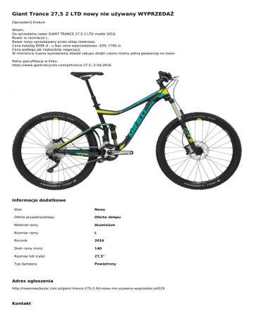 Giant Trance 27,5 2 LTD nowy nie używany WYPRZEDAŻ [Sprzedam] Enduro Witam, Do sprzedania rower GIANT TRANCE 27,5 2 LTD model 2016. Rower w rozmiarze L. Rower nowy sprzedawany przez sklep rowerowy. Cena katalog 9599 zł - u Nas cena wyprzedażowa -20% 7700 zł. Cena podlega jak najbardziej negocjacji. W momencie kupna wystawiamy dowód zakupu dzięki czemu mamy pełną gwarancję na rower. Pełna specyfikacja w linku: https://www.giant-bicycles.com/pl/trance-27.5--2-ltd-2016 Informacje dodatkowe Stan Nowy Oferta prywatna/sklepu Oferta sklepu Materiał ramy Aluminium Rozmiar ramy L Rocznik 2016 Skok ramy (mm) 140 Rozmiar kół (cale) 27,5" Typ dampera Powietrzny Adres ogłoszenia http://rowerowybazar.com.pl/giant-trance-275-2-ltd-nowy-nie-uzywany-wyprzedaz,o4319 Kontakt Mail: [email protected] Telefon: 606146749 Lokalizacja Krzycka 90G, Wrocław Dolnośląskie (Polska) Ogłoszenie dodano: 2016-08-26 16:18:05 Ogłoszenie wygasa: 2017-05-24 16:18:05 Powered by TCPDF (www.tcpdf.org)