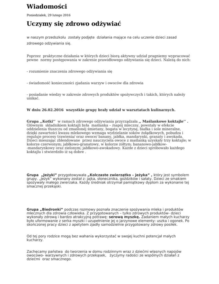 Wiadomości Poniedziałek, 29 lutego 2016 Uczymy się zdrowo odżywiać w naszym przedszkolu zostały podjęte działania mające na celu uczenie dzieci zasad zdrowego odżywiania się. Poprzez praktyczne działania w których dzieci biorą aktywny udział pragniemy wypracować pewne normy postępowania w zakresie prawidłowego odżywiania się dzieci. Należą do nich: - rozumienie znaczenia zdrowego odżywiania się - świadomość konieczności zjadania warzyw i owoców dla zdrowia - posiadanie wiedzy w zakresie zdrowych produktów spożywczych i takich, których należy unikać. W dniu 26.02.2016 wszystkie grupy brały udział w warsztatach kulinarnych. Grupa ,,Kotki’’ w ramach zdrowego odżywiania przyrządzała ,, Maślankowe koktajle’’ . Głównym składnikiem koktajli była maślanka – /napój mleczny, powstały w efekcie oddzielenia tłuszczu od zmaślonej śmietany, bogata w lecytynę, białka i sole mineralne, dzięki zawartości kwasu mlekowego wzmaga wydzielanie soków żołądkowych, pobudza i reguluje procesy trawienia/ oraz owoce/ banany, jabłka, mandarynki, granaty i awokada. Dzieci mieszając zblendowane przez nauczyciela owoce z maślanką uzyskały trzy koktajle; w kolorze czerwonym; jabłkowo-granatowy, w kolorze żółtym; bananowo-jabłkow-mandarynkowy oraz zielonym; jabłkowo-awokadowy. Każde z dzieci spróbowało każdego koktajlu i stwierdziło iż są dobre . Grupa „Jeżyki” przygotowywała „Kolczaste zwierzątko – jeżyka” , który jest symbolem grupy. „Jeżyk” wykonany został z: jajka, słonecznika, goździków i sałaty. Dzieci ze smakiem spożywały małego zwierzaka. Każdy średniak otrzymał pamiątkowy dyplom za wykonanie tej smacznej przekąski. Grupa „Biedronki” podczas rozmowy poznała znaczenie spożywania mleka i produktów mlecznych dla zdrowia człowieka. Z przygotowanych – tylko zdrowych produktów- dzieci wykonały zdrową i bardzo atrakcyjną potrawę: serową myszkę. Zadaniem małych kucharzy było uformowanie z serka myszki i uzupełnienie jej o jarzynowe elementy: uszka i ogonek. Po skończonej pracy dzieci z apetytem zjadły samodzielnie przygotowany zdrowy posiłek. Od tej pory rodzice mogą bez wahania wykorzystać w swojej kuchni potencjał małych kucharzy. Zachęcamy państwa do tworzenia w domu rodzinnym wraz z dziećmi własnych napojów owocowo- warzywnych i zdrowych przekąsek, życzymy radości ze wspólnych działań z dziećmi oraz smacznego.