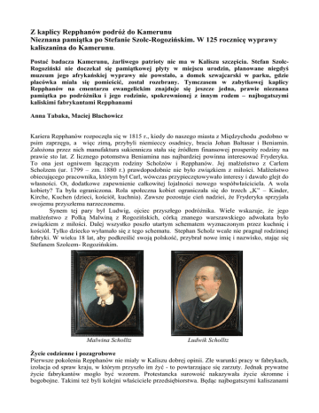 Z kaplicy Repphanów podróż do Kamerunu Nieznana pamiątka po Stefanie Szolc-Rogozińskim. W 125 rocznicę wyprawy kaliszanina do Kamerunu. Postać badacza Kamerunu, żarliwego patrioty nie ma w Kaliszu szczęścia. Stefan SzolcRogoziński nie doczekał się pamiątkowej płyty w miejscu urodzin, planowane niegdyś muzeum jego afrykańskiej wyprawy nie powstało, a domek szwajcarski w parku, gdzie placówka miała się pomieścić, został rozebrany. Tymczasem w zabytkowej kaplicy Repphanów na cmentarzu ewangelickim znajduje się jeszcze jedna, prawie nieznana pamiątka po podróżniku i jego rodzinie, spokrewnionej z innym rodem – najbogatszymi kaliskimi fabrykantami Repphanami Anna Tabaka, Maciej Błachowicz Kariera Repphanów rozpoczęła się w 1815 r., kiedy do naszego miasta z Międzychodu ,podobno w psim zaprzęgu, a więc zimą, przybyli niemieccy osadnicy, bracia Johan Baltasar i Beniamin. Założona przez nich manufaktura sukiennicza stała się źródłem finansowej prosperity rodziny na prawie sto lat. Z licznego potomstwa Beniamina nas najbardziej powinna interesować Fryderyka. To ona jest ogniwem łączącym rodziny Scholzów i Repphanów. Jej małżeństwo z Carlem Scholzem (ur. 1799 – zm. 1880 r.) prawdopodobnie nie było związkiem z miłości. Małżeństwo obiecującego pracownika, którym był Carl, wówczas przypieczętowywało interesy i dawało glejt do własności. Ot, dodatkowe zapewnienie całkowitej lojalności nowego współwłaściciela. A wola kobiety? Ta była ograniczona. Rola społeczna kobiet ograniczała się do trzech „K” – Kinder, Kirche, Kuchen (dzieci, kościół, kuchnia). Zawsze pozostaje cień nadziei, że Fryderyka sprzyjała swojemu przyszłemu narzeczonemu. Synem tej pary był Ludwig, ojciec przyszłego podróżnika. Wiele wskazuje, że jego małżeństwo z Polką Malwiną z Rogozińskich, córką znanego warszawskiego adwokata było związkiem z miłości. Dalej wszystko poszło utartym schematem wyznaczonym przez kuchnię i kościół. Tylko dziecko wyłamało się z tego schematu. Stephan Scholz wcale nie pragnął rodzinnej fabryki. W wieku 18 lat, aby podkreślić swoją polskość, przybrał nowe imię i nazwisko, stając się Stefanem Szolcem- Rogozińskim. Malwina Scholltz Ludwik Scholltz Życie codzienne i pozagrobowe Pierwsze pokolenia Repphanów nie miały w Kaliszu dobrej opinii. Złe warunki pracy w fabrykach, izolacja od spraw kraju, w którym przyszło im żyć - to powtarzające się zarzuty. Jednak prywatne życie fabrykantów mogło być wzorem. Protestancka surowość nakazywała życie skromne i bogobojne. Takimi też byli kolejni właściciele przedsiębiorstwa. Będąc najbogatszymi kaliszanami epoki, Repphanowie nie zbudowali wspaniałej rezydencji. Mieszkali w skromnym domu przy fabryce (obecnie plac Kilińskiego). Jedyny luksus, na jaki pozwoliła sobie familia, dotyczył umarłych. Około 1880 r. rodzinny grobowiec przebudowano na wspaniałą kaplicę grobową, kryjącą prochy kolejnych właścicieli. Do dzisiaj jest to najwspanialsza kaplica grobowa Kalisza, mimo że już jej nie przykrywa wielka kopuła. Do odległej przeszłości należy bogate wyposażenie wnętrza. Nawet o tym, że kaplica jest miejscem pochówku bliskich podróżnika dowiedzieliśmy się stosunkowo niedawno. Podczas prowadzonych parę lat temu prac remontowych światło dzienne ujrzały tablice epitafijne Repphanów. Wśród licznych tablic znalazły się również upamiętniające dziadków i rodziców podróżnika. Ostatnie oględziny podziemi ujawniły, że nie jest to pochówek symboliczny. Wśród wspaniałych cynowych sarkofagów z pewnością znajdują się również trumny Carla, Fryderyki, Ludwiga i Malwiny. Sama wartość artystyczna XIX wiecznych sarkofagów czyni te zabytki wyjątkowymi w kraju. Jedno jest pewne: nieznana pamiątka po wielkim Polaku – ewangeliku zasługuje na większy szacunek. Stan ogólny kaplicy i epitafiów nie jest zły, ale też nie przynosi chluby naszemu miastu. Właściciel parafia ewangelicka w Kaliszu w miarę swoich skromnych możliwości dba o czystość i chętnie udostępnia obiekt zwiedzającym. Na kaplicę przeznaczono także część środków ze społecznej kwesty, w tym roku po raz siódmy przeprowadzonej na rzecz ratowania zabytkowych cmentarzy (w październiku rozpoczęły się prace przy ogrodzeniu kaplicy). Czy w 125 rocznicę wyprawy Szolca do Kamerunu znajdzie się sponsor, który wspomoże renowację tablic? Epitafia umieszczone w pilastrach upamiętniają dziadków i rodziców podróżnika. Dziwne losy. Zawiłe dzieje naszego narodu nie zawsze szły prostą drogą. Pierwsi Repphanowie czuli się głęboko związani z kulturą niemiecką. Czy można czynić im z tego zarzut? Przecież jesteśmy dumni z tego, że Polacy na obczyźnie utrzymują polskie tradycje i polski styl życia. Nie można też zapomnieć, że ostatni z Repphanów, jak Paweł, czuli się Polakami. Emil ufundował przy ulicy Polnej szkołę jeszcze niekiedy nazywaną Repphanówką. Szkoda, że tę tradycję zakryła nowa patronka Maria Dąbrowska. A przecież Ludwik Ceglarski z „Nocy i dni” to nikt inny jak Ludwik Scholz. Podczas II wojny światowej rodzina Repphanów była przedstawiana jako „szerzyciele niemieckiej kultury w morzu słowiańskiego barbarzyństwa”. Jednak autor tych tez, baron Gideon Ernst von Fockt zapomniał o polonizacji ostatnich pokoleń. Ostatnie badania dowodzą, że rodzina Repphanów mogła mieć żydowskie korzenie. Fatum nad rodziną? Rogoziński zginął 1 grudnia 1896 r. w Paryżu pod kołami konnego omnibusu. Miał tylko 35 lat. Równie tragiczne, według legendy, są losy jego braci. Obydwaj mieli się zakochać w jednej pannie, co doprowadziło do pojedynku. Jego zwycięzca nie zniósł śmierci brata i zastrzelił się. Może jednak opowieść przekazana przez Marię Dąbrowską nie miała tak tragicznego przebiegu? Umieszczone w kaplicy epitafia podają różne d