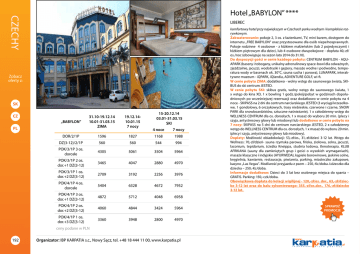 CZECHY Hotel „BABYLON” **** LIBEREC Zobacz oferty z: SK CZ 31.10-19.12.14 10.01-31.03.15 ZIMA 19.12.1410.01.15 7 nocy DOR/2/1P 1596 DZ(3-12)/2/1P „BABYLON” PL 15-20.12.14 03.01-31.03.15 SKI 4 noce 7 nocy 1827 1168 1988 560 560 544 994 POK/3/1P 3 os. dorosłe 4305 5061 3504 5964 POK/3/1P 2 os. dor.+1 DZ(3-12) 3465 4047 2880 4970 POK/3/1P 1 os. dor.+2 DZ(3-12) 2709 3192 2256 3976 POK/4/1P 4 os. dorosłe 5404 6328 4672 7952 POK/4/1P 3 os. dor.+1 DZ(3-12) 4872 5712 4048 6958 POK/4/1P 2 os. dor.+2 DZ(3-12) 4060 4844 3424 5964 POK/4/1P 1 os. dor.+3 DZ(3-12) 3360 3948 2800 4970 ceny podane w PLN 192 Organizator: IBP KARPATIA s.c., Nowy Sącz, tel. +48 18 444 11 00, www.karpatia.pl komfortowy hotel przy największym w Czechach parku wodnym i kompleksie rozrywkowym. Zakwaterowanie: pokoje 2, 3 os. z łazienkami, TV, mini barem, dostępem do internetu „FREE BABYLON” oraz przystosowane dla osób niepełnosprawnych. Pokoje rodzinne 4 osobowe - z łóżkiem małżeńskim (lub 2 pojedynczymi) i łóżkiem piętrowym dla dzieci, lub 4 osobowe dwupokojowe - dopłata 40,-zł/ os./noc (obowiązuje na sezon lato 2014 do 31.10). Do dyspozycji gości w cenie każdego pobytu: CENTRUM BABYLON - AQUAPARK (baseny i tobogany, unikalny adrenalinowy space-bowl dla odważnych, zjeżdżalnie, jacuzzi, wodotryski i gejzery, masaże wodne i podwodne, temperatura wody w basenach ok. 30°C, sauna sucha i parowa), LUNAPARK, interaktywne muzeum - iQPARK, iQlandia, ADVENTURE GOLF, wi-fi. W cenie pobytu ZIMA: dodatkowo - wolny wstęp do saunowego świata, SKIBUS do ski centrum JESTED. W cenie pobytu SKI: skibus gratis, wolny wstęp do saunowego świata, 1 x wstęp do kina XD, 1 x bowling 1 godz./pokój/pobyt w godzinach dopołudniowych po wcześniejszej rezerwacji oraz dodatkowo w cenie pobytu na 4 noce - SKIPASS na 2 dni do centrum narciarskiego JESTED (3 wyciągi krzesełkowe, 1 gondolowy, 6 orczykowych, trasy niebieskie, czerwone i czarne, SNOW PARK dla snowboardzistów, sztuczne naśnieżanie), 1 x całodzienny wstęp do WELLNESS CENTRUM dla os. dorosłych, 1 x masaż do wyboru 20 min. (plecy i szyja, antystresowy głowy lub miodowy) lub dodatkowo w cenie pobytu na 7 nocy: SKIPASS na 5 dni do centrum narciarskiego JESTED, 2 x całodzienny wstęp do WELLNESS CENTRUM dla os. dorosłych, 1 x masaż do wyboru 20 min. (plecy i szyja, antystresowy głowy lub miodowy). Dopłaty: Możliwość obiadokolacji: 53,-zł/os., 31,-zł/dzieci 3-12 lat. Wstęp do Wellness: 70,-zł/dzień- sauna rzymska parowa, fińska, ziołowa, solna, jacuzzi, laconium, tepidarium, ścieżka Kneippa, studnia lodowa, tlenoterapia. KLUB AFRIKANA (sauny dla zamkniętych grup i gości o wysokich wymaganiach), masaże klasyczne i indyjskie (AYURWEDA), kąpiele borowinowe, jaskinie solne, kręgielnia, kawiarnie, restauracje, piwiarnia, parking, miasteczko zakupowe, kasyno „Las Vegas”. Możliwość przyjazdu z psem – 250,-Kc/doba. Łóżeczko dla dziecka – 250,-Kc/doba. Informacje dodatkowe: Dzieci do 3 lat bez osobnego miejsca do spania – GRATIS. Parking: 150,-czk/doba. Obowiązkowa dopłata do kolacji wigilijnej - 120,-zł/os. dor., 63,-zł/dziecko 3-12 lat oraz do balu sylwestrowego: 355,-zł/os.dor., 176,-zł/dziecko 3-12 lat. SPRAWDŹ PROMOCJE CZECHY LIBEREC Zobacz oferty z: W Libercu odbywają się także międzynarodowe zawody w skokach narciarskich. Do Pragi ok. 100 km, do Harrachova ok. 40 km, pobliskie centra narciarskie to Jested i Bedrichov. 8,77 km tras zjazdowych obsługiwanych przez 2 kolejki i 7 wyciągów o łącznej przepustowości 3960 os./h. Sztuczne naśnieżanie tras na odcinku 5,5 km. SK Ośrodek narciarski Ještěd: kolejka kabinowa Hanychov – Ještěd, 2-osobowa kolejka krzesełkowa Hanychov - Černý vrch o długości 810 m i przepustowości 1190 os./h, najdłuższy wyciąg Skalka o długości 1500 m i przepustowości 450 os./h, 11 tras zjazdowych (7 czerwonych, 3 niebieskie i 1 czarna), skocznie narciarskie do skoków oraz kombinacji alpejskiej. - miasto położone w północnych Czechach w kotlinie libereckiej pomiędzy górami Izerskimi i pogórzem Jested. Liberec bywa nazywany miastem pod Jestedem, którego wierzchołek, osiągający wysokość 1012 metrów, zdobi nowoczesna wieża o oryginalnej konstrukcji. Atrakcją miasta jest aqua centrum BABYLON, ogród zoologiczny i botaniczny. CZ PL 191 Organizator: IBP KARPATIA s.c., Nowy Sącz, tel. +48 18 444 11 00, www.karpatia.pl Organizator: IBP „KARPATIA” s.c. Siedziba: ul. Barlickiego 15, 33-300 Nowy Sącz Biuro Obsługi Klienta: ul. Lwowska 47, Nowy Sącz Tel./fax.: (018) 444 11 00, 547 47 84 E-mail: [email protected] www.karpatia.pl Konto: ING Bank Śląski SA 63 1050 1722 1000 0090 7652 5295 Zezw. Wojewody Małopolskiego nr D/312/01/13/2004 SKRÓTY UŻYTE W OFERCIE DOR - osoba dorosła DOR/2 - osoba dorosła w pokoju 2-os. (lub ... osobowym) DOR/2/2P - osoba dorosła w pokoju 2-osobowym, śniadanie i obiadokolacja DOS - dostawka DOR/DOS - osoba dorosła na dostawce DOR/DOS/2P - osoba dorosła na dostawce, śniadanie i obiadokolacja DZ - dziecko DZ<3 ... - dziecko do lat 3 (lub ... lat) DZ(3-12) - dziecko od 3 do 12 lat DZ(3-12)/2P - dziecko 3-12 lat, śniadanie i obiadokolacja DZ(3-12)/DOS - dziecko 3-12 lat na dostawce DZ(3-12)/DOS/2P - dziecko 3-12 lat na dostawce, śniadanie i obiadokolacja 1P - śniadanie 2P - śniadanie i obiadokolacja 3P - śniadanie, obiad, kolacja 1, 2, 3, 4, ... - pokój 1-, 2-, 3-, 4-, lub ... -osobowy APT - apartament DOR/APT, DOR/APT4 - osoba dorosła w apartamencie, osoba w apartamencie 4-osobowym APT2, APT4, APT6, ... - apartament 2-, 4-, 6-osobowy BGW - bungalow